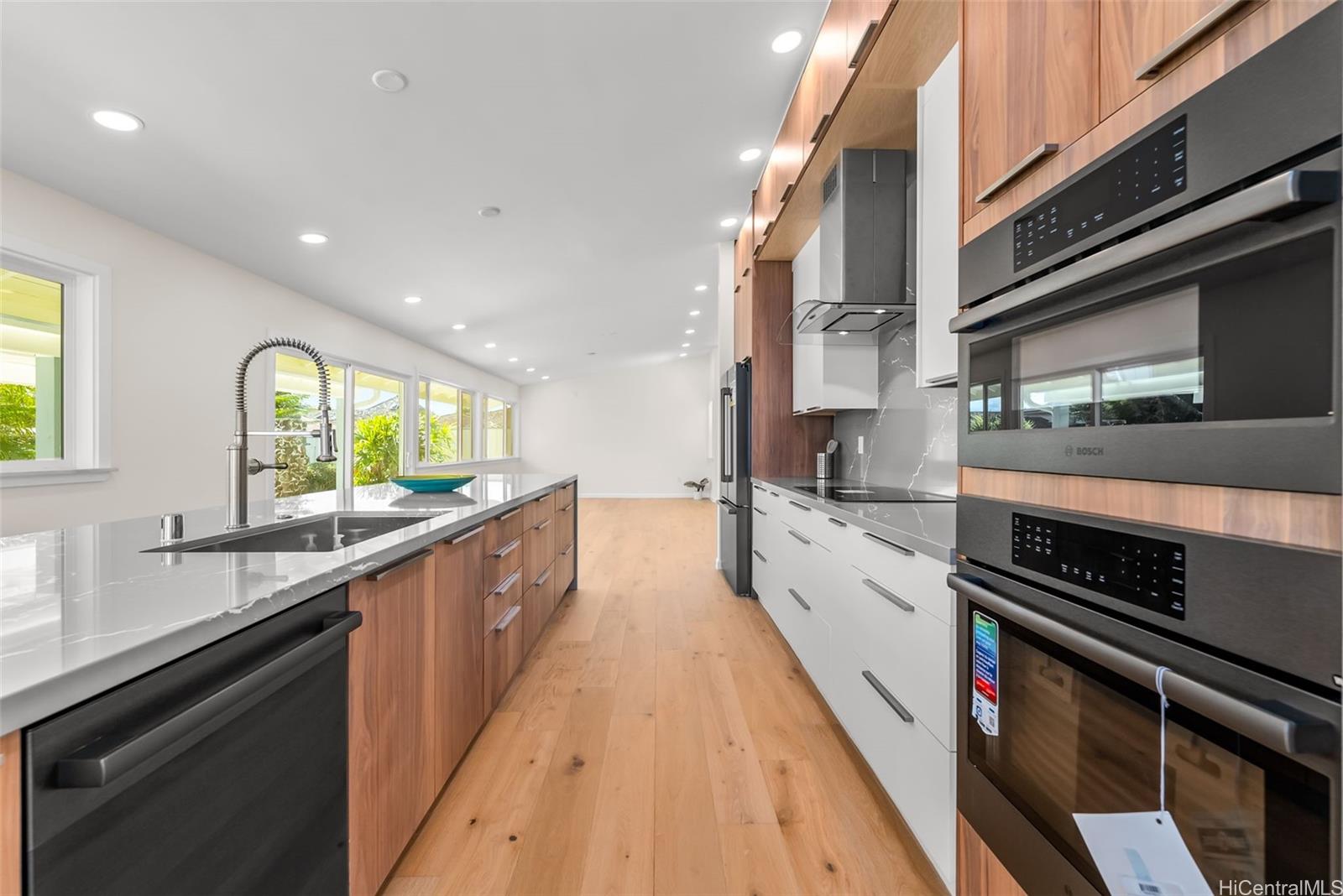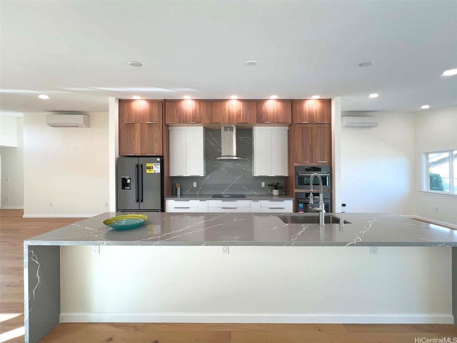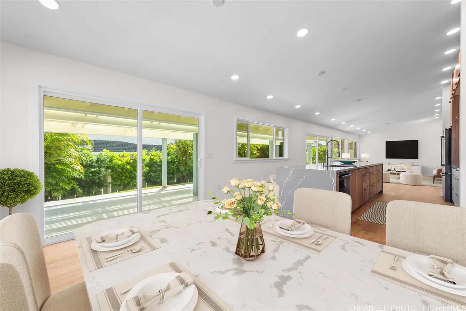 string(1067) "Nestled within the private/gated community of Waialae Iki V, this beautifully fully renovated single-level residence blends contemporary elegance with island living. Featuring three spacious bedrooms and three full bathrooms, this home offers a seamless blend of luxury, functionality, and comfort. Step inside to discover soaring ceilings and rich wood flooring that flows effortlessly throughout the open-concept living spaces. All bathrooms are finished with sleek porcelain tiles, Toto toilets, and frameless glass-enclosed showers, creating a spa-like experience in every suite. At the heart of the home is the designer kitchen outfitted with high-end, natural wood-faced cabinetry, a striking waterfall-style island, and brand-new luxury appliances. Enjoy an abundance of natural light thanks to strategically placed skylights and quality aluminum roof shingles that add both style and durability. The home is surrounded by tropical landscaping with an open lawn, covered lanai, and an expansive open deck—perfect for indoor-outdoor living and entertaining."