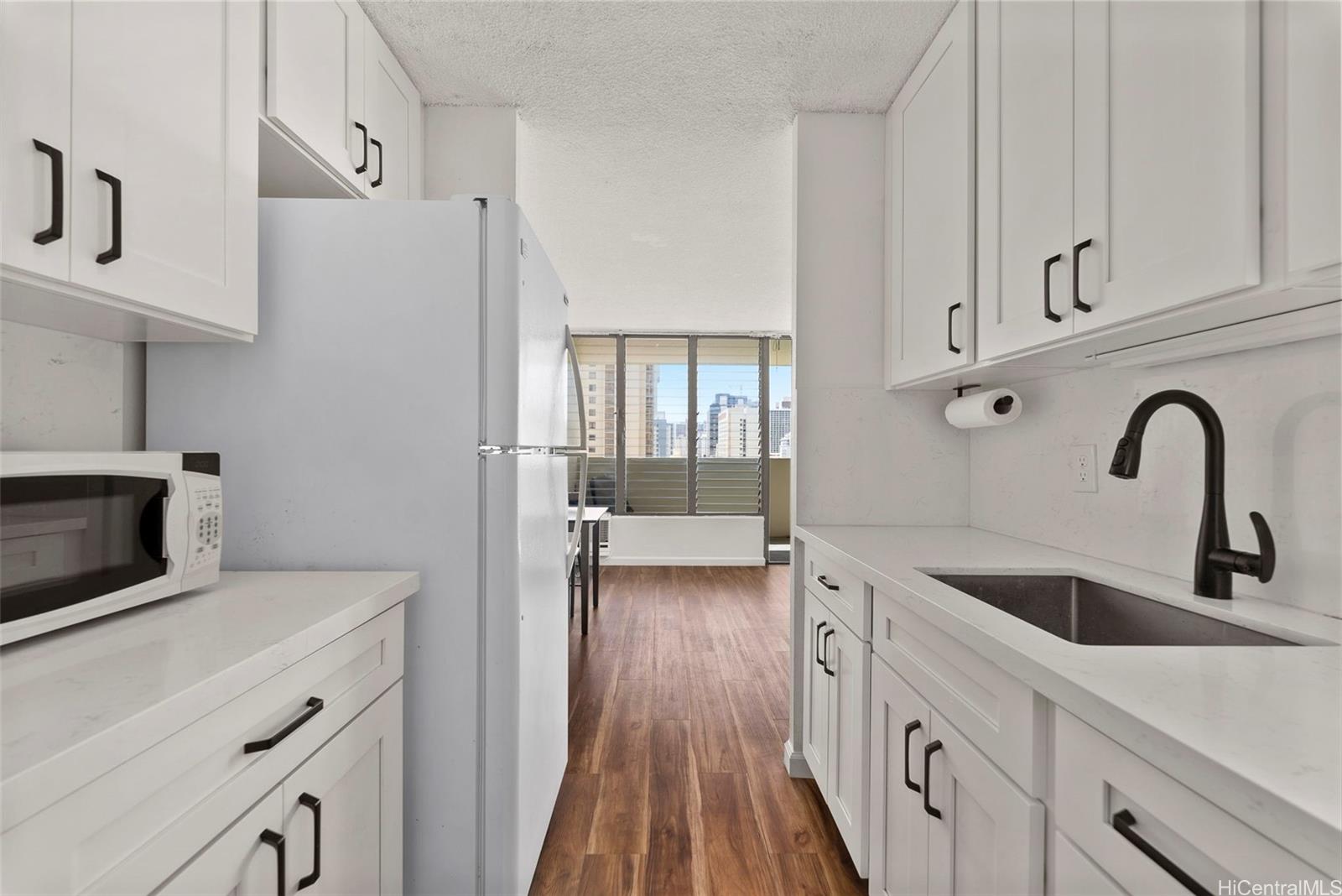 Welcome to La Casa, ideally situated in the vibrant Waikiki. This spacious 1-bed, 1-bath residence offers 559 sq ft of interior living plus a generous 104 sq ft lanai—perfect for enjoying morning coffee or evening breezes. Inside, you’ll find tasteful updates throughout: a modern kitchen, renovated bathroom, stylish vinyl flooring, new window screens, and the convenience of an in-unit washer/dryer. The east-facing orientation allows for natural light without the afternoon heat, complemented by cool trade winds and AC comfort. Enjoy sweeping city, mountain, and ocean views from your private lanai, and rest easy with secured, covered parking. Whether you’re looking for a full-time home or a convenient island retreat, this unit combines comfort, location, and value in the heart of Waikiki. Listing by: REMAX Hawaii (808) 379-7635