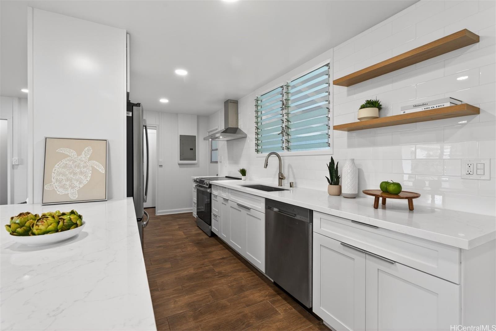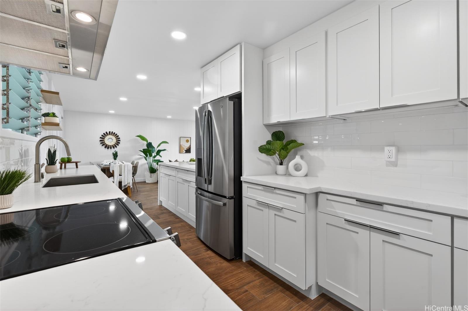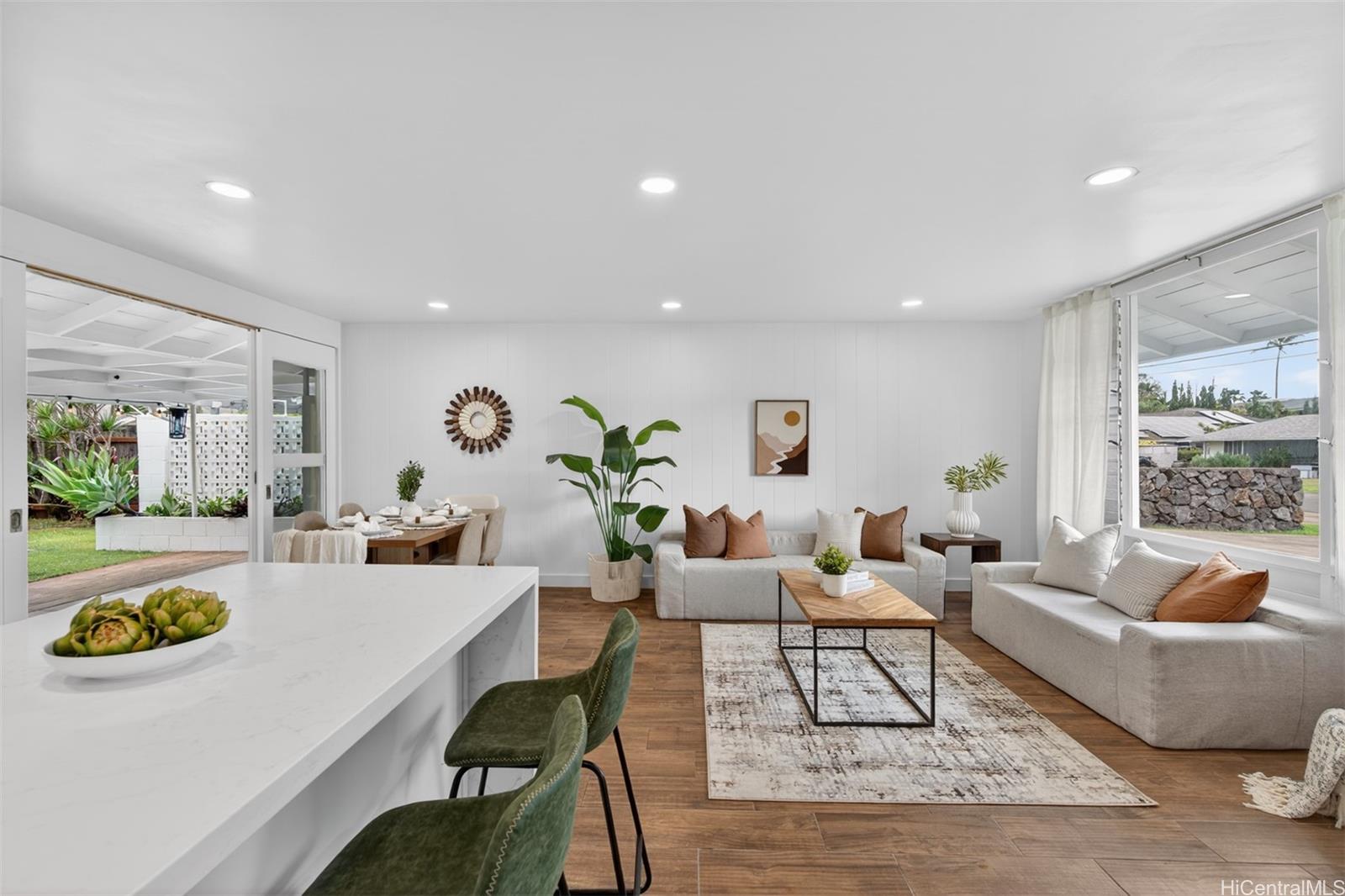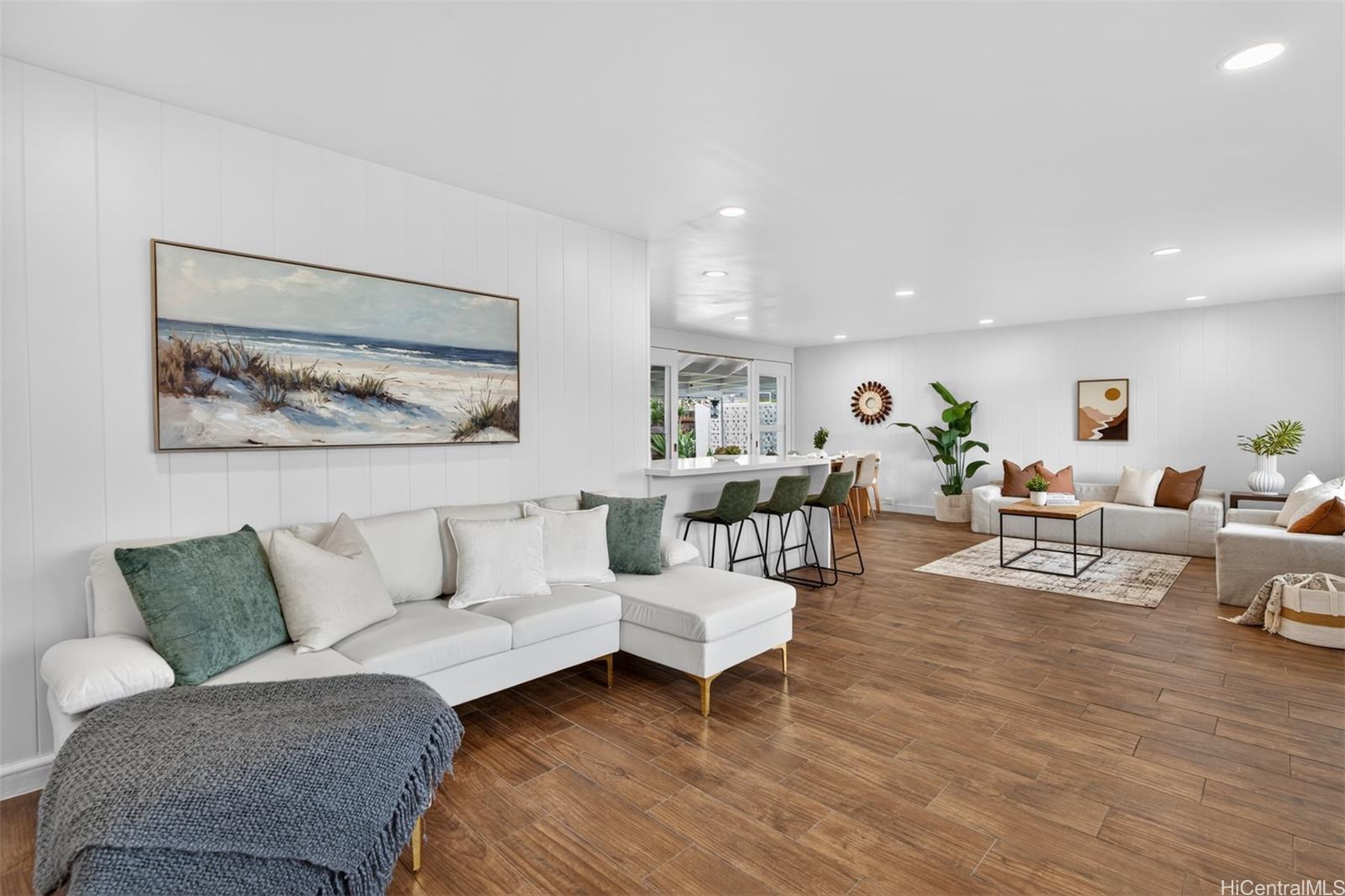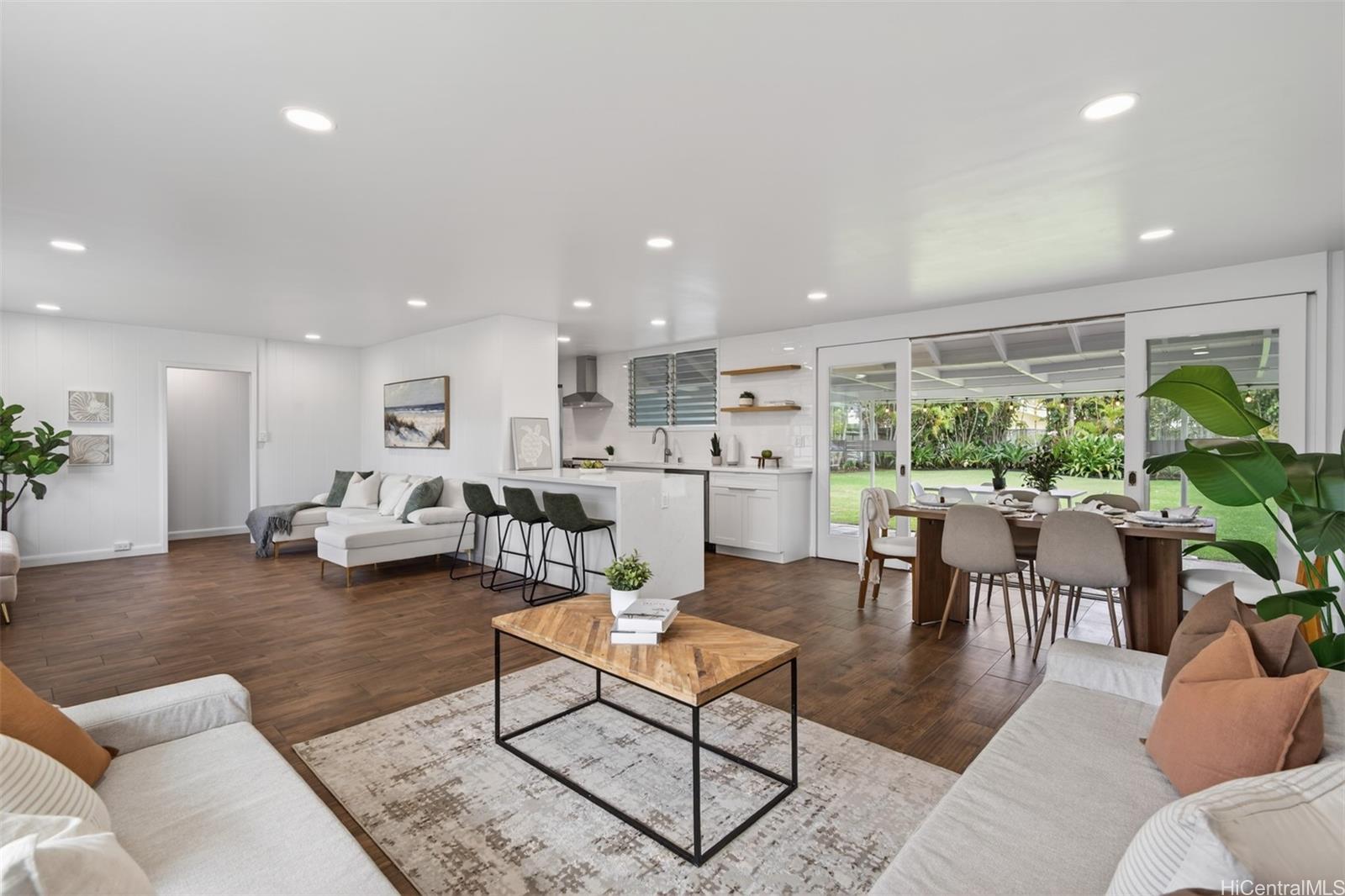 [0] => Step into effortless coastal living with this beautifully renovated 3-bedroom, 2-bath home just minutes from the beach in one of Kailua's most desirable neighborhoods. Thoughtfully updated with modern finishes, this move-in-ready residence blends style, comfort, and functionality in every space. The open-concept layout features a modern kitchen with quartz countertops, white shaker cabinetry, stainless steel appliances, and a large island that flows into the living and dining areas. Large sliding doors lead out to the over 500 square feet of covered living area creating the perfect extension of your outdoor space. The expansive backyard framed by tropical landscaping is perfect for entertaining and ideal for gardening or just relaxing. Generous exterior storage spaces and an attached 1 car garage complete this move-in ready home. Whether you're looking for a full time residence or a relaxing get-away, this property is ready to become your special home!