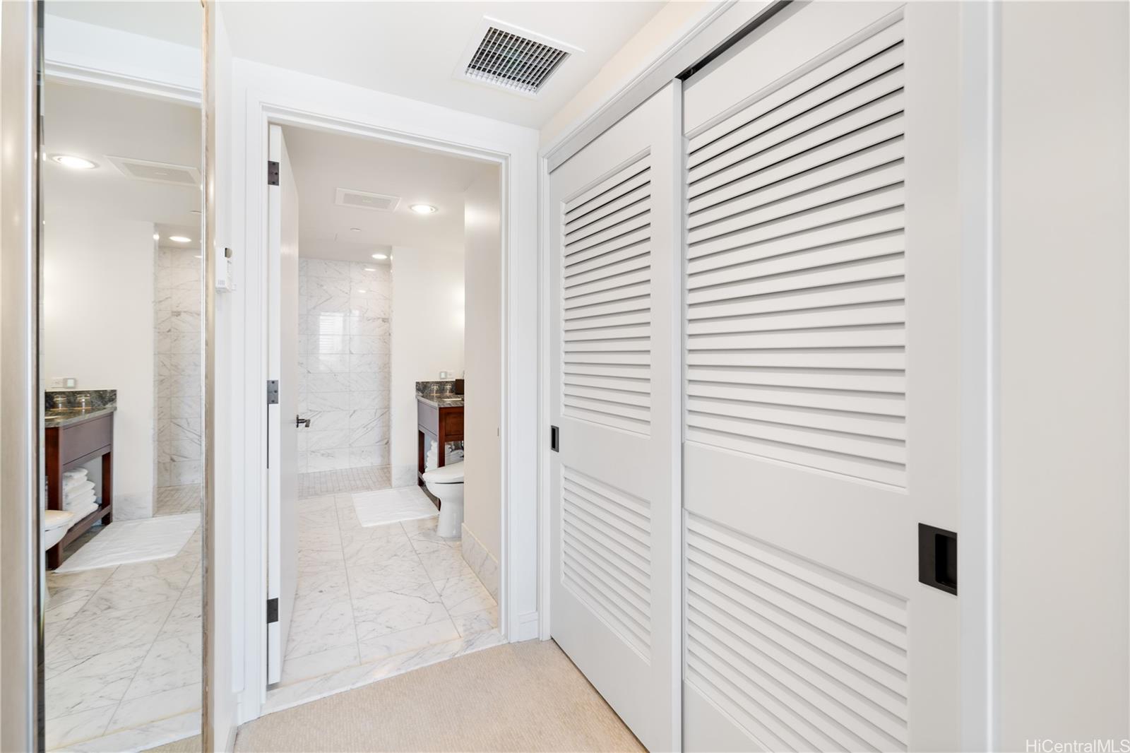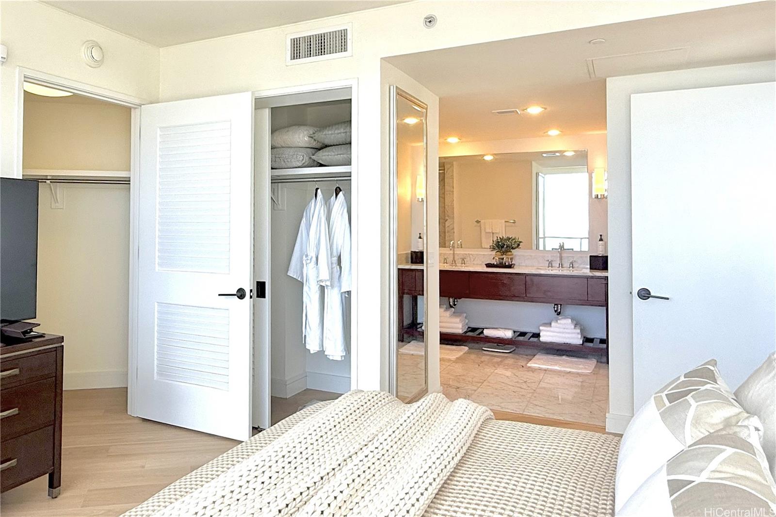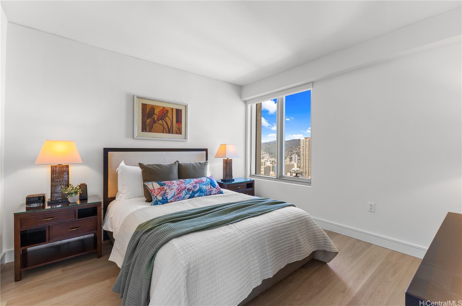 Take in sweeping panoramic views of the city skyline framed by the mountains, Koko Crater and Koko Head in Hawaii Kai, Diamond Head, and the iconic Pink Palace with Waikiki Beach as its backdrop. Relax on two separate lanais: one off the primary bedroom facing the ocean and the other off the living-dining area with beautiful mountain views.