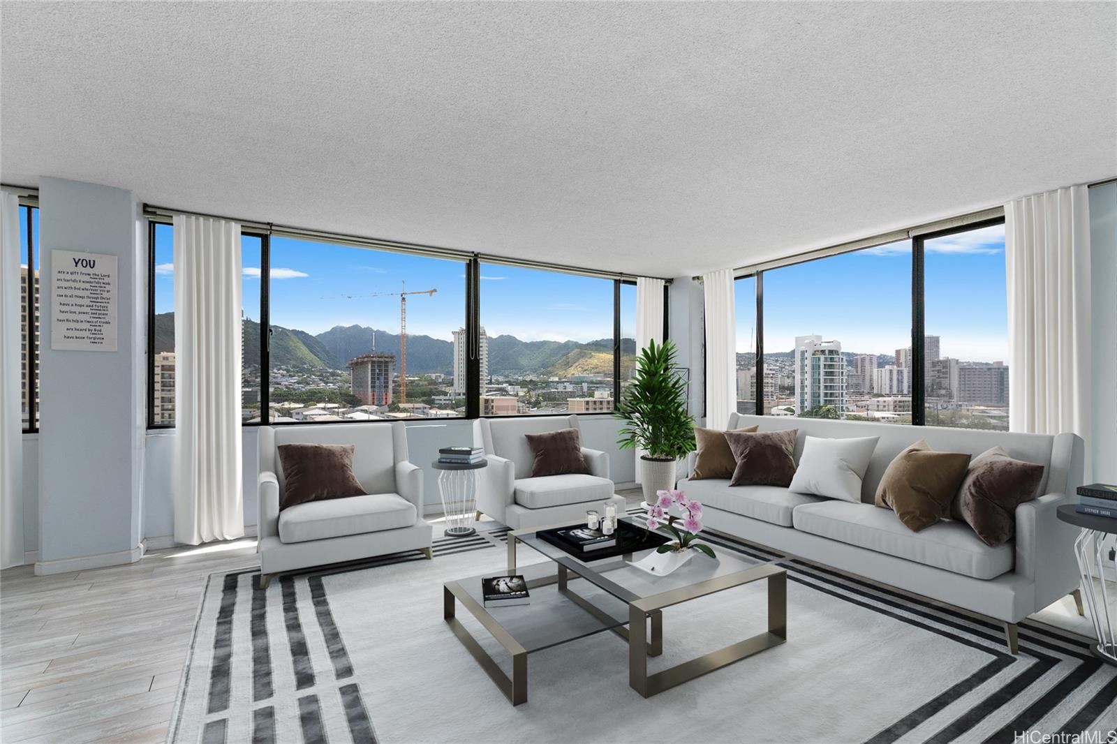Priced Below Tax Assessed Value! Experience the comfort of single-familly living with the conveniece of a condo in this spacious 2-bedroom, 2-bath unit at Kapiolani House. Enjoy stunning mountain views of majestic Manoa from over 1,200 sq ft of interior space. This unit also includes two side-by-side parking stalls. The preferred '04 stack offers added peace and quiet, as street noise is minimized thanks to central AC. Maintenance fees cover cable TV, internet, sewer, water, and common area expenses. Ideally located near Waikiki, top private schools, shopping, dining, and more- live, work, and play in one of Honolulu's most conveniet locations. Building HAS FIRE SPRINKLERS & IS FULLY INSURED! This is a Short Sale, and the Lender has already approved the price. Property to be sold As Is; Seller will not make any repairs or offer credits. Don't miss this opportunity- schedule your showing today! Listing by: Corcoran Pacific Properties (808) 589-2040