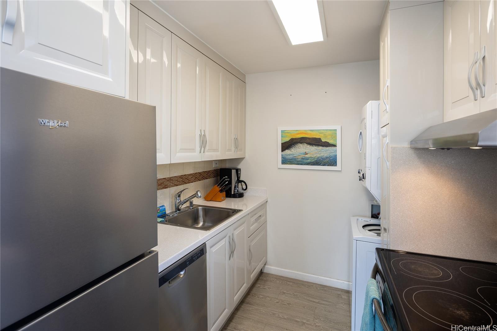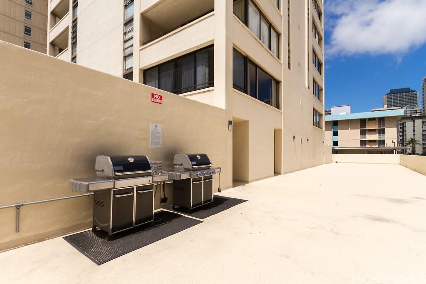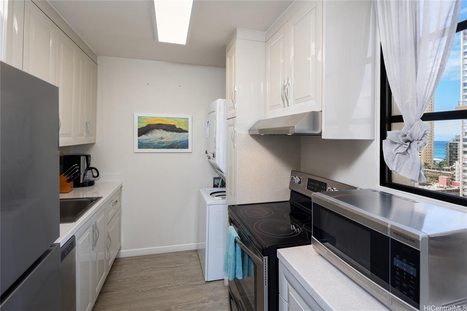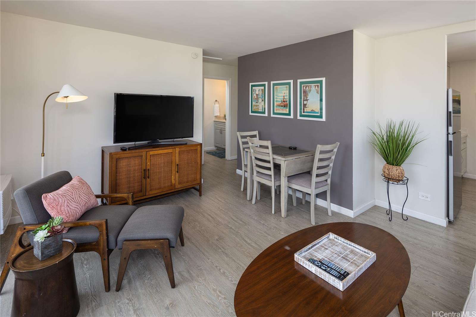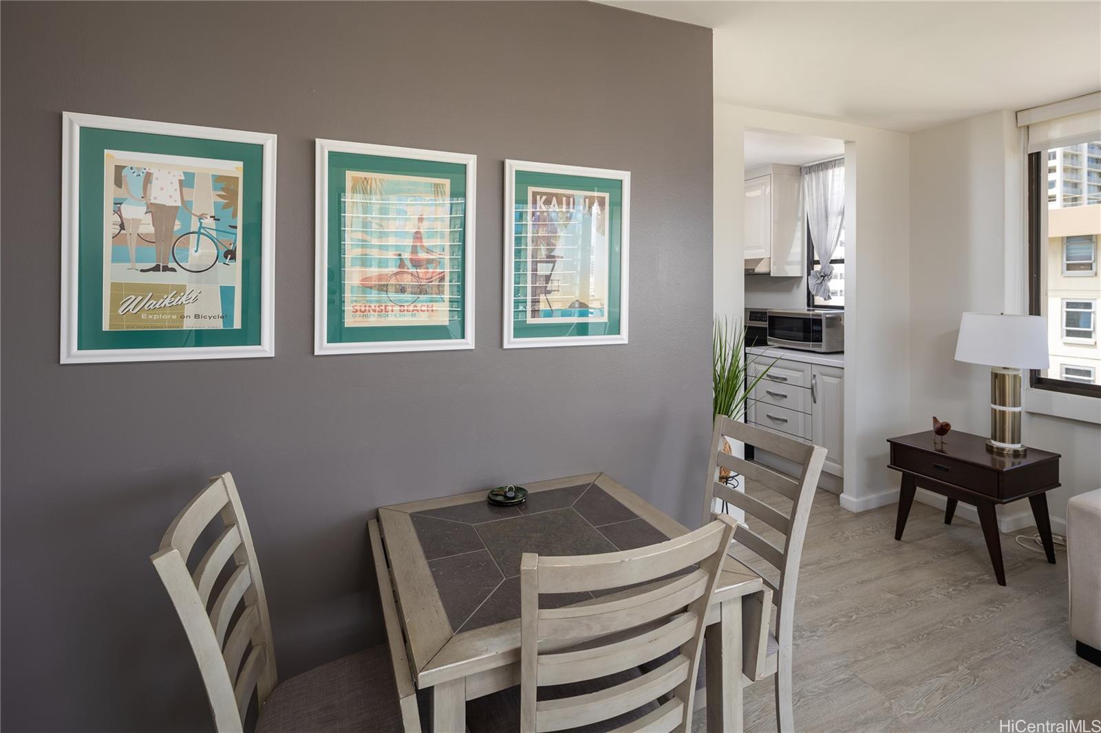 [0] => Back on the Market! Price drop! This peaceful one bedroom condo is your home away from home or your next investment. Well maintained building. King bed in the bedroom with a sofa sleeper in the living room. All linens are included. Kitchen is just off the living room with an extra window looking toward the ocean. All kitchenware is included. Bathroom has a recently refinished tub. Bathroom repiping was done on the building in late 2019/early 2020. Kitchen repiping was done a couple of years before that. Small building footprint with only four units per floor. Everyone has a corner unit. ACs in both living room and bedroom. Two TVs. One parking stall on the 2nd floor. The beach is close by, as well as the International Marketplace with Target and lots of restaurants. Buses run on Kuhio; close but not noisy. Views from the lanai are of the mountains, Ala Wai Canal, and some ocean.