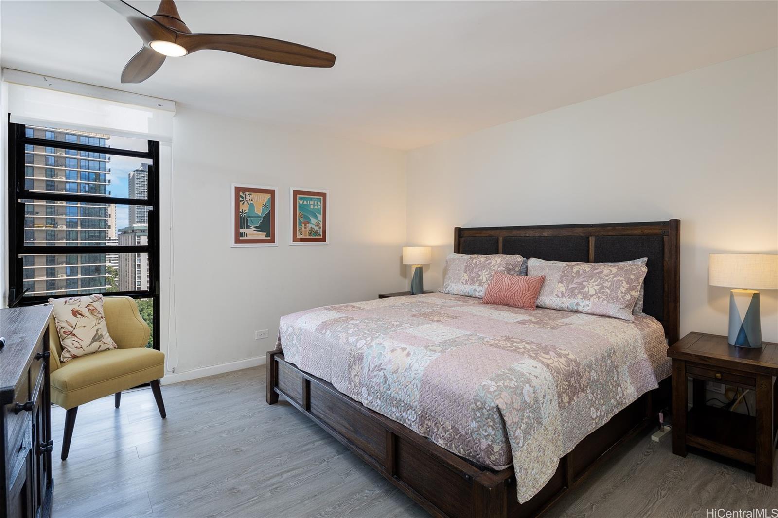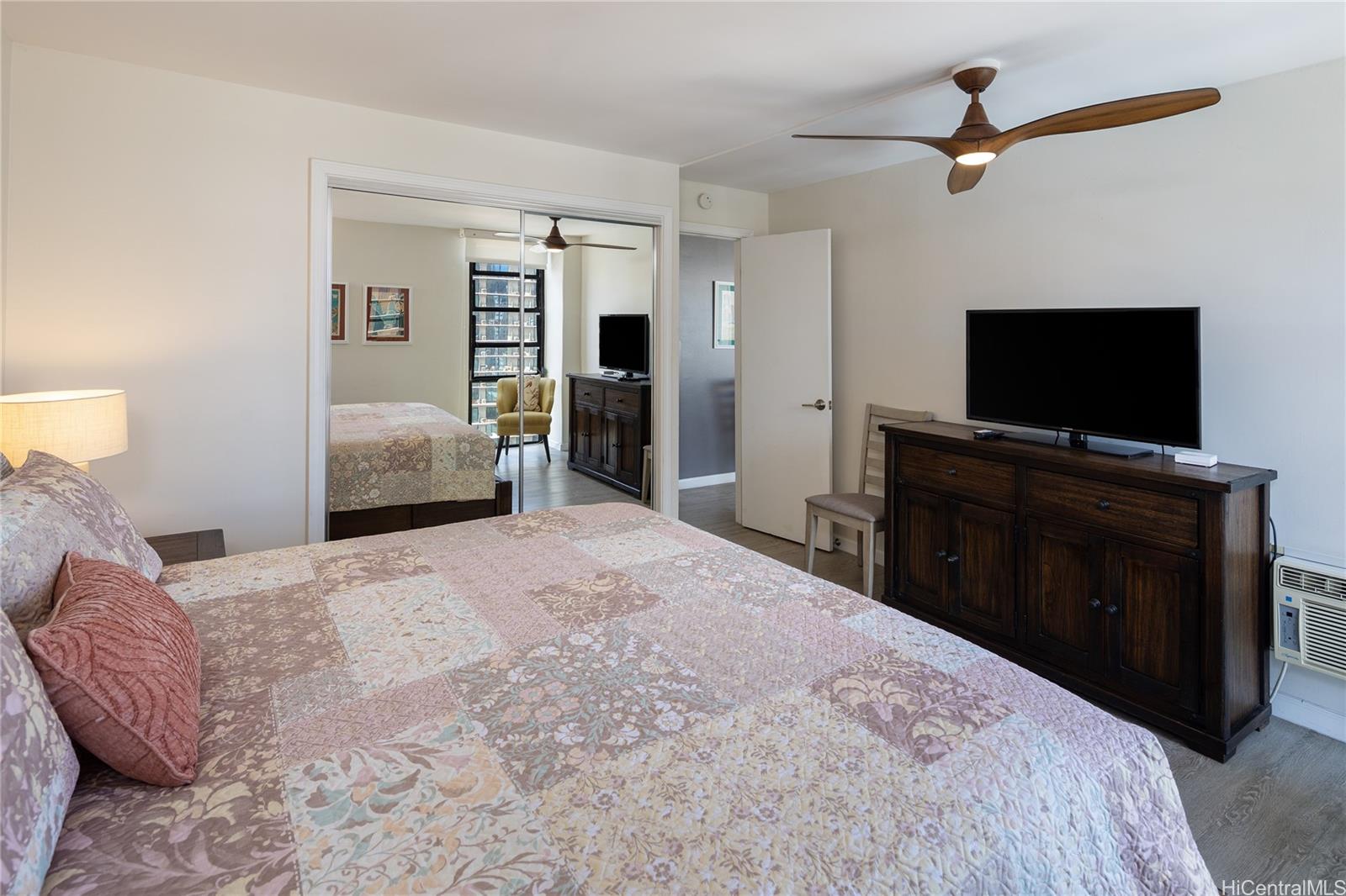 string(906) "Back on the Market! Price drop! This peaceful one bedroom condo is your home away from home or your next investment. Well maintained building. King bed in the bedroom with a sofa sleeper in the living room. All linens are included. Kitchen is just off the living room with an extra window looking toward the ocean. All kitchenware is included. Bathroom has a recently refinished tub. Bathroom repiping was done on the building in late 2019/early 2020. Kitchen repiping was done a couple of years before that. Small building footprint with only four units per floor. Everyone has a corner unit. ACs in both living room and bedroom. Two TVs. One parking stall on the 2nd floor. The beach is close by, as well as the International Marketplace with Target and lots of restaurants. Buses run on Kuhio; close but not noisy. Views from the lanai are of the mountains, Ala Wai Canal, and some ocean."