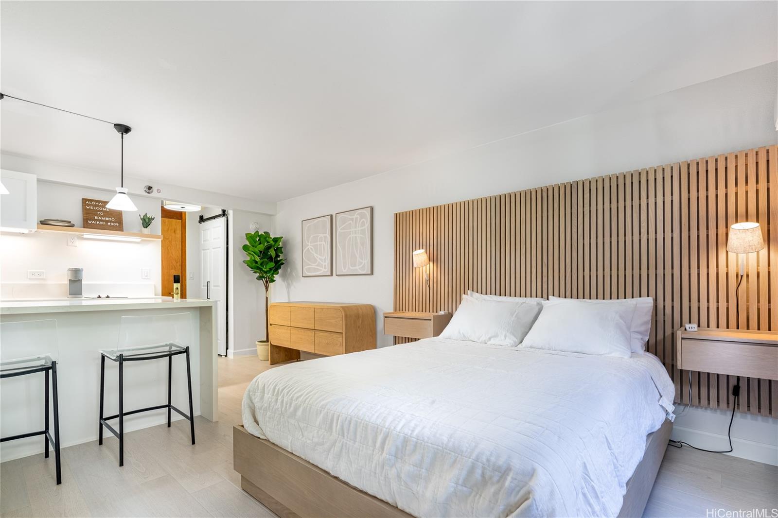 Looking for a successful, turnkey STR? Don't miss this chic, fully renovated studio that exudes island elegance and modern comfort. Located in the Bamboo, a boutique condotel situated in the heart of Waikiki - it's just 1.5 blocks from world-famous Waikiki Beach, steps from numerous tasty restaurants, boutique shops and the International Marketplace. A proven high-performing vacation rental, this self-managed Airbnb gem offers strong income potential - No DPP approval necessary to operate as an STR. Renovated in 2023, every detail of the renovation was carefully considered. Owner personally curated and shipped premium Crate & Barrel furnishings from the mainland to ensure the highest level of quality throughout the unit. Everything in the unit, including appliances, linens, kitchenware, decor, and a cabinet stocked with extra supplies, is included in the sale. The property is ready to go live on Airbnb from day one, with ample supplies to operate seamlessly for at least several weeks. Whether you’re seeking a luxurious vacation retreat or a turnkey investment, this exceptional unit delivers the best of both worlds—modern luxury and island charm. Listing by: Halepuna Real Estate Hawaii (808) 354-5772