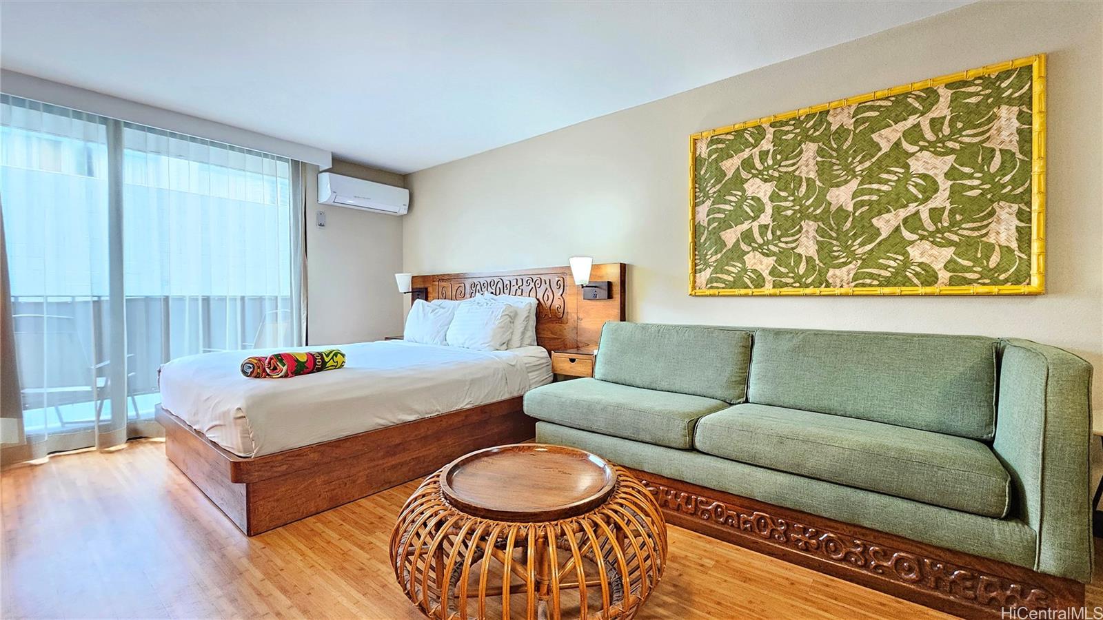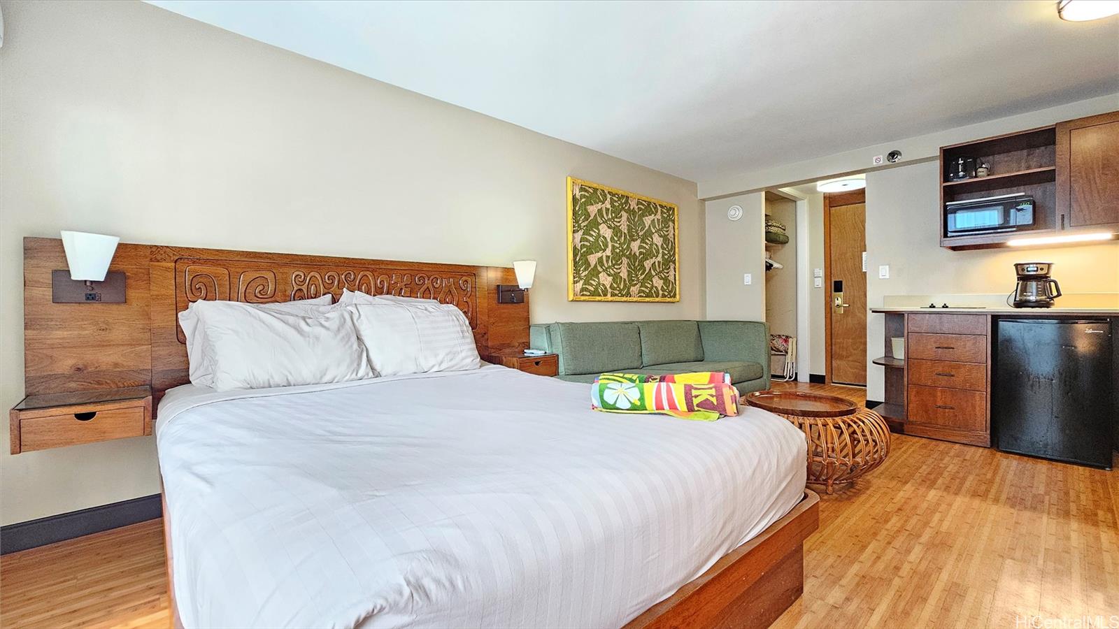Discover this turnkey 264 sq ft studio in boutique Bamboo Waikiki, legally permitted for short-term rentals and in resort zoning. This furnished unit is on serene side away from Kuhio Avenue, providing tranquil retreat steps from Waikiki. Features include kitchenette with two-burner cooktop, full-size refrigerator, microwave, coffee maker, plus bathroom with tub/shower. Recent upgrades include new split air conditioning, sound-dampening glass doors, renovated elevators. Property showcases lagoon-style pool with cascading waterfall surrounded by tropical foliage. Additional amenities include jacuzzi, BBQ, lounge chairs, thatched cabana seating, Ko Tiki Terrace poolside restaurant. Castle Resorts operates front desk, or opt for independent self-management. Prime central Waikiki location places you less than 1.5 blocks from Waikiki Beach, moments from International Market Place, Royal Hawaiian Center, luxury boutiques, acclaimed dining, entertainment. Monthly maintenance fee covers all utilities: electricity, water, sewer, cable TV, high-speed WiFi. Excellent investment in boutique property known for strong occupancy rates and zen-inspired atmosphere. Listing by: Hawaii Modern Realty (808) 225-3736
