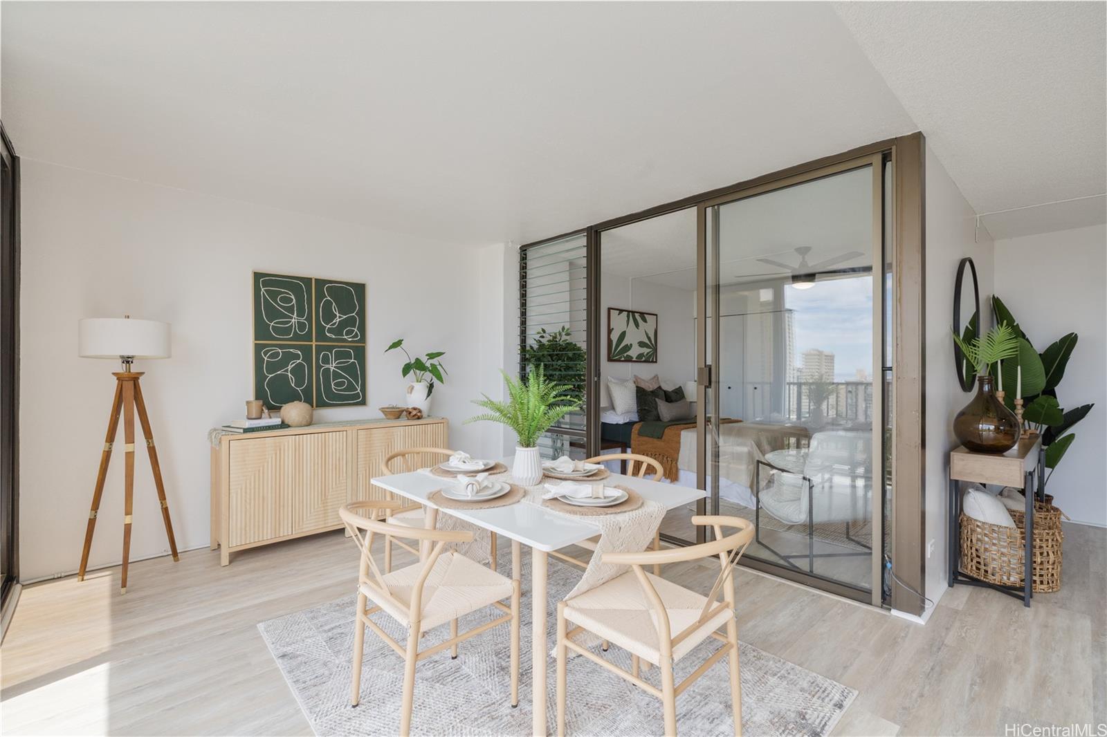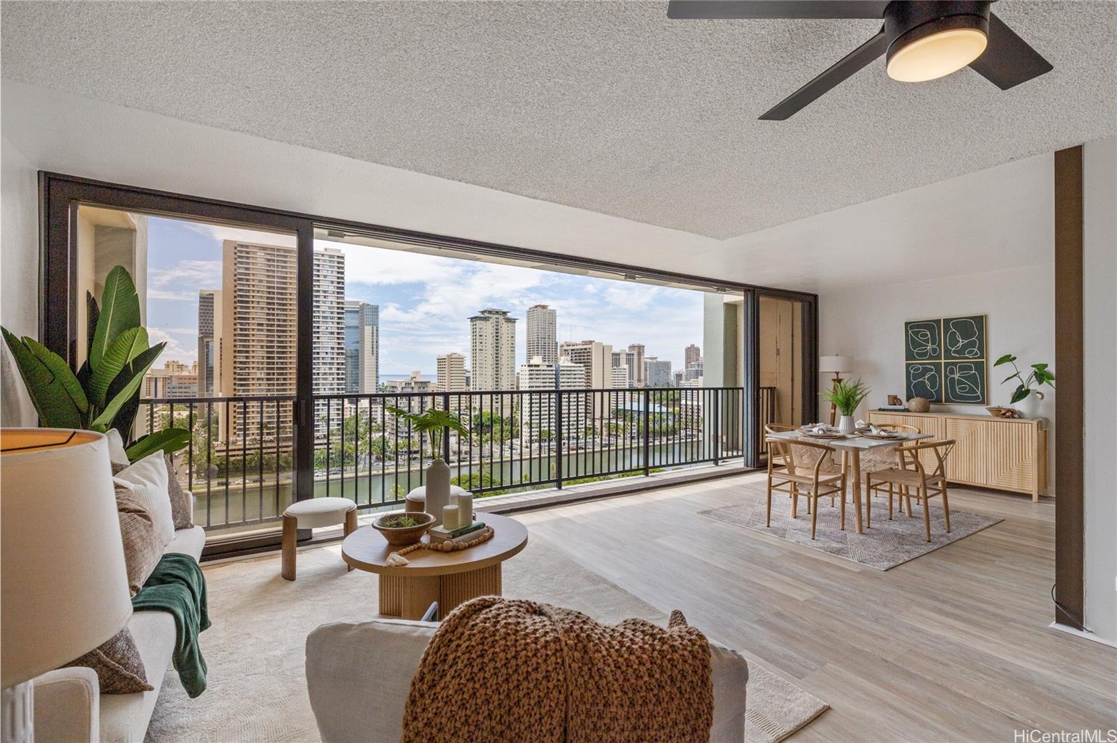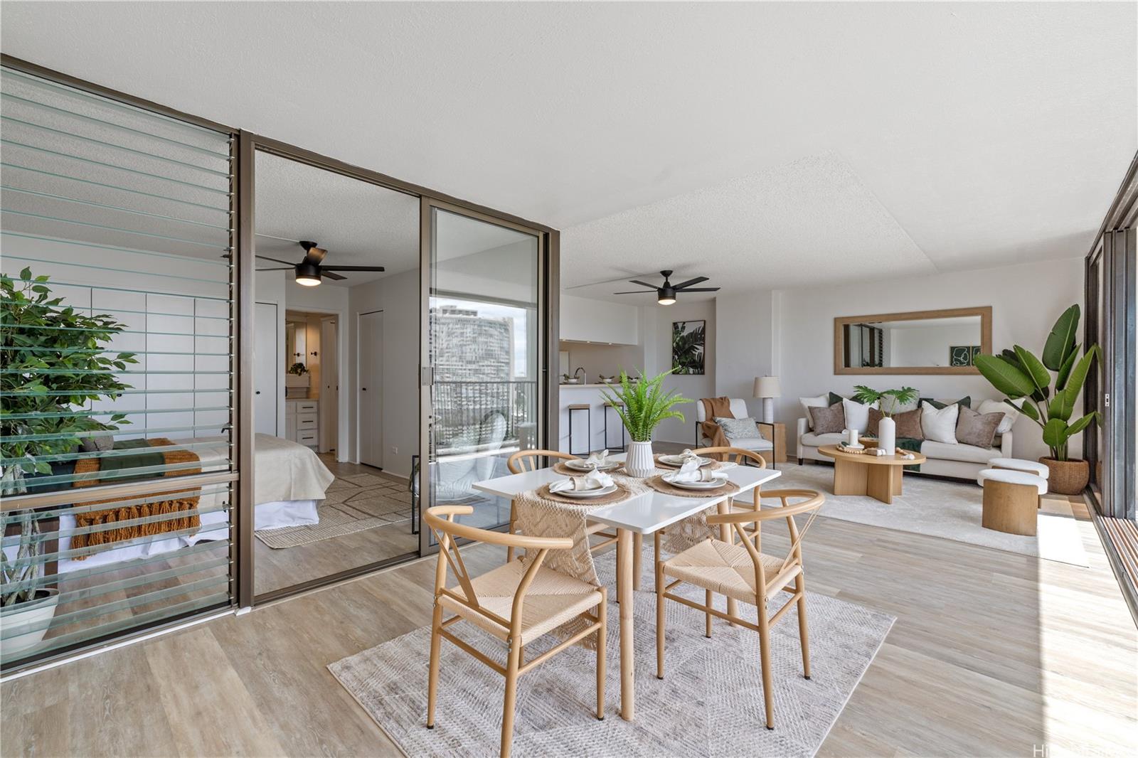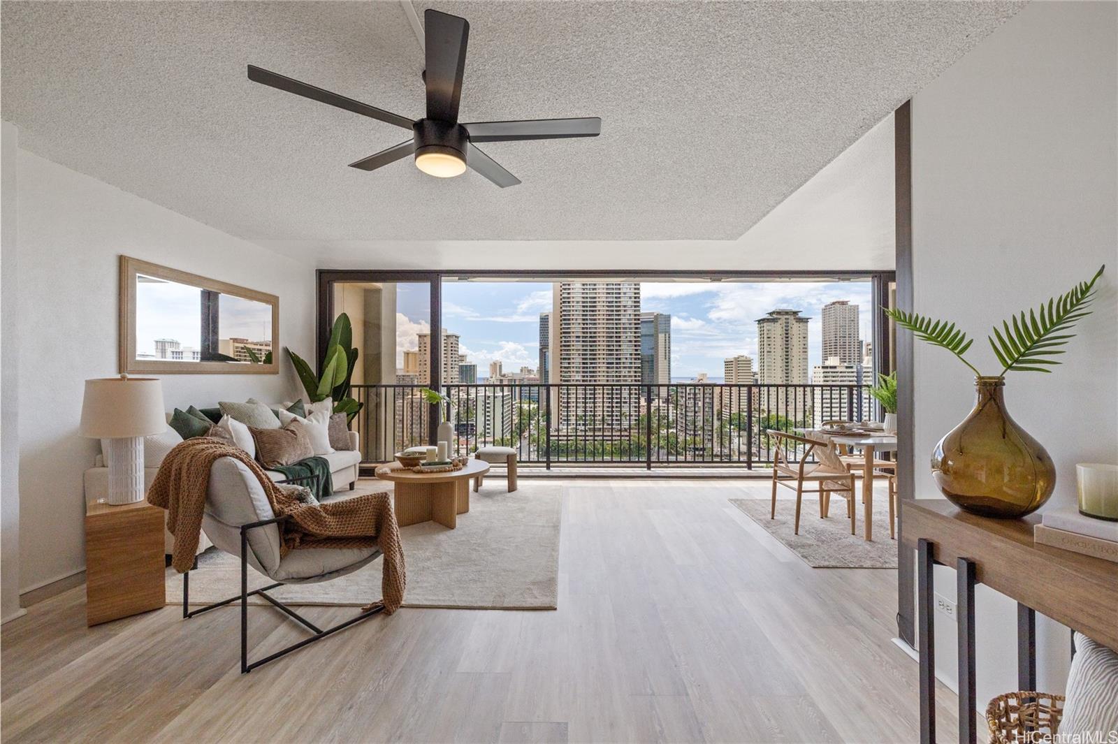 Wake up every day to the beauty of Honolulu in this captivating 1-bedroom, 1-bath home at Kaimana Lanais. With 810 sq. ft. of expanded interior space, the enclosed lanai creates an airy, open layout designed for both relaxation and entertaining. Freshly updated with luxury vinyl flooring, new light fixtures, sleek Corian countertops, and crisp paint, this residence blends modern comfort with timeless island style. Floor-to-ceiling multi-slide doors bring in dazzling views of the Waikiki’s skyline, vibrant city, ocean, Diamond Head,  and spectacular sunsets—your personal postcard from paradise. The walk-in shower adds a touch of everyday luxury, while building amenities elevate your lifestyle with a pool, recreation room, surfboard racks, secure entry, and pet-friendly living. Perfectly located in Kapiolani, you’re minutes from Waikiki, Ala Wai Golf Course, UH, beaches, parks, shopping, and entertainment. Move-in ready, meticulously maintained, and waiting for you—schedule your showing today! Listing by: Fine Island Properties LLC (808) 799-6826