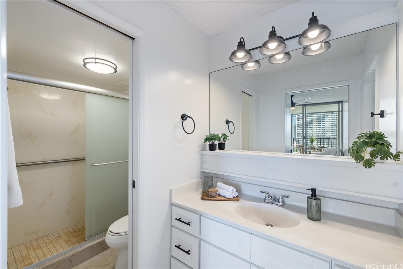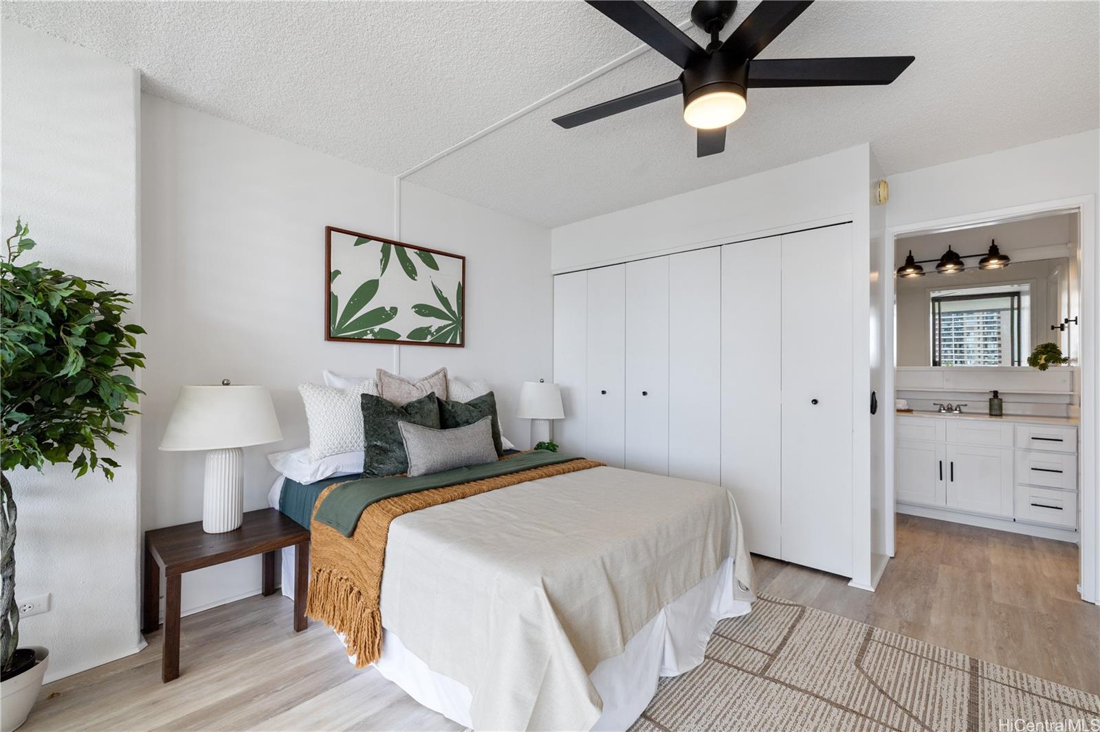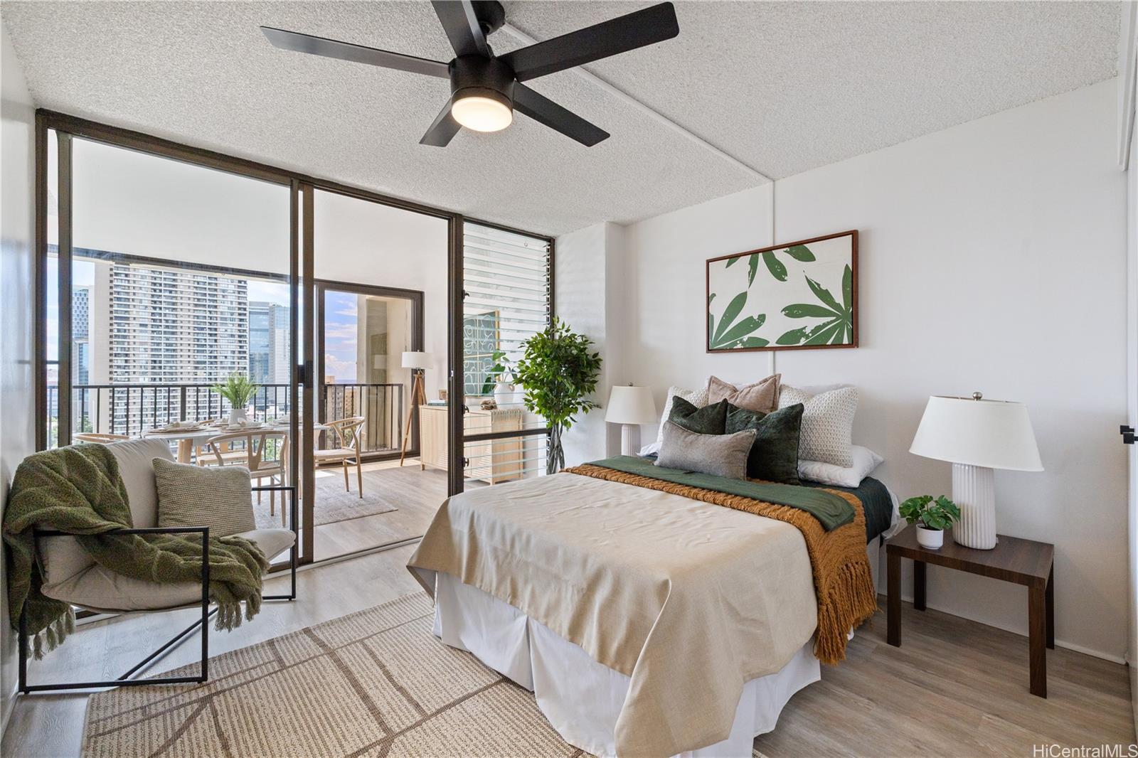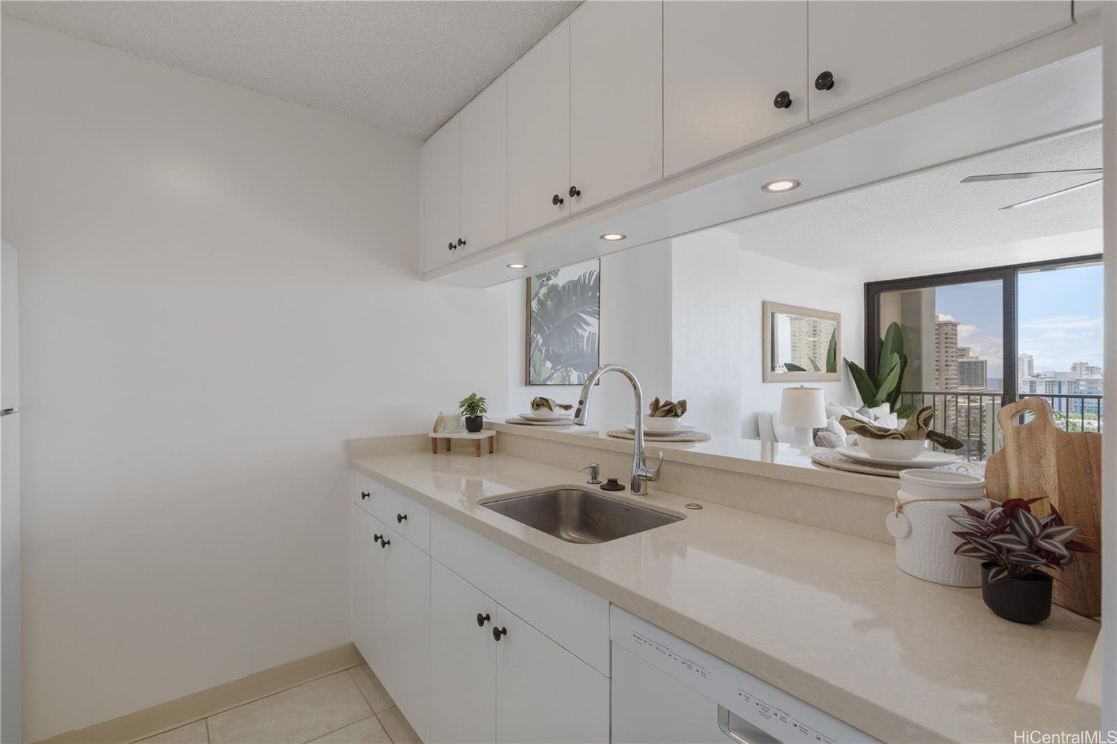 Wake up every day to the beauty of Honolulu in this captivating 1-bedroom, 1-bath home at Kaimana Lanais. With 810 sq. ft. of expanded interior space, the enclosed lanai creates an airy, open layout designed for both relaxation and entertaining. Freshly updated with luxury vinyl flooring, new light fixtures, sleek Corian countertops, and crisp paint, this residence blends modern comfort with timeless island style. Floor-to-ceiling multi-slide doors bring in dazzling views of the Waikiki’s skyline, vibrant city, ocean, Diamond Head,  and spectacular sunsets—your personal postcard from paradise. The walk-in shower adds a touch of everyday luxury, while building amenities elevate your lifestyle with a pool, recreation room, surfboard racks, secure entry, and pet-friendly living. Perfectly located in Kapiolani, you’re minutes from Waikiki, Ala Wai Golf Course, UH, beaches, parks, shopping, and entertainment. Move-in ready, meticulously maintained, and waiting for you—schedule your showing today! Listing by: Fine Island Properties LLC (808) 799-6826