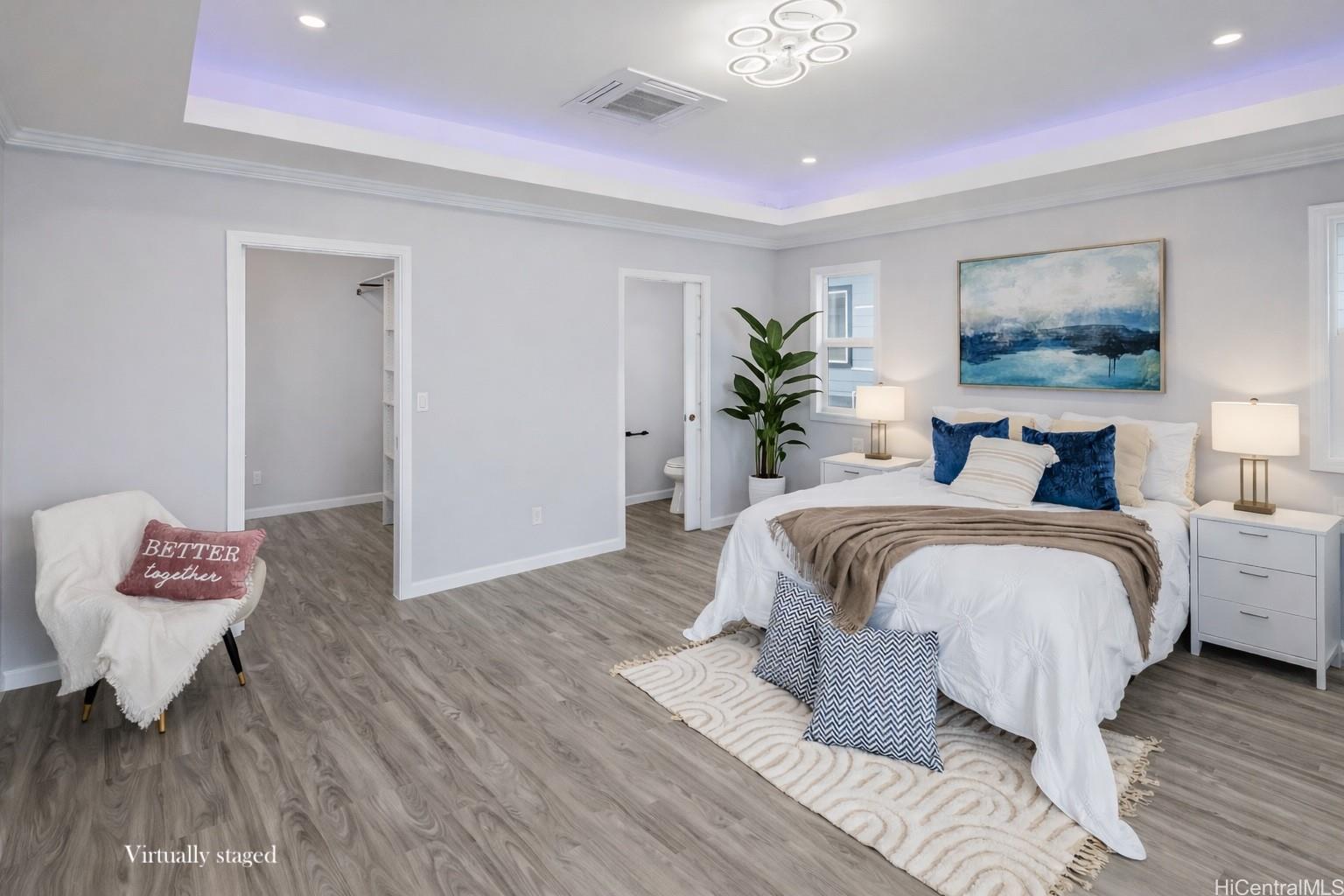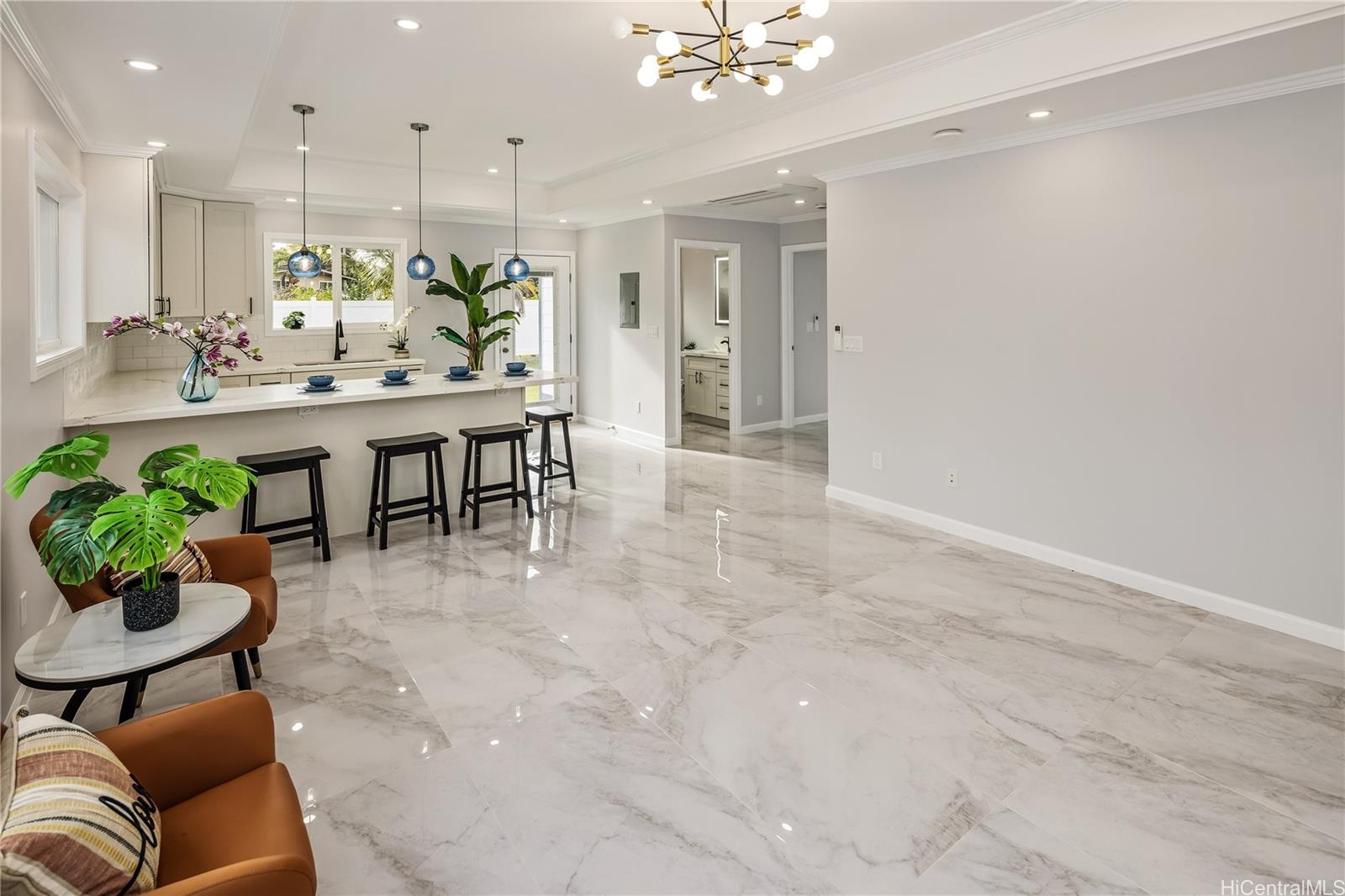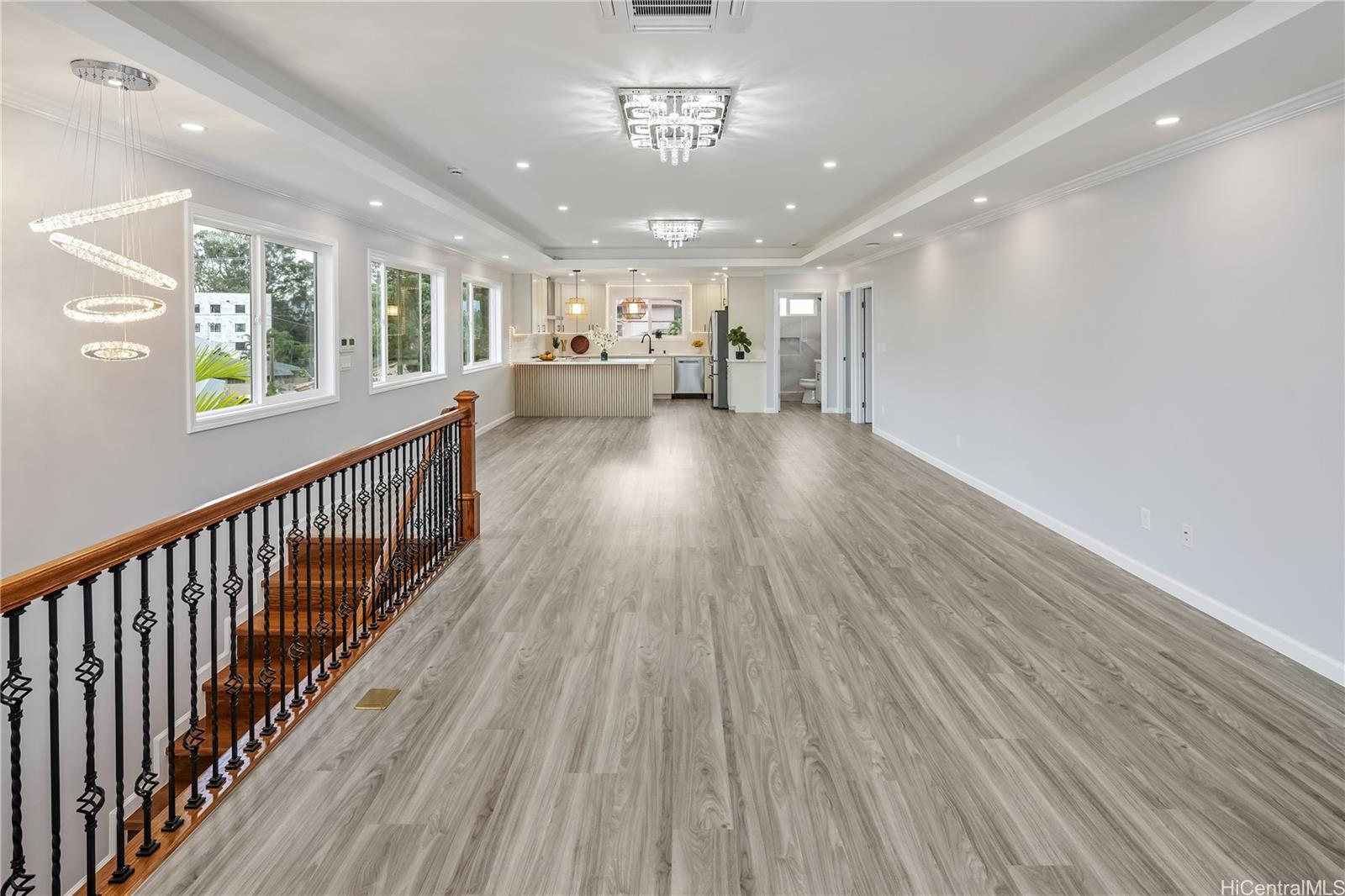 Upstairs, the second floor features 3 bedrooms, 2 bathrooms, and a large open-concept kitchen with premium finishes-perfect for cooking, entertaining, and everyday living. vinyl plank flooring enhances the contemporary appeal. Luxury muti-split A/C units throughout keep the home cool year-round. The upstairs Ilving room and primary bedroom are highlighted by a fascinating suspended celling with custom lighting, adding a sophisticated architectural touch. Enjoy the peace and comfort of this Wahlawa neighborhood while being Just minutes from schools, dining, shops, and the scenic Wahlawa Freshwater State Recreation Area, Schofleld Barracks and Wheeler Army Airfield!