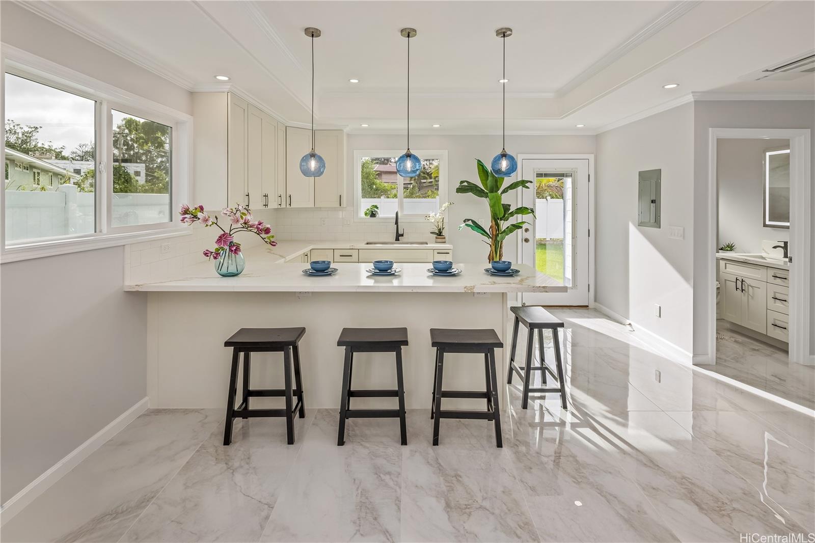 Upstairs, the second floor features 3 bedrooms, 2 bathrooms, and a large open-concept kitchen with premium finishes-perfect for cooking, entertaining, and everyday living. vinyl plank flooring enhances the contemporary appeal. Luxury muti-split A/C units throughout keep the home cool year-round. The upstairs Ilving room and primary bedroom are highlighted by a fascinating suspended celling with custom lighting, adding a sophisticated architectural touch. Enjoy the peace and comfort of this Wahlawa neighborhood while being Just minutes from schools, dining, shops, and the scenic Wahlawa Freshwater State Recreation Area, Schofleld Barracks and Wheeler Army Airfield! Listing by: Coldwell Banker Realty (808) 343-7502