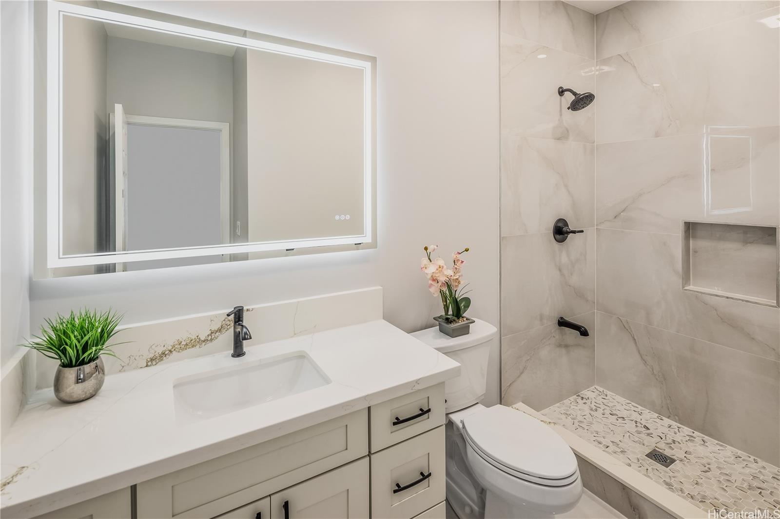 Upstairs, the second floor features 3 bedrooms, 2 bathrooms, and a large open-concept kitchen with premium finishes-perfect for cooking, entertaining, and everyday living. vinyl plank flooring enhances the contemporary appeal. Luxury muti-split A/C units throughout keep the home cool year-round. The upstairs Ilving room and primary bedroom are highlighted by a fascinating suspended celling with custom lighting, adding a sophisticated architectural touch. Enjoy the peace and comfort of this Wahlawa neighborhood while being Just minutes from schools, dining, shops, and the scenic Wahlawa Freshwater State Recreation Area, Schofleld Barracks and Wheeler Army Airfield!"