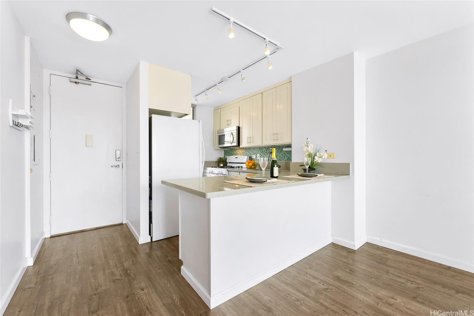 [0] => Enjoy cool mountain breezes from this spacious and tastefully upgraded 2-bedroom, 1 bathroom apartment. Updates include quartz countertops, newer cabinets, and luxury vinyl plank floors. Located in a PET-FRIENDLY and secure building with an enter phone system and secured elevator fob access. Unit comes with one covered parking stall. Conveniently situated near UH, Chaminade, Iolani, beaches, shopping centers, restaurants, bus lines, and freeway access. This property is ideal for first-time homeowners or investors looking for a prime location. Don't miss out on this opportunity to own a piece of paradise! (One or more photos are enhanced)