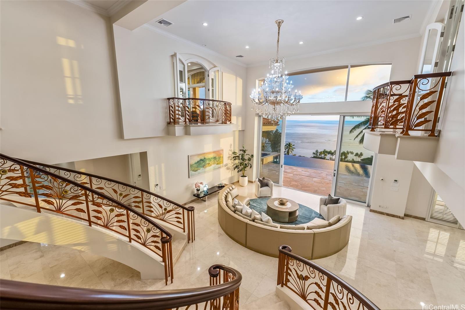 NEW LISTING!! Experience refined island living in this grand 7-bdrm, 6 full, 2 half-ba estate on a rare half-acre parcel within the desirable gated community of Hawaii Loa Ridge. Perfectly positioned to capture sweeping, unobstructed ocean and coastline views from Diamond Head to Koko Head, this residence offers exceptional privacy, serenity, and breathtaking vistas. Boasting over 6,000 sq ft, the home showcases exceptional craftsmanship and luxurious finishes. A dramatic double staircase welcomes you into the expansive living room, where soaring ceilings and walls of glass frame the stunning views and open to the infinity-edge pool and expansive deck, ideal for outdoor dining, entertaining, and enjoying Hawaii’s iconic scenery. This 2017 built residence features six en-suite bdrms, an impressive entertainment room, and a gourmet kitchen equipped with top-of-the-line Miele stainless steel appliances. This home offers an elegant setting for both intimate meals and grand entertaining. Highlights include two separate garages, thoughtfully designed outdoor green spaces, and a premier end-of-cul-de-sac location. This exceptional estate embodies privacy, elegance, and refined luxury. Listing by: REMAX Hawaii (808) 738-3633