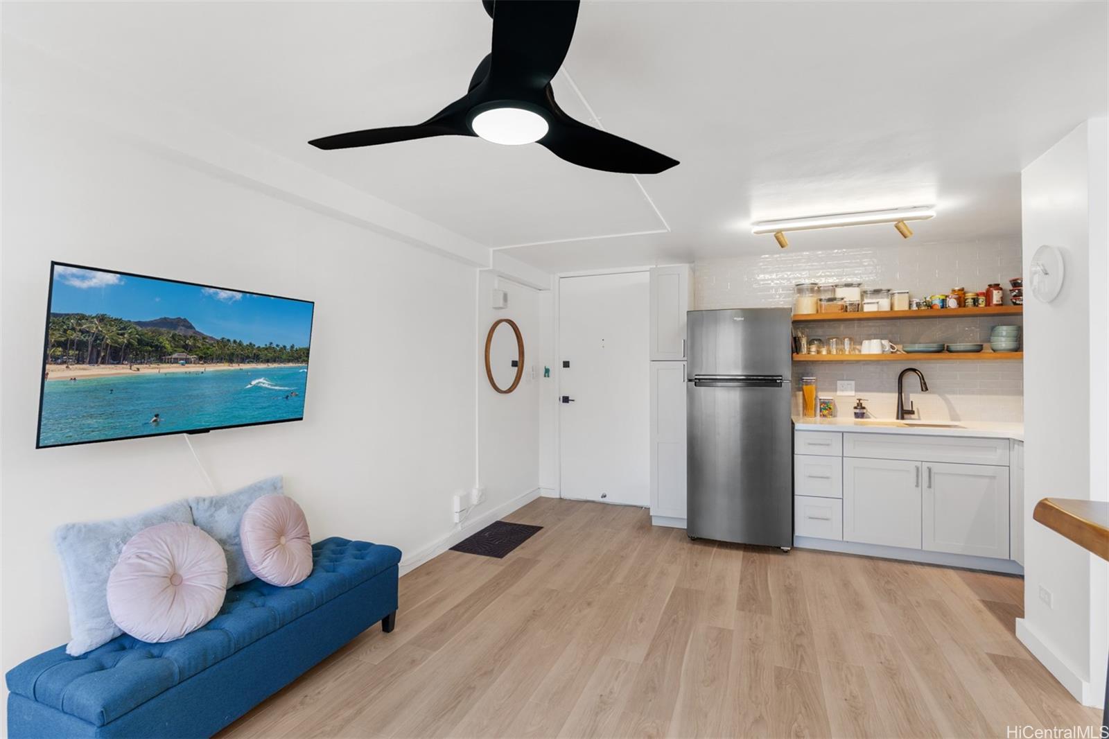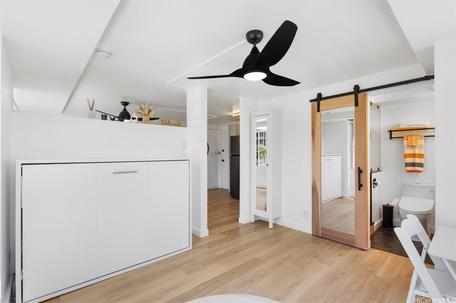 This stylishly chic and move-in ready updated and fully furnished 1-bed/1-bath leasehold condo at Five Regents offers bright, open living with tasteful modern touches. Features include vinyl plank flooring, a space-saving Murphy bed, quartz kitchen counters with open shelving, and a sleek bathroom with a rain shower, wood-look tile, and stone pebble flooring. Large corner windows provide great natural light. With 24-hour security, this unit is conveniently located near shopping, dining, and freeway access. A perfect urban retreat in central Honolulu! Listing by: Carvill Sotheby's Intl. Realty (808) 291-4681