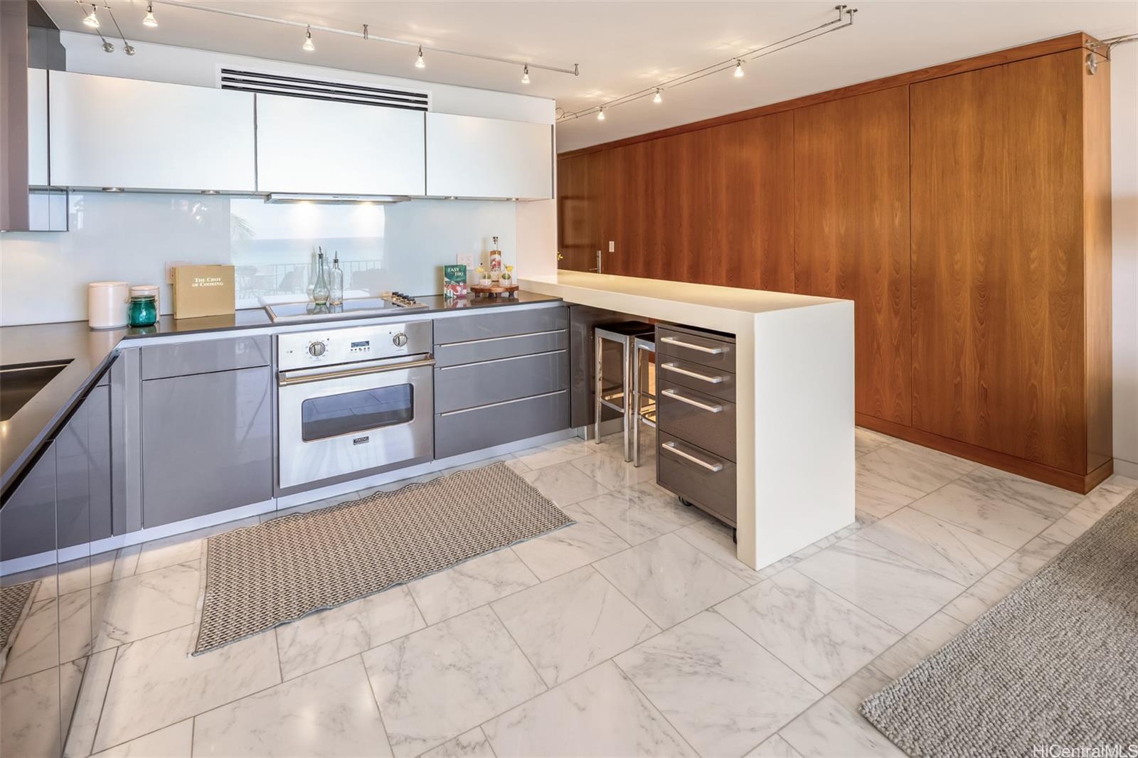 Sleek, modern, spectacular! Exquisitely renovated Gold Coast oceanfront apartment at the foot of Diamond Head – Designed by noted Houston architect, William Taylor – it features a custom Poggenpohl Kitchen, designer lighting, bespoke cabinetry with maximum storage, and a clean, minimalist look. Central AC, marble flooring throughout, new Fleetwood doors and windows. Embrace sun, surf, and paddling & leisurely walks in Kapiolani Park at the quiet edge of Waikiki. Listing by: Coldwell Banker Realty (808) 738-3904