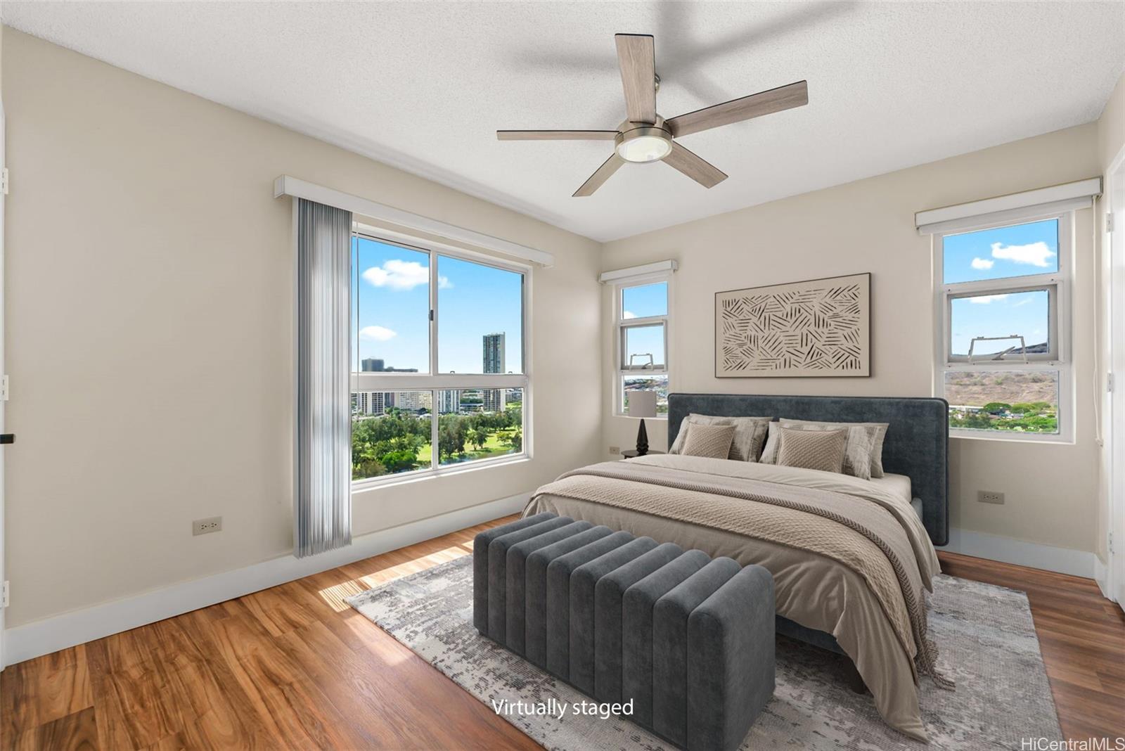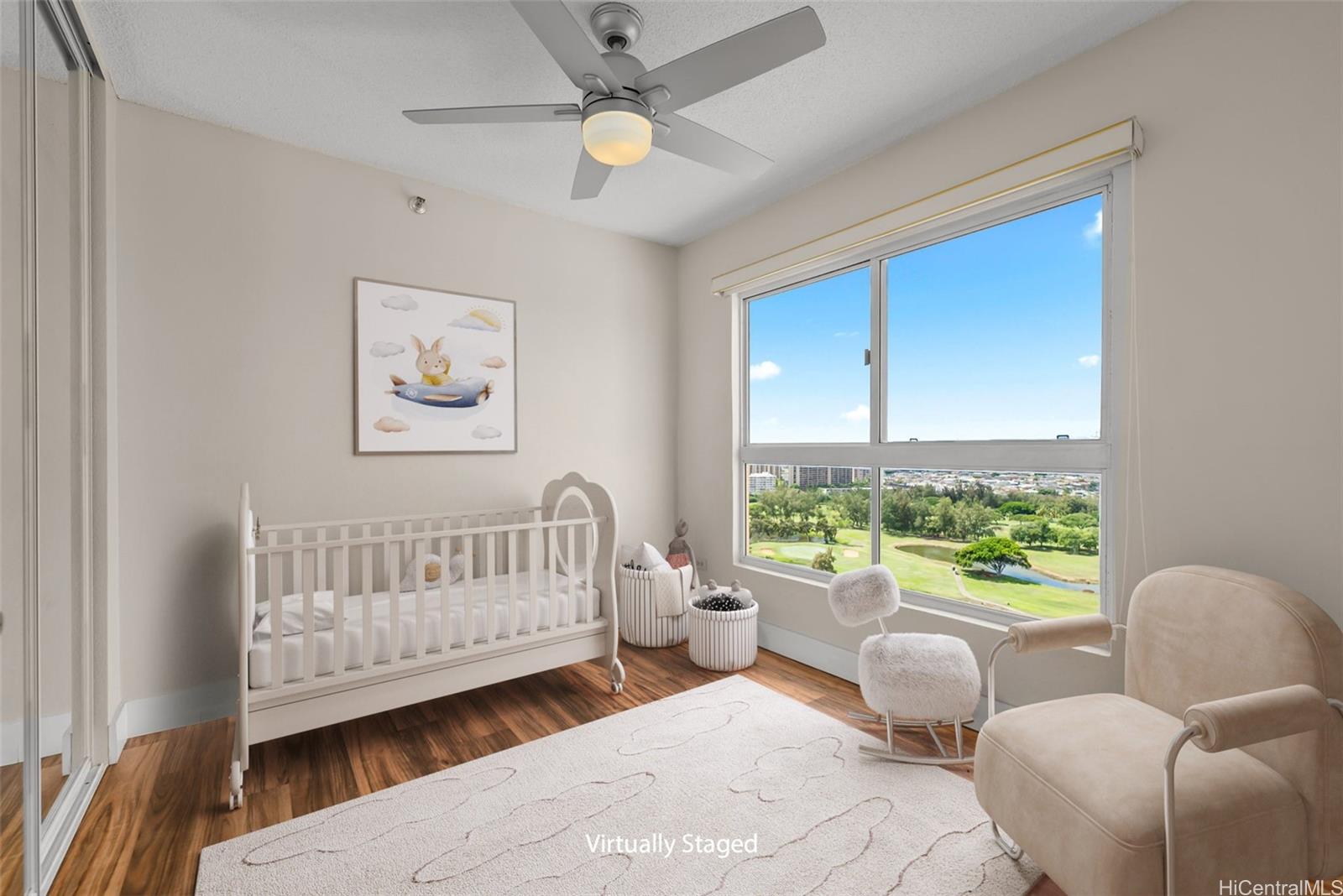 Enjoy resort living with easy access to the freeway, Tripler Hospital, Honolulu International Airport, Fort Shafter, Pearl Harbor & Hickam. From the moment you step through the gate of this preferred end unit, you'll be captivated by panoramic Golf Course & Mountain views, with historic Tripler Hospital visible in the distance. Inside, the renovated kitchen features a breakfast bar & ample space for an eat-in area, flowing seamlessly into the dining and living areas. The open-concept living space flows to a covered lanai with Ocean & Golf Course views, perfect for al fresco dining, morning coffee, or unwinding after a long day. The primary suite features tranquil mountain and golf course views along with the beautiful twinkling lights of distant buildings at night, bath with tub, a walk-in closet, and a secondary closet. This spacious home truly blends comfort and convenience! Country Club Village is a pet-friendly community offering fantastic amenities such as a pool, BBQ areas, walking paths, and abundant guest parking, making it ideal for entertaining. The property is VA approved and includes 100% hurricane coverage. Listing by: Hawaii Life (808) 392-1044