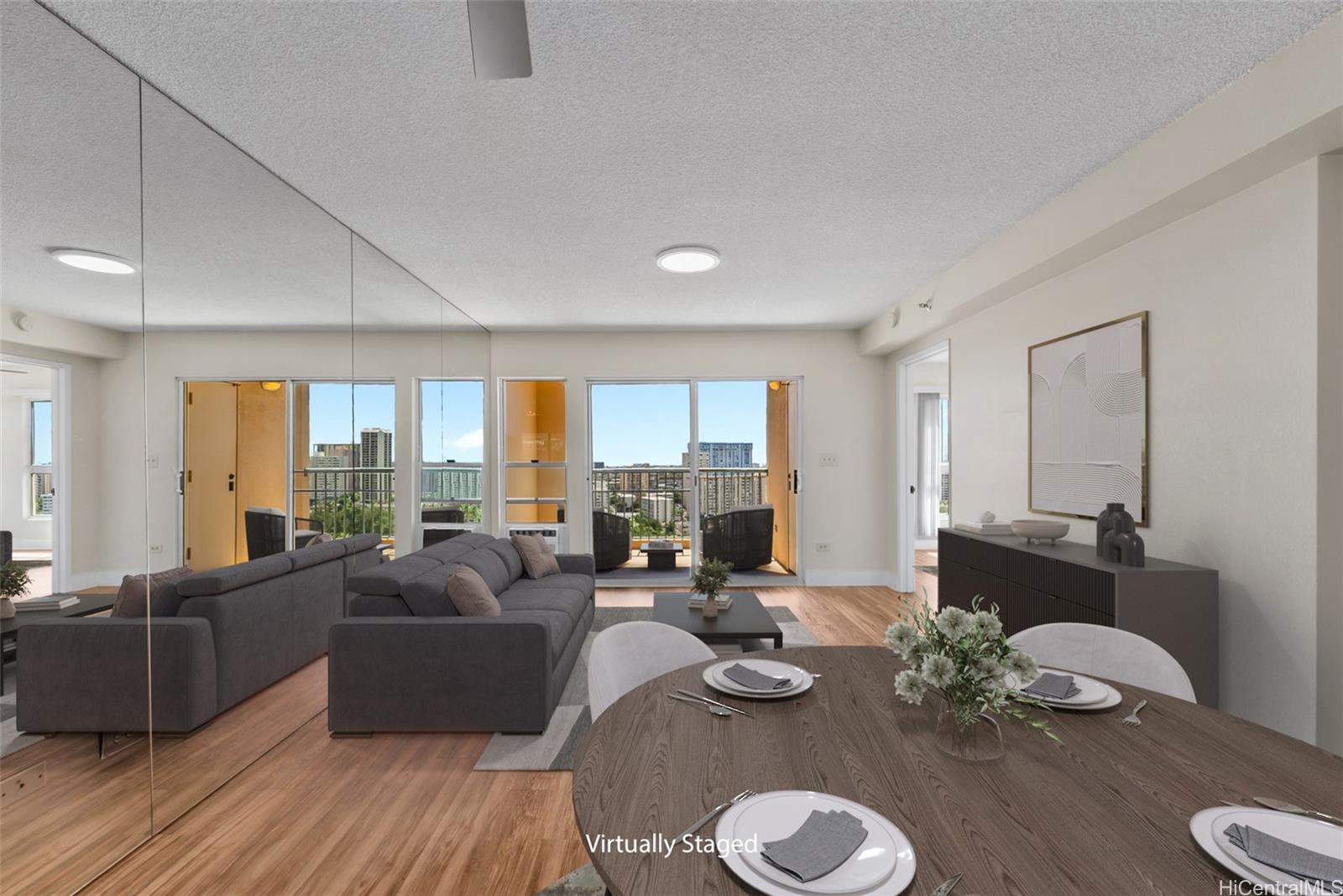 [0] => Enjoy resort living with easy access to the freeway, Tripler Hospital, Honolulu International Airport, Fort Shafter, Pearl Harbor & Hickam. From the moment you step through the gate of this preferred end unit, you'll be captivated by panoramic Golf Course & Mountain views, with historic Tripler Hospital visible in the distance. Inside, the renovated kitchen features a breakfast bar & ample space for an eat-in area, flowing seamlessly into the dining and living areas. The open-concept living space flows to a covered lanai with Ocean & Golf Course views, perfect for al fresco dining, morning coffee, or unwinding after a long day. The primary suite features tranquil mountain and golf course views along with the beautiful twinkling lights of distant buildings at night, bath with tub, a walk-in closet, and a secondary closet. This spacious home truly blends comfort and convenience! Country Club Village is a pet-friendly community offering fantastic amenities such as a pool, BBQ areas, walking paths, and abundant guest parking, making it ideal for entertaining. The property is VA approved and includes 100% hurricane coverage.