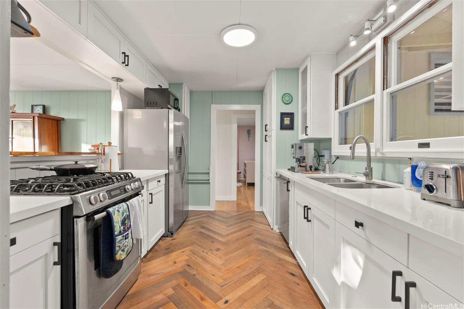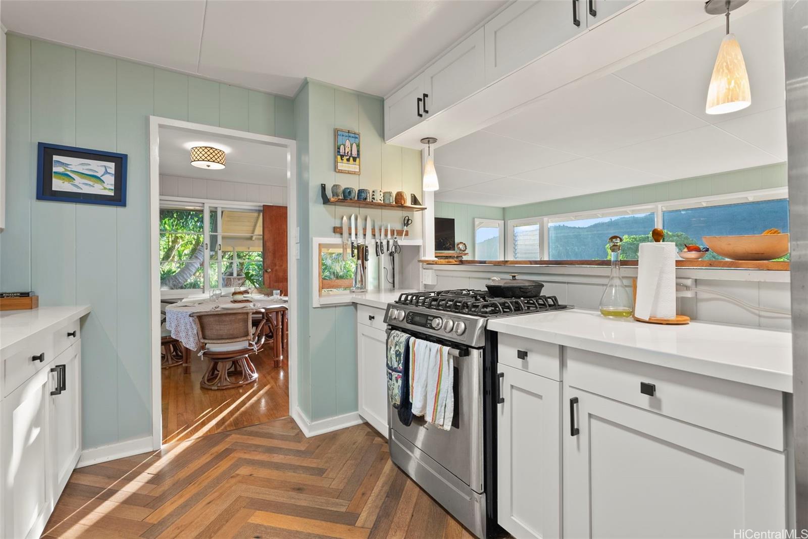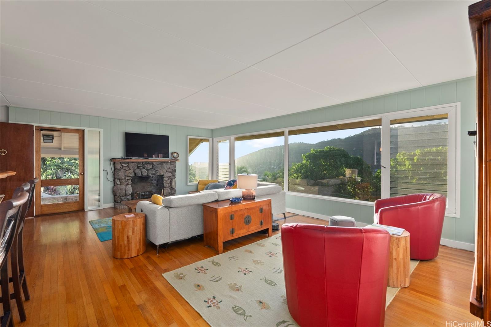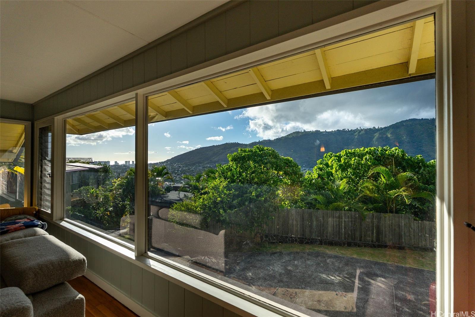 Experience the rare chance to own a private retreat that radiates the charm of old Hawaii, in beautiful Manoa. Situated on a sprawling 39,487 sq. ft. lot at the end of a private road, this exquisite 3-bed, 2-bath home offers peaceful seclusion while being just minutes from Manoa Market Place, University of Hawaii, Waikiki, & more. Thoughtfully upgraded & maintained, this home offers flexible living options, including a 3/1 upstairs with the potential for a 1/1 guest suite with a separate entrance downstairs. Enjoy panoramic mountain-to-Ala Moana views, 19 owned PV panels, tesla battery, EV charger, a remodeled kitchen with gas range/oven, & updated bathrooms. Original oak floors have been lovingly refinished, complemented by travertine, ceramic, & engineered wood in other areas. Restored details include double-hung windows, wooden screens, & mahogany stacking doors that open the dining area to a lush, outdoor lanai, blending indoor-outdoor living . The centerpiece lava rock fireplace adds warmth to the living and family room. Complete with an oversized garage w/ room for potentially up to three cars, this one-of-a-kind home is a must-see. Watch the video & schedule your tour today! Listing by: REMAX Hawaii (808) 330-6725