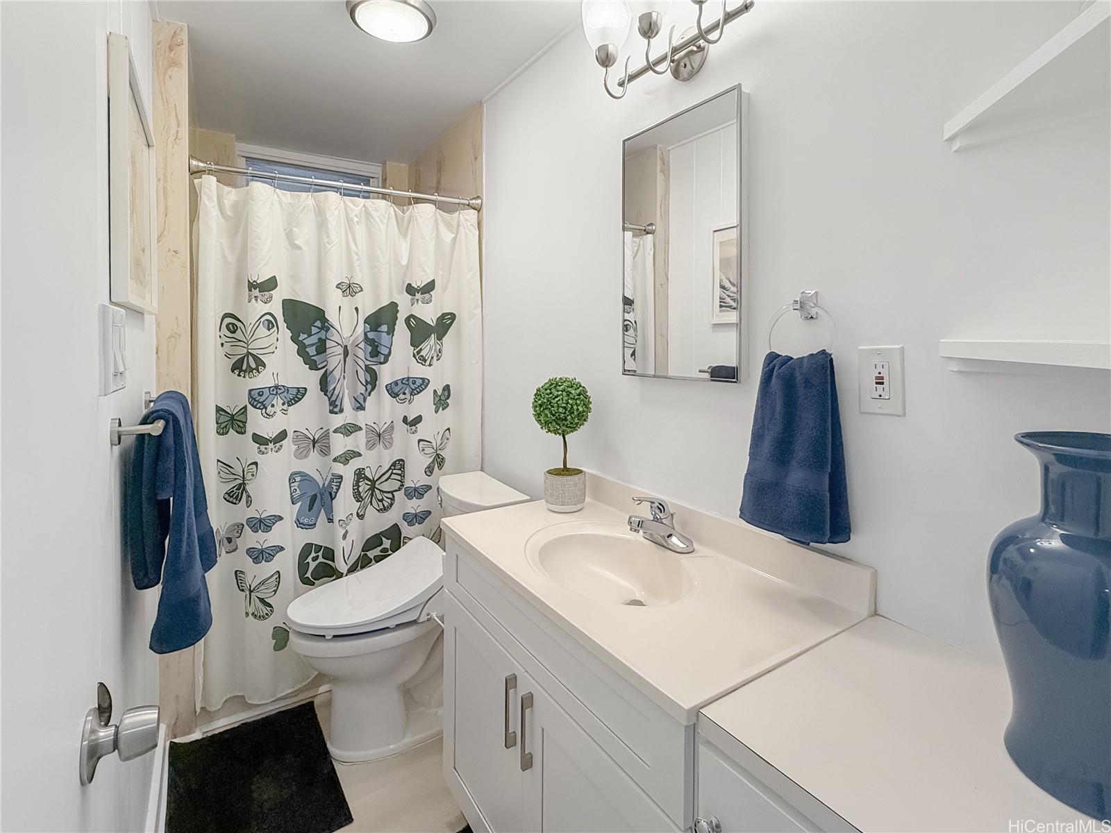 Lower level includes a bedroom with en-suite bathroom offering dual access from the laundry area, plus interior access to a covered two-car carport with storage—providing garage-like convenience. Convenient location near UH, town, shopping, and freeway access."