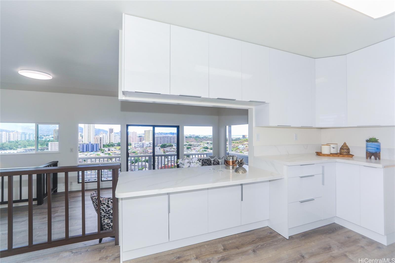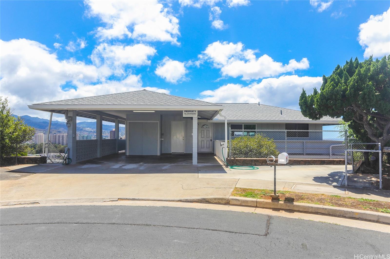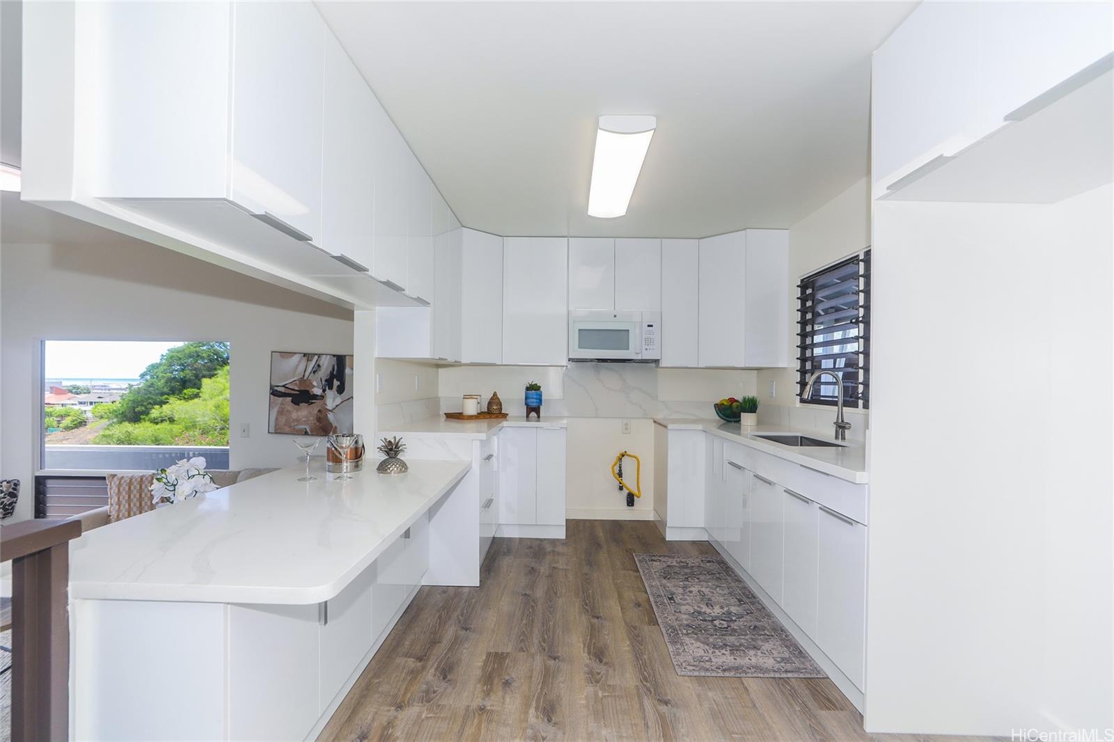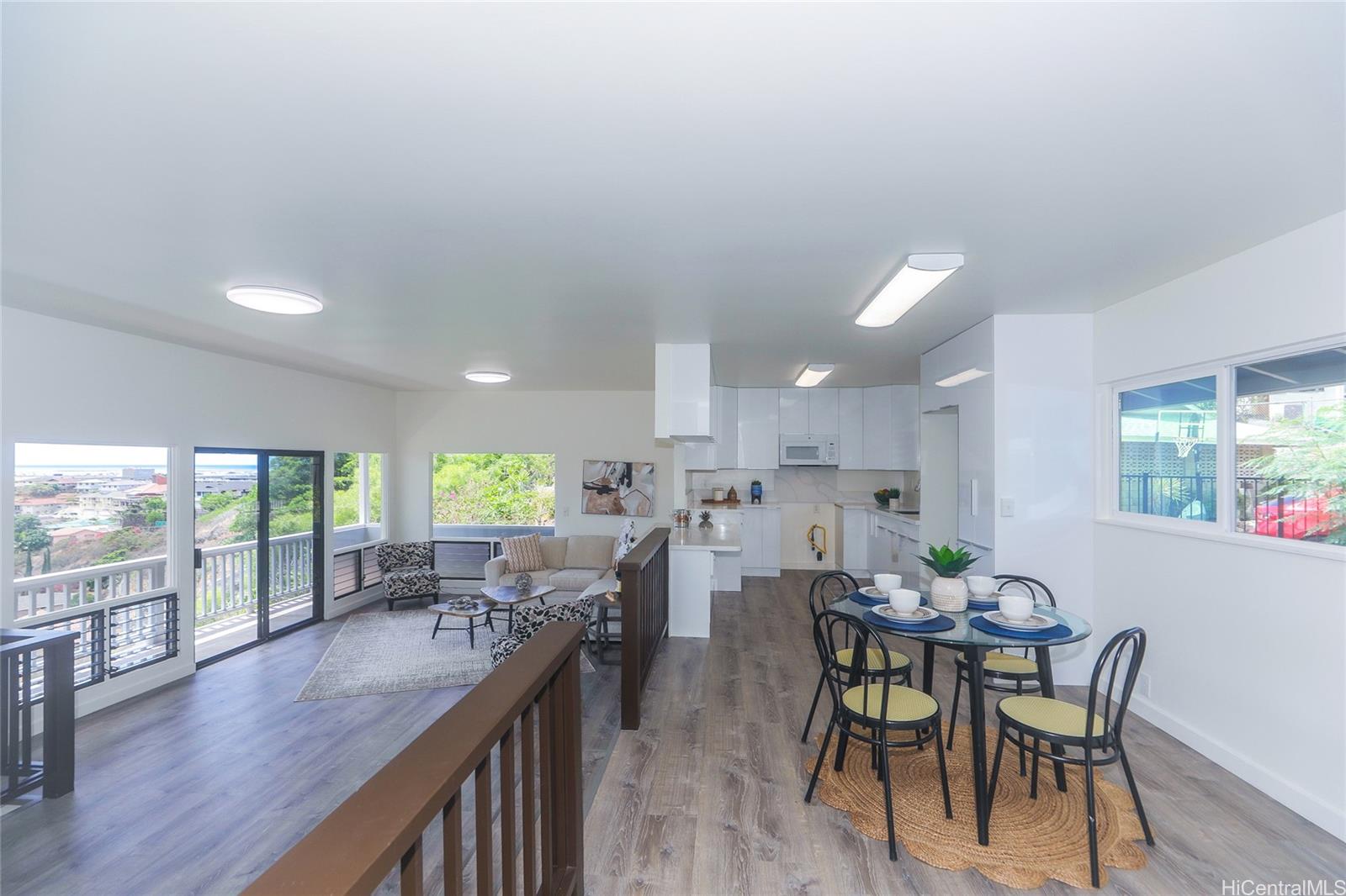 One of the BEST VIEWS in Salt Lake. Spectacular views and wonderful, cool trade winds. Located in a cul-de-sac, this home offers 4 bedrooms and 3 full baths, family room and a large, spacious basement. Brand new kitchen, brand new flooring, brand new paint. The street level offers kitchen, dining area, living area, primary bedroom suite with ensuite, second full bathroom and exterior entrance from the carport. The lower level offers 3 bedrooms, another family room, 1 full bathroom, laundry area, separate exterior door. Wrap around balconies on two levels. Huge basement for additional storage or living area. Lots of yard space with 4 terraces of garden area. This is a must see, hurry and call your Realtor for a showing! To be sold in "AS-IS" condition. Moanalua Middle and Moanalua High school district. 3D Virtual Tour available. Listing by: Island, REALTORS (808) 387-6874