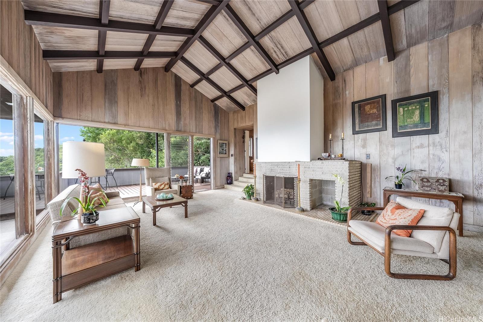 Step inside through a solid koa entry door to find warm redwood walls, a vaulted cedar ceiling with exposed beams, and expansive plate-glass windows that frame panoramic views of the city, ocean, and surrounding forest. Every detail speaks to craftsmanship and connection with the land, while the tropical landscaping by Richard C. Tongg, one of Hawai‘i’s pioneering landscape architects, enhances the home’s serene setting.