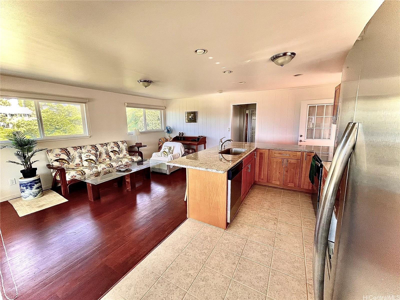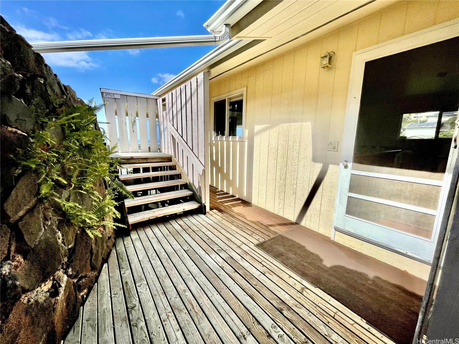 Downstairs Unit: A separate 2 bedroom, 2 bath unit with approx. 380 sq. ft. and one open parking space. Previously rented for $2200 / month, showcasing strong income potential. Covered lanai area has a tree setting feel with nice ocean views