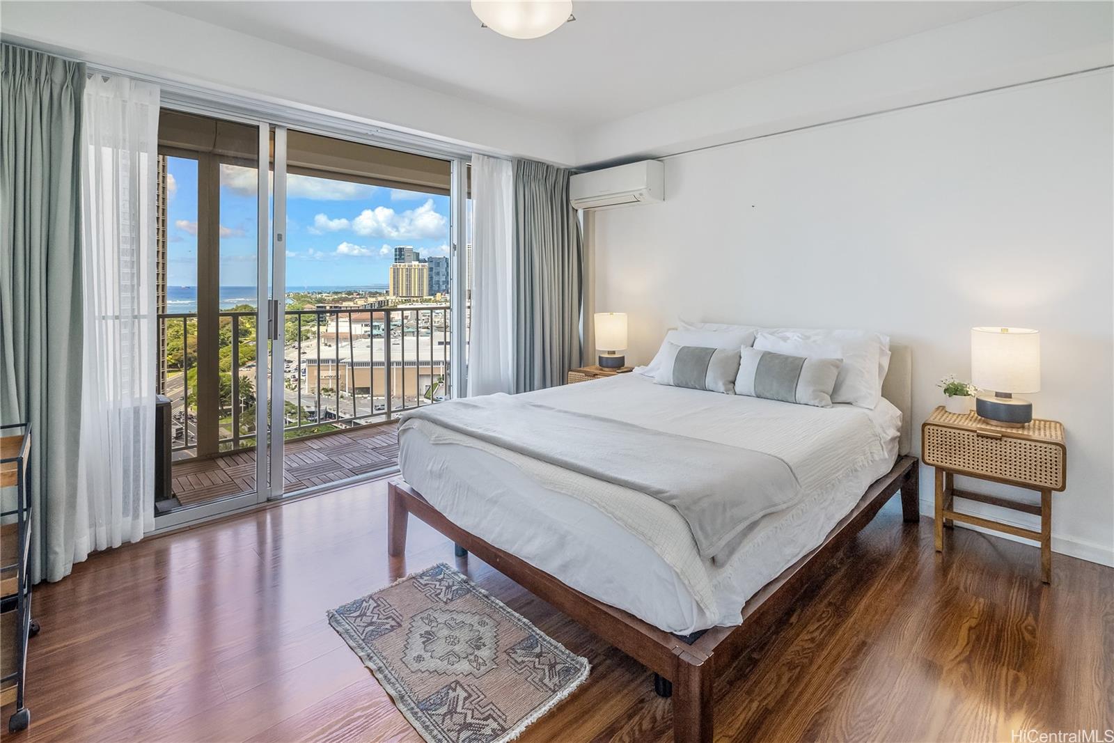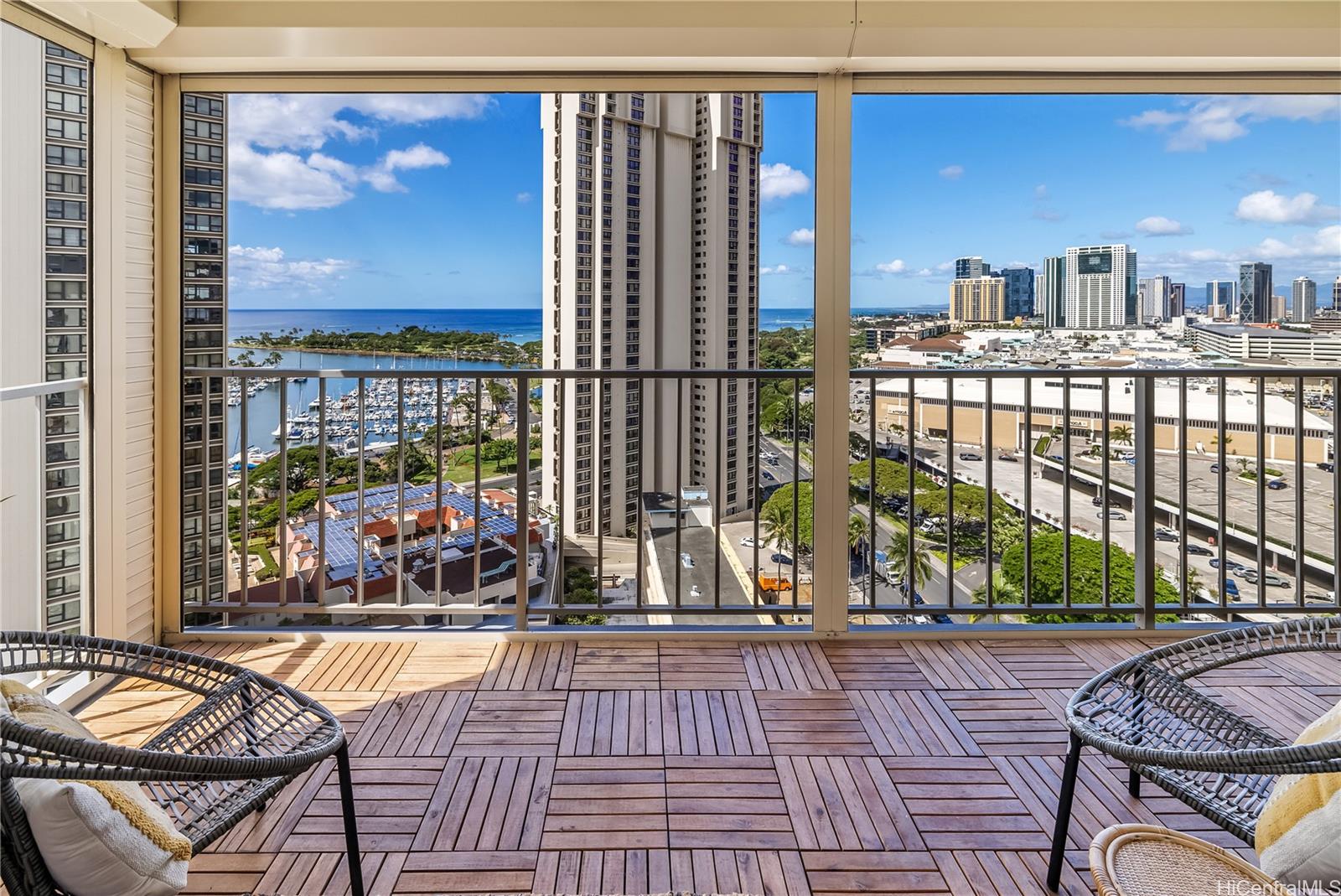 Sunset Towers #PH-2004 is rare find! Ideally located between Ala Moana and Waikiki, it's orientation is optimal for expereincing vibrant, surreal sunsets to inspire your soul! Offering a cosmopolitan lifestyle and stunning views from mountain to sea. This mid-century modern corner unit at the top of the buidling, features a generous wrap-around lanai (~273 sq. ft.) on the preferred Diamond Head (East) side, showcasing panoramic views of the ocean, harbor, canal promenade, Magic Island, and beyond. Floor-to-ceiling windows that invite natural light and breezes, emphasizing indoor-outdoor harmony. Thoughtful updates include motorized shades across the lanai, ideal for frequent travelers. Split AC units in every room ensure year-round comfort.