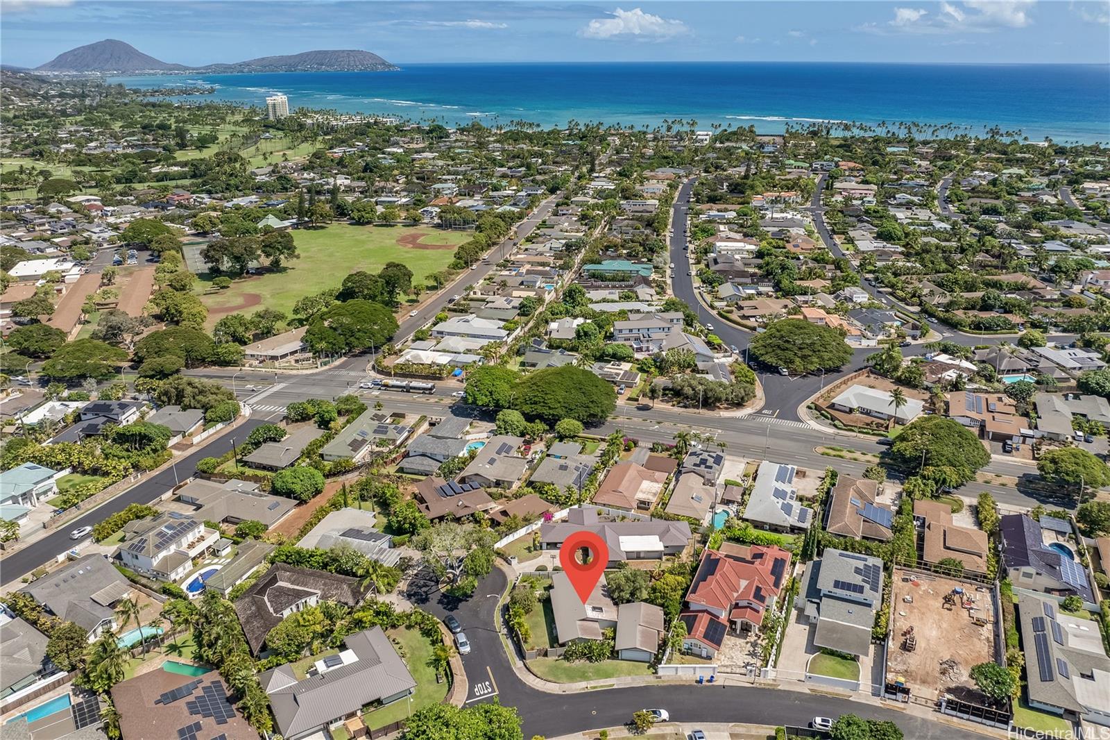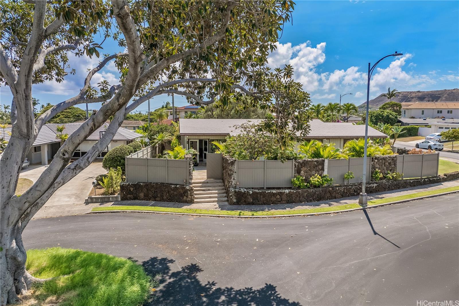 Discover this mid-century modern single-level home with mountain views perfectly situated on a spacious corner lot. Thoughtfully designed for both style and comfort, the home offers three bedrooms, each with its own private en-suite bathroom. Large windows invite natural light throughout, highlighting the home’s clean lines and timeless design. The expansive living room and dining room have soaring ceilings. The fully fenced property features a serene backyard anchored by a stunning olive tree, offering both beauty and privacy for outdoor living and entertaining. Ideally located in a cul-de-sac, close to the beach, and Kahala Mall with Whole Foods, movie theaters, boutique shops, and restaurants. This property also has easy freeway access. Living and garage square footage are as per 2022 appraisal. Don't miss this architectural gem. Listing by: Coldwell Banker Realty (808) 596-0456