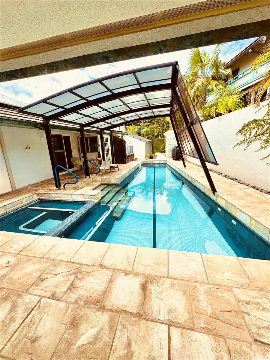 Seize the opportunity to own a coveted residence in the prestigious Diamond Head neighborhood, steps from Kaikoo's sparkling waters. This stunning home boast Ocean & Sunset views from the grand living/dining room and primary bedroom even captures views of Diamond Head. Elegant hardwood floors grace the living and dining areas, with stylish vinyl plank in bedrooms. Relax in the solar-heated pool/jacuzzi, covered by an awning to protect you from the elements. Spacious kitchen offers ocean views while washing the dishes and connects to the pool and the large two car garage, also in the back of kitchen is a convenient laundry room. A new gate ensures security, w/ parking for 5 cars or more. Eco-friendly features include photovoltaic panels, solar pool heating, and a Tesla battery backup system for the entire home. A Bonus downstairs suite w/ separate entrance, 3 bedrooms (one used currently as storage), 3 baths, kitchen, and living area offers versatility. Ready for your personal touch, this rare coastal retreat blends luxury and location. Don't miss out and schedule your tour today! Seller has beautiful renderings that can be available. Close to Mall w/Wholefoods,CVS, & more... Listing by: Coldwell Banker Island Prop (808) 875-7000