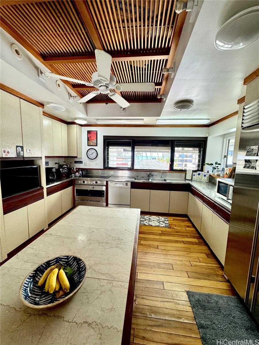 string(1200) "Seize the opportunity to own a coveted residence in the prestigious Diamond Head neighborhood, steps from Kaikoo's sparkling waters. This stunning home boast Ocean & Sunset views from the grand living/dining room and primary bedroom even captures views of Diamond Head. Elegant hardwood floors grace the living and dining areas, with stylish vinyl plank in bedrooms. Relax in the solar-heated pool/jacuzzi, covered by an awning to protect you from the elements. Spacious kitchen offers ocean views while washing the dishes and connects to the pool and the large two car garage, also in the back of kitchen is a convenient laundry room. A new gate ensures security, w/ parking for 5 cars or more. Eco-friendly features include photovoltaic panels, solar pool heating, and a Tesla battery backup system for the entire home. A Bonus downstairs suite w/ separate entrance, 3 bedrooms (one used currently as storage), 3 baths, kitchen, and living area offers versatility. Ready for your personal touch, this rare coastal retreat blends luxury and location. Don't miss out and schedule your tour today! Seller has beautiful renderings that can be available. Close to Mall w/Wholefoods,CVS, & more..."
