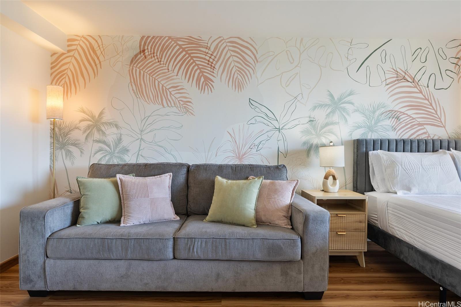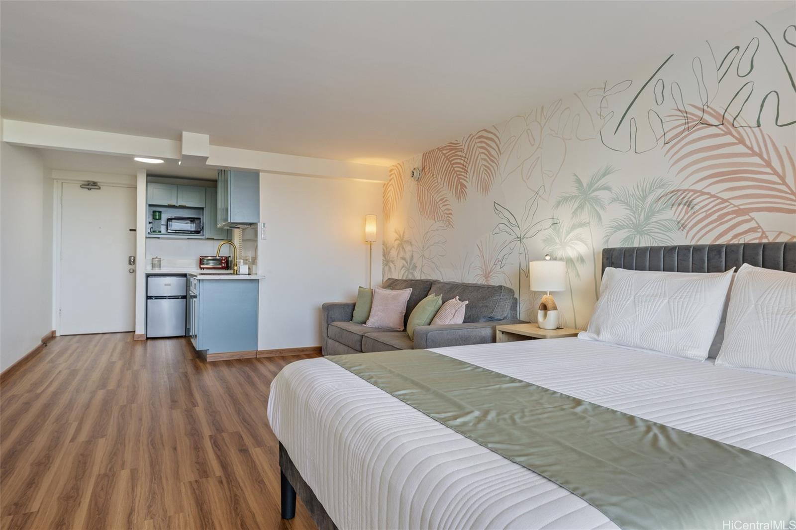 Designed and optimized specifically for short-term vacation rentals, this unit is fully legal for STR in Honolulu, offering strong income potential in one of Waikiki's most sought-after locations. Recent renovation includes new flooring, updated kitchen with stainless appliances, contemporary bathroom, fresh paint, and smart lighting/AC – turnkey ready for immediate hosting or personal use.