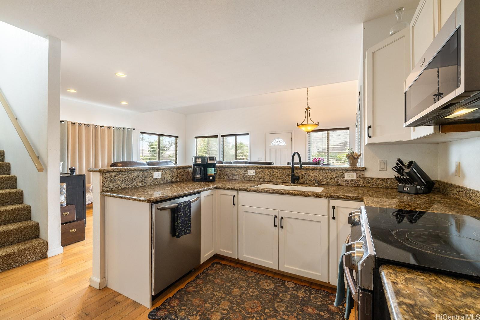 Enjoy a spacious, quiet, fully fenced yard with lush landscaping and a mature Apple Banana tree, perfect for relaxing or entertaining. The open-concept living, dining, and kitchen area features rich hardwood floors, while the kitchen offers granite countertops, ample cabinetry, and generous prep space.