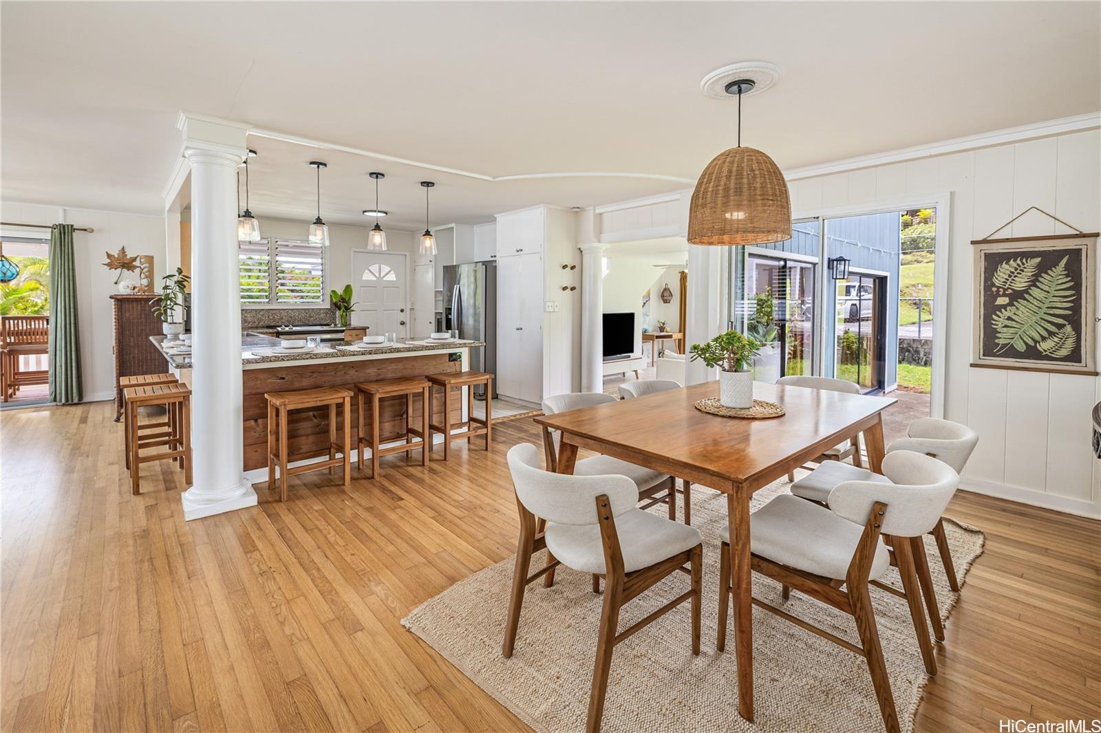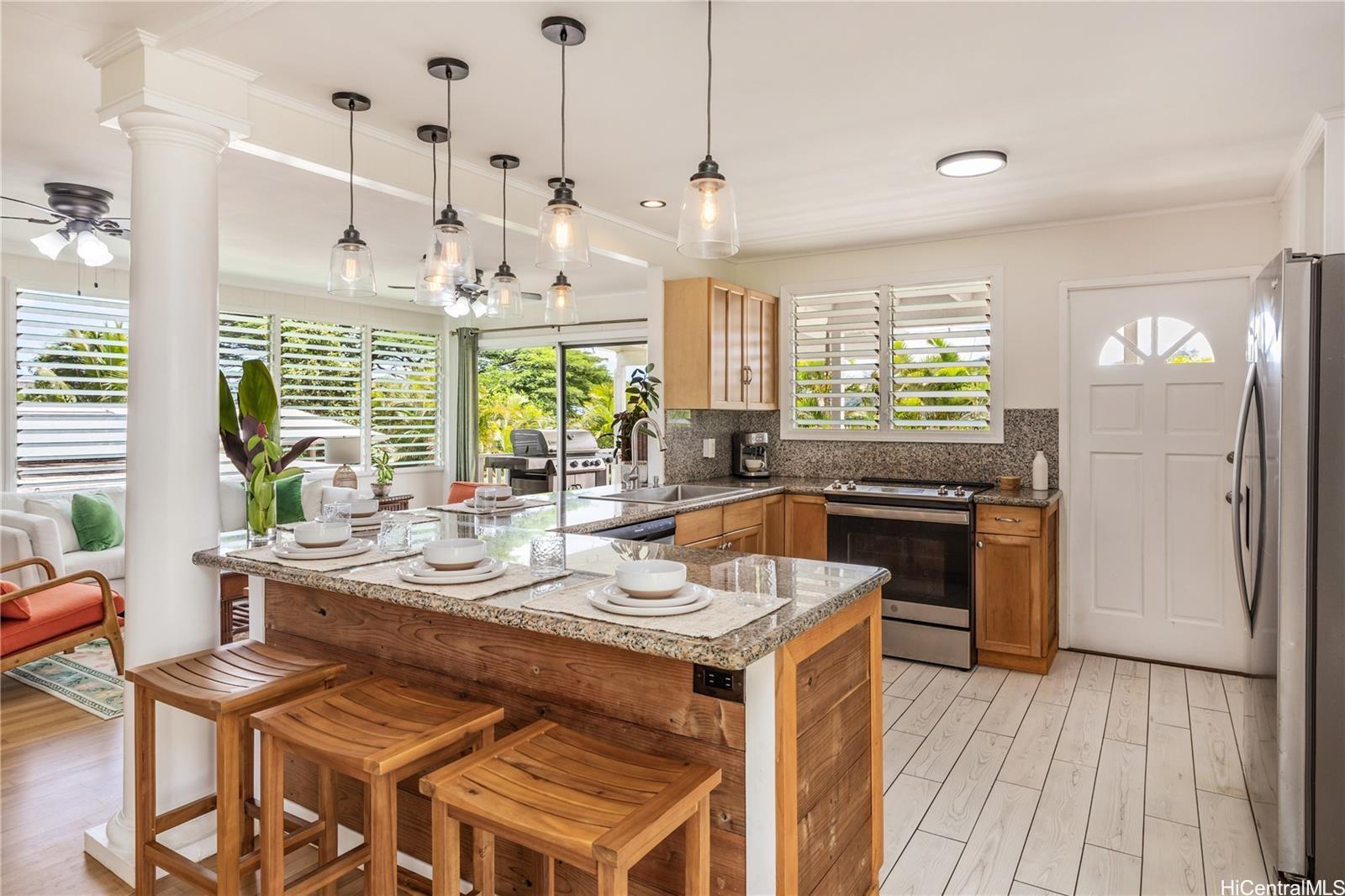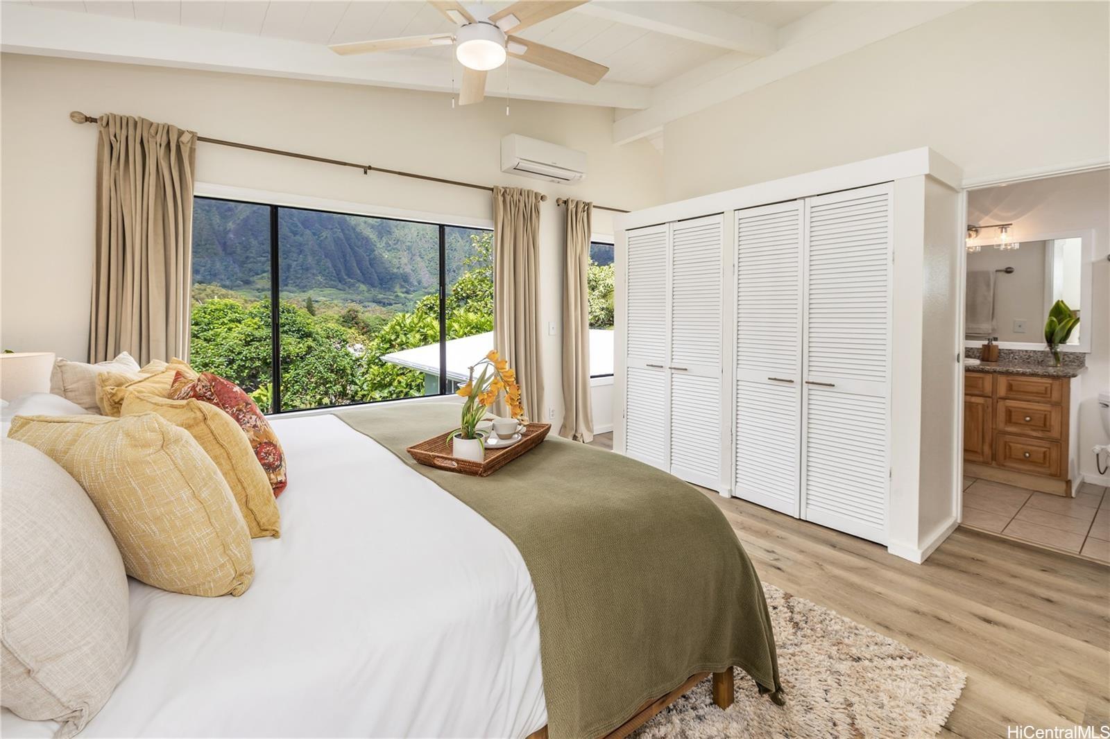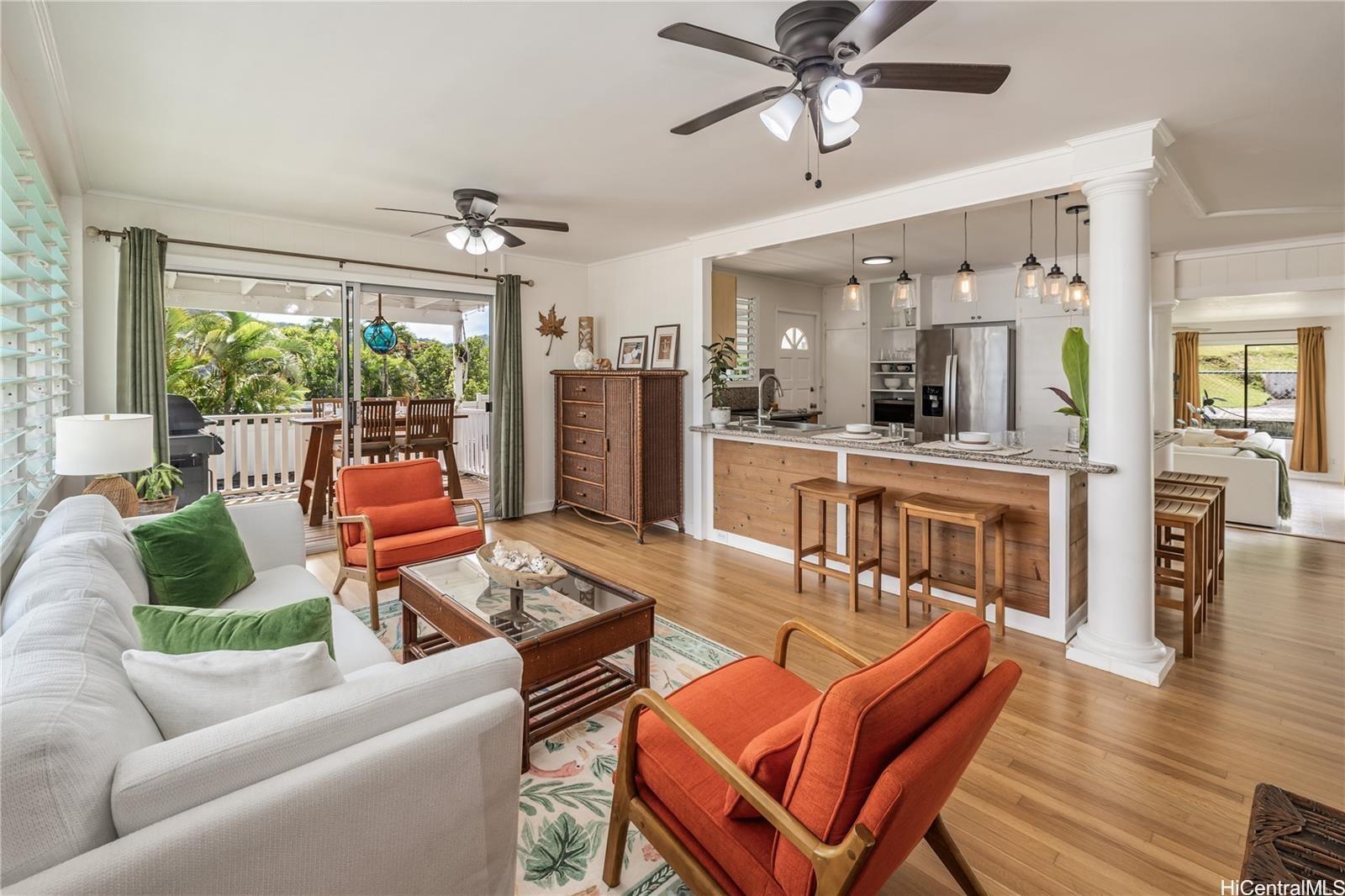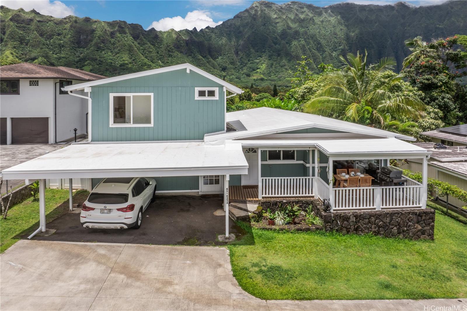 string(1191) "Gorgeous Ko`olau mountain views from this double sized property! The expansive, fenced, lush backyard features fruiting avocado and ulu trees. Two lots, which were purchased separately, were recently combined, creating one TMK. The wonderful front covered lanai opens to the living room and kitchen, perfect for indoor/outdoor living. The kitchen, in the heart of the home, offers expansive countertop seating for 5, a separate dining area, and views into the living room. The entertainment room is just off the kitchen area with large windows and a sliding door to the vibrant backyard. The main primary bedroom suite is on the top floor with incredible views of the striking mountains from the large windows, a high ceiling, split AC, ceiling fan, and en-suite bath. The main level features hardwood floors, great breezes, a second primary bedroom suite with an en-suite bath and walk-in closet, and two other bedrooms, all of which have split AC, hardwood floors, and ceiling fans. This wonderful home is conveniently located close to Kaneohe town, Kailua beaches, a dog park, Windward Mall, Le Jardin Academy, freeway access, and beautiful Ho`omaluhia Botanical Gardens. A must-see home!"