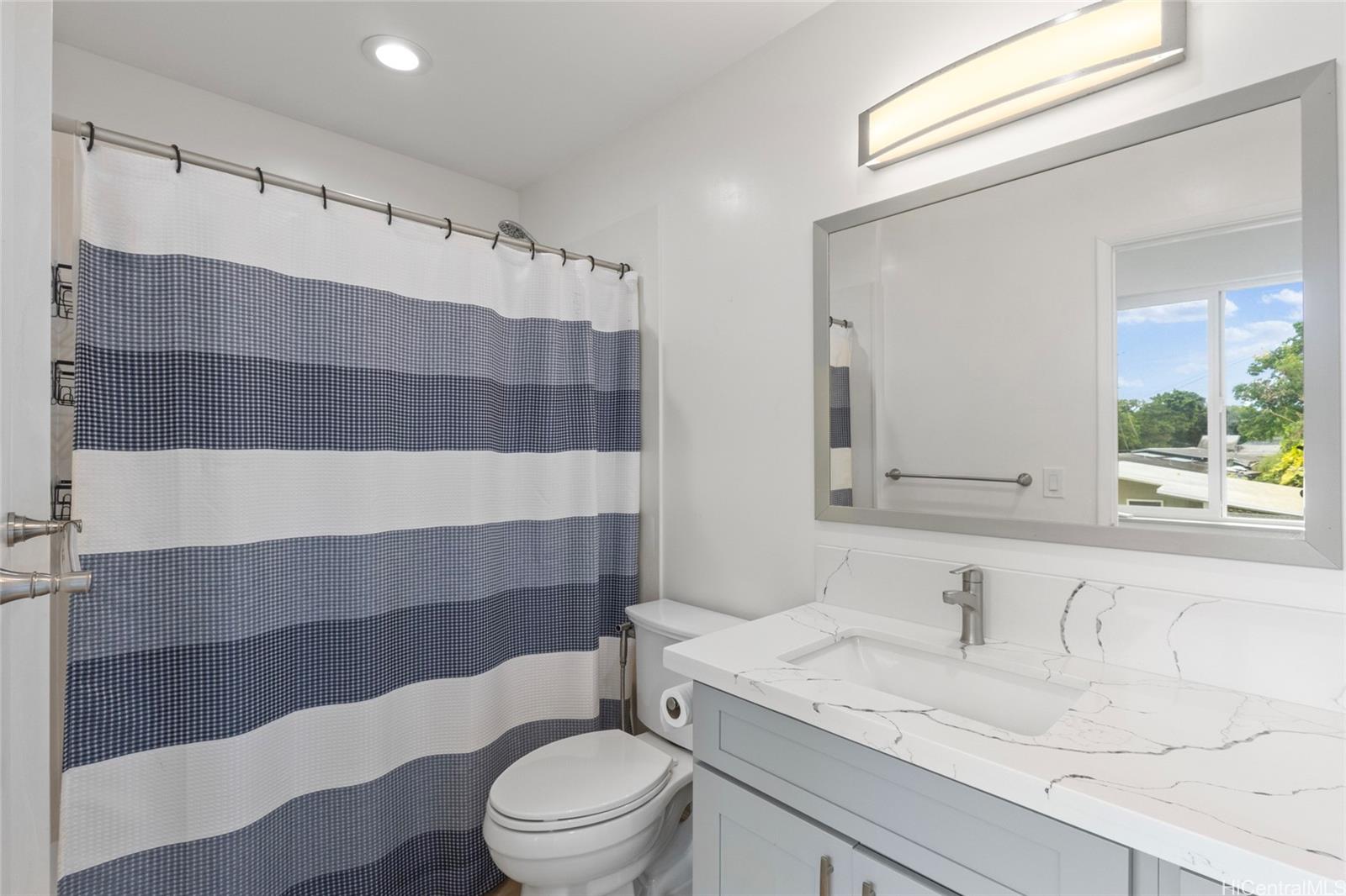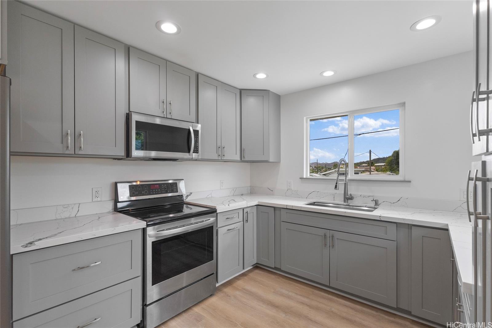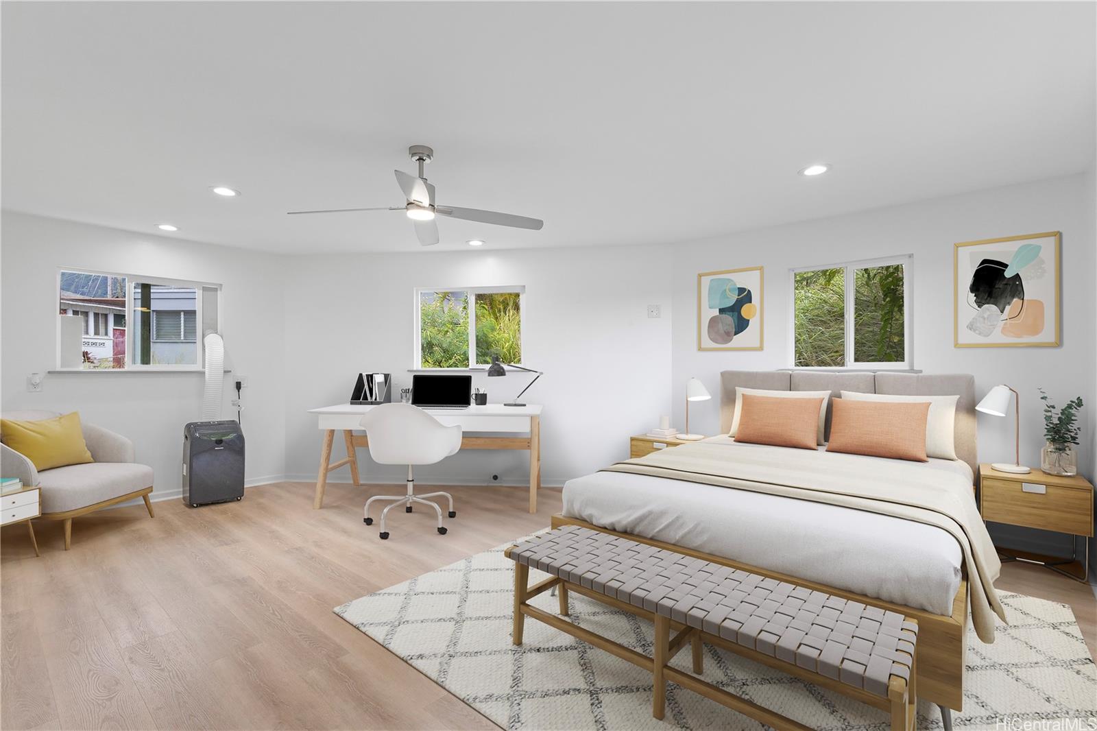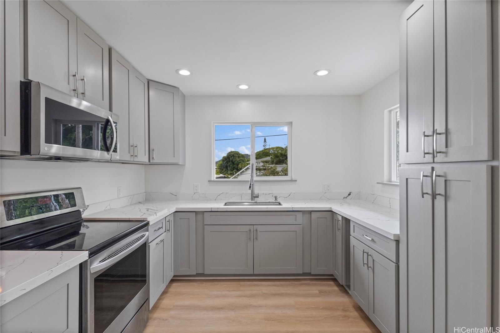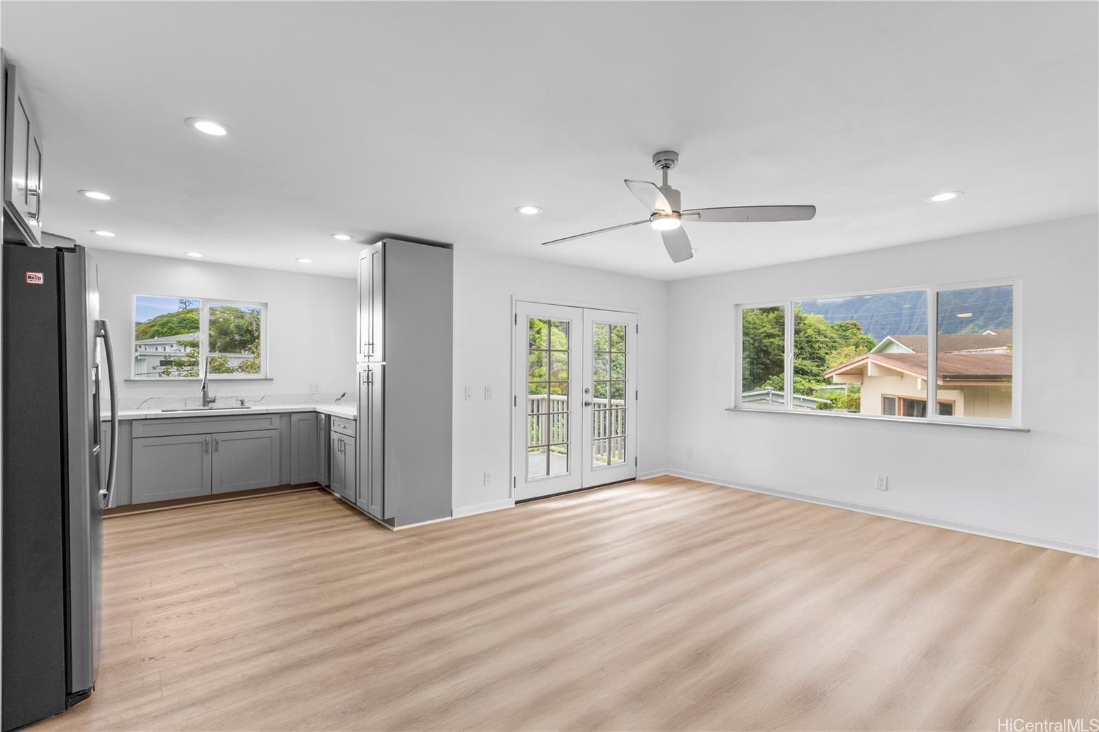 Discover the best of both worlds in this practically brand-new home nestled within the private "Windward Villa" community. Originally a classic cottage, this residence was completely rebuilt in 2019, resulting in a spacious and modern 5-bedroom, 3.5-bath home designed for today's lifestyle. The smart "reverse" floor plan places the main living areas upstairs to maximize light and breezes, featuring a sleek kitchen, an open living room with its own lanai, and the primary suite. A versatile den on this level is perfect for a home office or media room. Parking is a breeze with an oversized carport that accommodates two cars and ample guest parking. Relax on your covered back patio or enjoy the low-maintenance side yard. This is a unique opportunity to own a detached single-family home where the monthly fee conveniently covers water, sewer, and private roadway maintenance. This is not just a home; it's a carefree lifestyle in the heart of Kaneohe. 2.5% VA Assumption available to VA Buyers. Listing by: eXp Realty (808) 650-3040