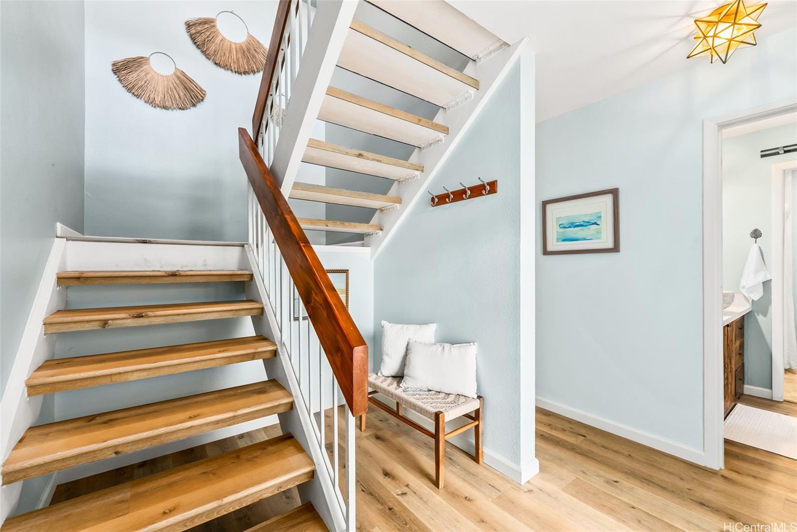 Blending nature and serenity, this 3 bedroom, 2 bath unit with a deeded boat slip, combines the feel of a tropical oasis with the beauty of the surrounding Ko’olau mountains and grandeur of Kaneohe Bay. Second floor vaulted ceilings with exposed wood beams provides an open flow to one of 4 private lanais where you can enjoy a beverage of choice or relax and meditate to the sounds of nature. Recently updated kitchen with a gorgeous monkeypod bar top will have you excited to create and/or host lavish get togethers with family and friends. Feel transported to a luxurious spa when you step into the recently updated bathrooms. Enclosed, private back yard space which leads to an outdoor grassy area is perfect for fur friends and keiki. Makani Kai Marina is a gated, pet-friendly community sitting on the waterfront of Kaneohe Bay. You’ll have access to the pool, rec room, grilling spaces as well lots of guest parking. Don’t own a boat? Rent out your slip for monthly income!
