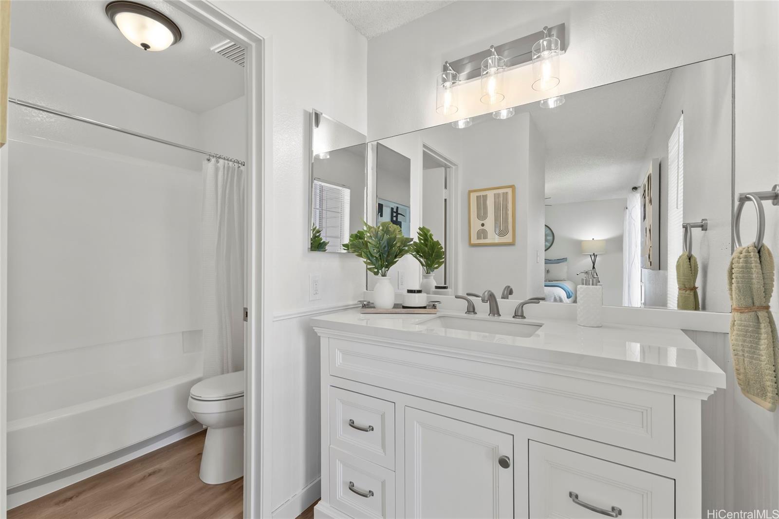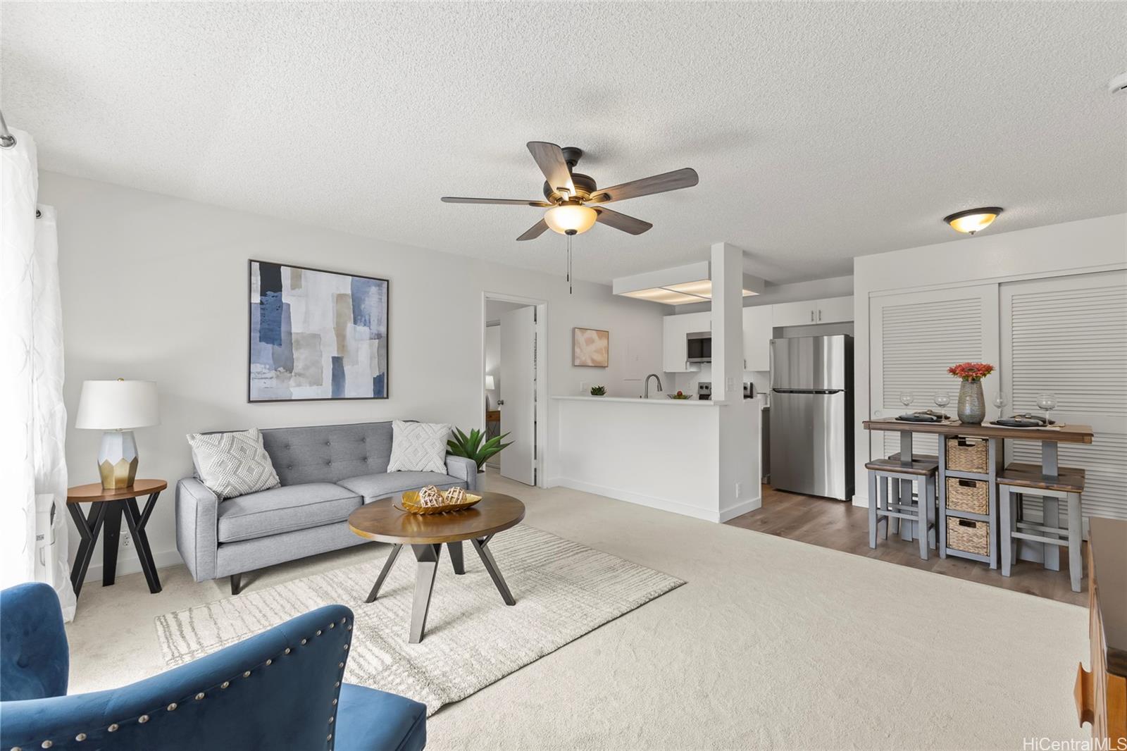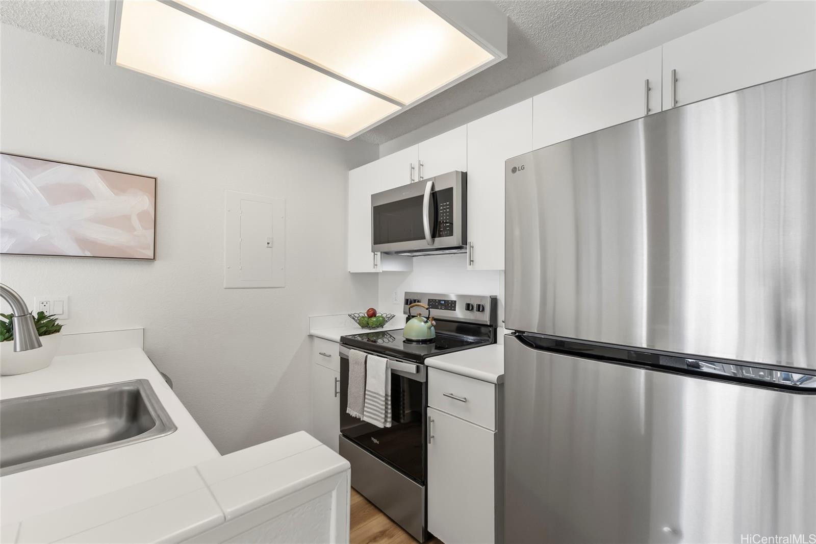 Rarely available 2-bedroom, 2-bathroom, 2-parking unit with a highly desirable layout — bedrooms on each side and the living room in the center for easy use and privacy. Recently remodeled with all brand-new stainless steel appliances including refrigerator, oven/stove, dishwasher, microwave, and disposal, plus a new washer and dryer. Each room is equipped with its own AC. The unit features new vinyl and carpet flooring and fresh paint throughout. Beautifully renovated and move-in ready! Conveniently located near shopping, restaurants, freeway access, and more. Listing by: List Sotheby's Int'l Realty (808) 735-2411
