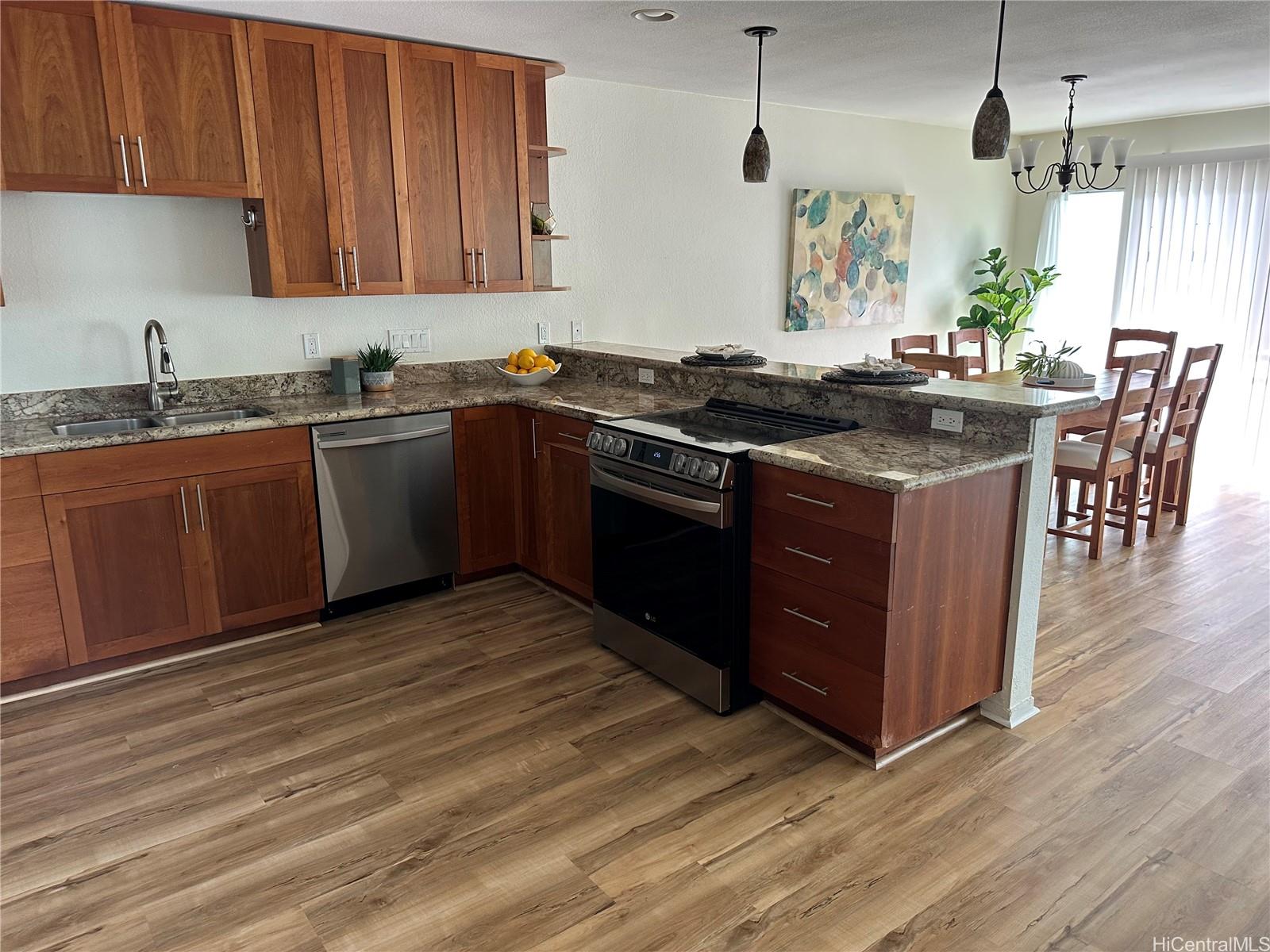 [0] => This spacious 4-bedroom, 2.5-bath condo in Kaneohe offers a perfect balance of comfort and style. With luxury vinyl plank flooring throughout, the open living and dining areas create a welcoming flow. The modern kitchen features newer appliances and plenty of storage space, ideal for both cooking and entertaining. The primary bedroom includes a cozy sitting area, providing a private space to unwind. The 2-car garage adds convenience and extra storage. An end unit with a lovely back yard facing the gorgeous Ko'olau mountains will not disappoint! Conveniently located near local amenities, beaches, and hiking trails, this condo offers the ideal mix of luxury and practicality. First open house, Sunday, April 6th, 2-5PM.