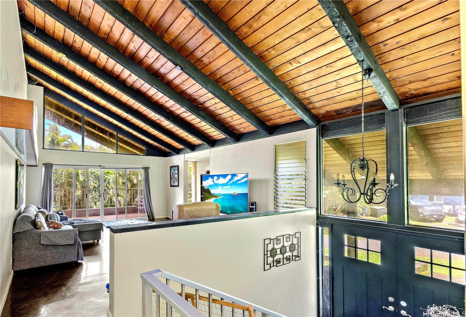 [0] => This is your chance to own a truly unique property in a peaceful, low-traffic neighborhood. Nestled on 1.456 acres, this expansive property features a spacious concrete/masonry home perched to capture the beautiful views of Ahuimanu and the majestic Koolau Mountain range. Perfect for entertaining, the home includes a large living room with soaring ceilings, a separate family room, a generous sized kitchen, and an expansive covered wrap around lanai-ideal for indoor/outdoor living. The lower level offers a private one-bedroom, one-bathroom guest suite with it's own kitchenette. A leased photovoltaic (PV) system is also included to help reduce your monthly electric costs. Don't miss this rare opportunity to own a special piece of Windward Oahu. Bedroom and bathroom count may not match tax records.