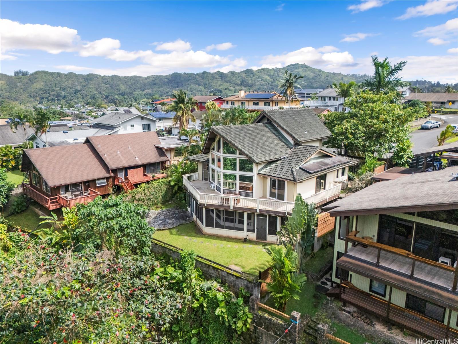 string(1203) "Located on a quiet street in Ahuimanu, this 4 bed / 3 bath, 2390 sf house, has a very open floor plan complemented by huge picturesque windows with awesome panoramic Koolau views and plenty of natural light. There is 448-sf lanai directly off the living/dining room that is perfect for indoor/outdoor living, and fantastic for entertaining. The 9,450-sf lot is very private, nicely landscaped, terraced, and perched above Kahalu’u Stream which flows right behind your back yard. The versatile floor plan is ideal for a big family. There are 2 beds/2 baths upstairs with a full kitchen and 2 beds/1 bath, wet bar, and a 336sf screen in porch downstairs. There is an interior staircase between all 3 levels but also a separate entrance for downstairs so it very easily could be used for one big family, multigenerational living, or rental income. Additional features include a Monier tile roof, solar water heater, ceramic tile, hardwood floor, enclosed garage, and a driveway big enough for 2+ cars. Priced below assessed value for a quick sale, it’s in good shape, has solid bones, and with a little bit of updating this house could easily shine again. Come to the first open house on 3-1-26, 2-5pm."