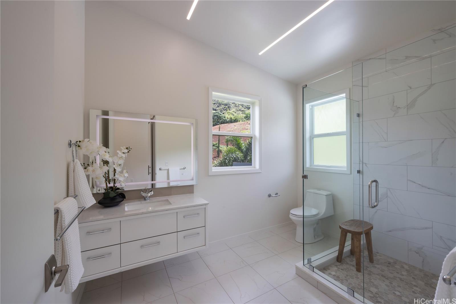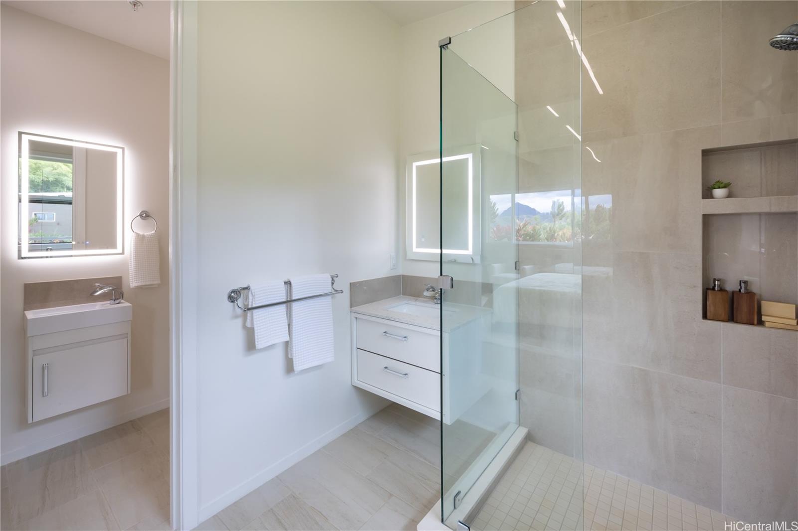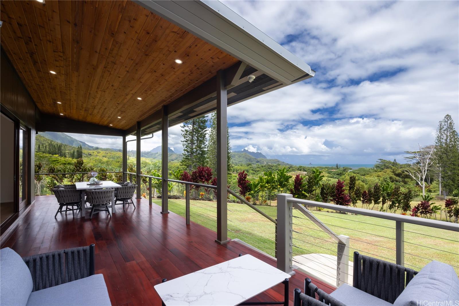 Prominently situated at the base of the Ko‘olau Mountain, a newly built Luxury Country Estate is a rare opportunity for a discerning Buyer seeking views, land, location, & privacy. Spanning over 4 acres above a neighborhood of Cacao Farming, this private Retreat offers breathtaking panoramic views of the ocean, and lush mountain cliffs. A thoughtfully designed residence showcasing soaring ceilings, mahogany framed glass doors from floor to ceiling for seamless indoor-outdoor living. Custom finishes include monkeypod stair treads, tigerwood lanais, custom LED recessed lighting (converts to 12 volts), and 8’ doors throughout. The Chef’s kitchen features 2 sinks, an oversized island - perfect gathering area for the Holidays or entertaining, a 6-burner range/2 ovens with pop-up hood. Primary suites, 1 on each level, offer spa-inspired bathrooms, walk-in closets and a private balcony upstairs. SUSTAINABILITY meets SOPHISTICATION. Owned PV system, tropical landscaping & gated driveway entry. BONUS unattached 900sf workshop. Tucked away for serenity yet minutes from conveniences, this is Hawai‘i living at its finest. Conveyed w/TMK 1-4-7-5-41-1/MLS #202519988. Listing by: Berkshire Hathaway HmSvc HI RE (808) 351-2281