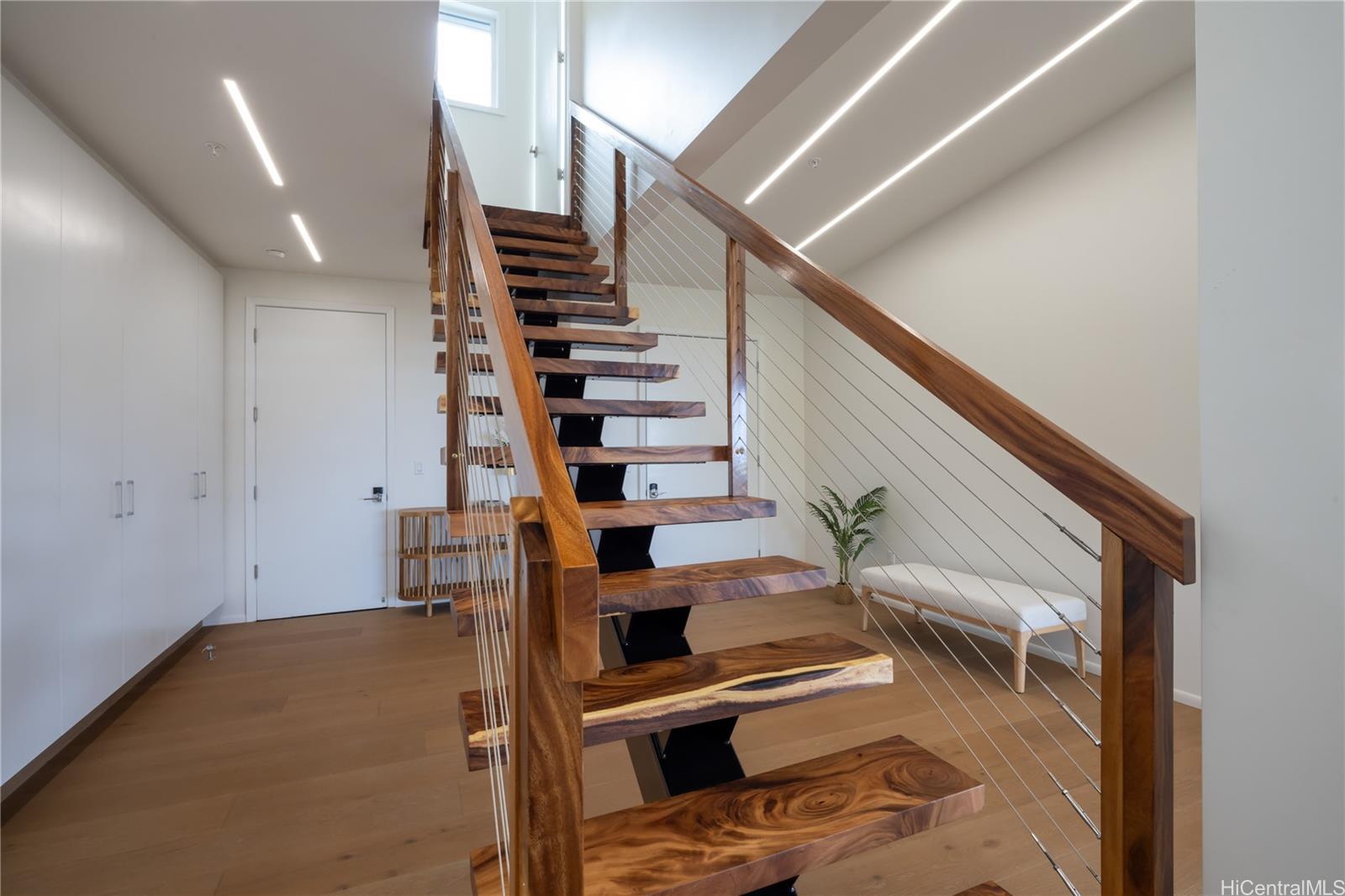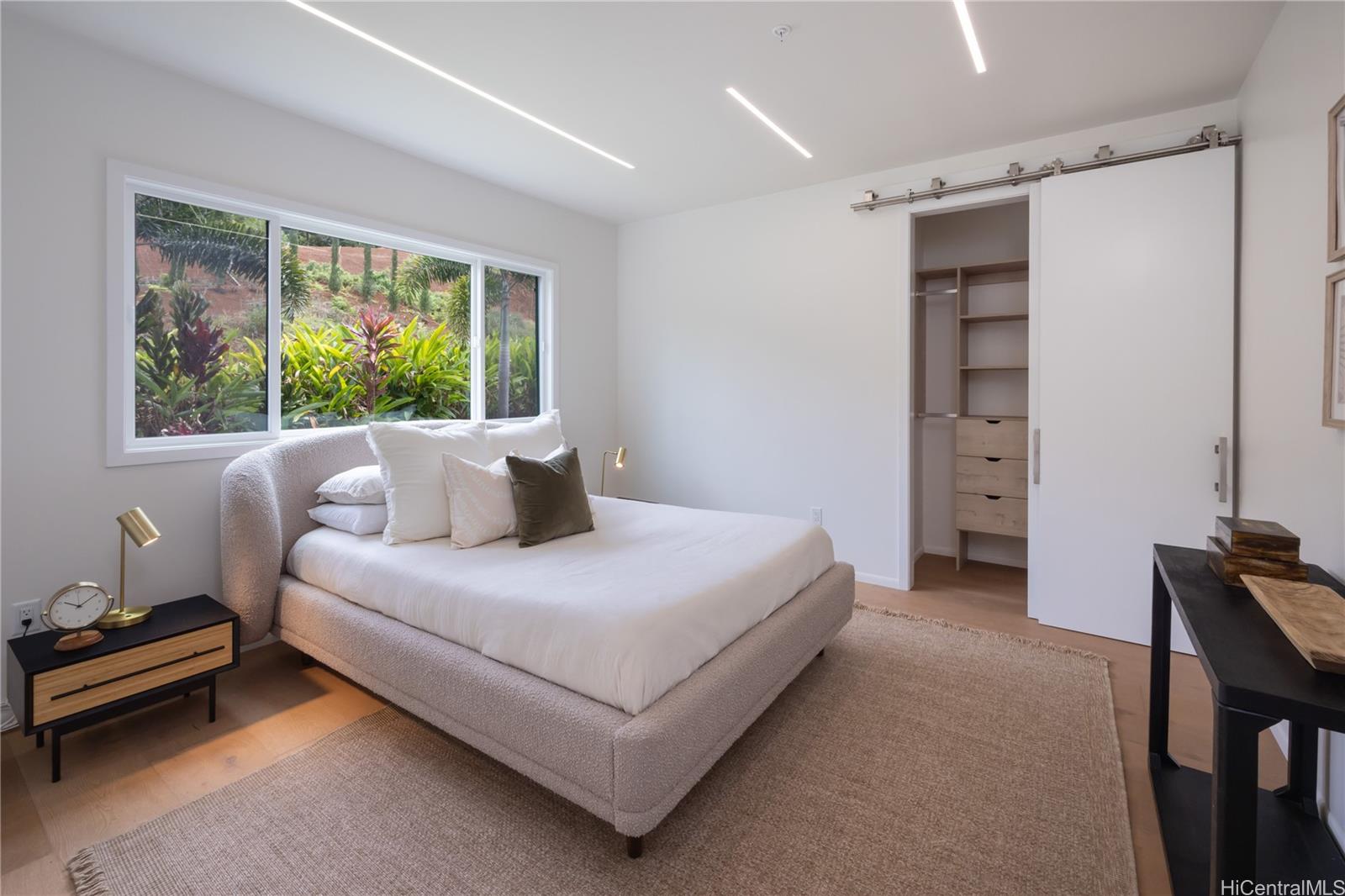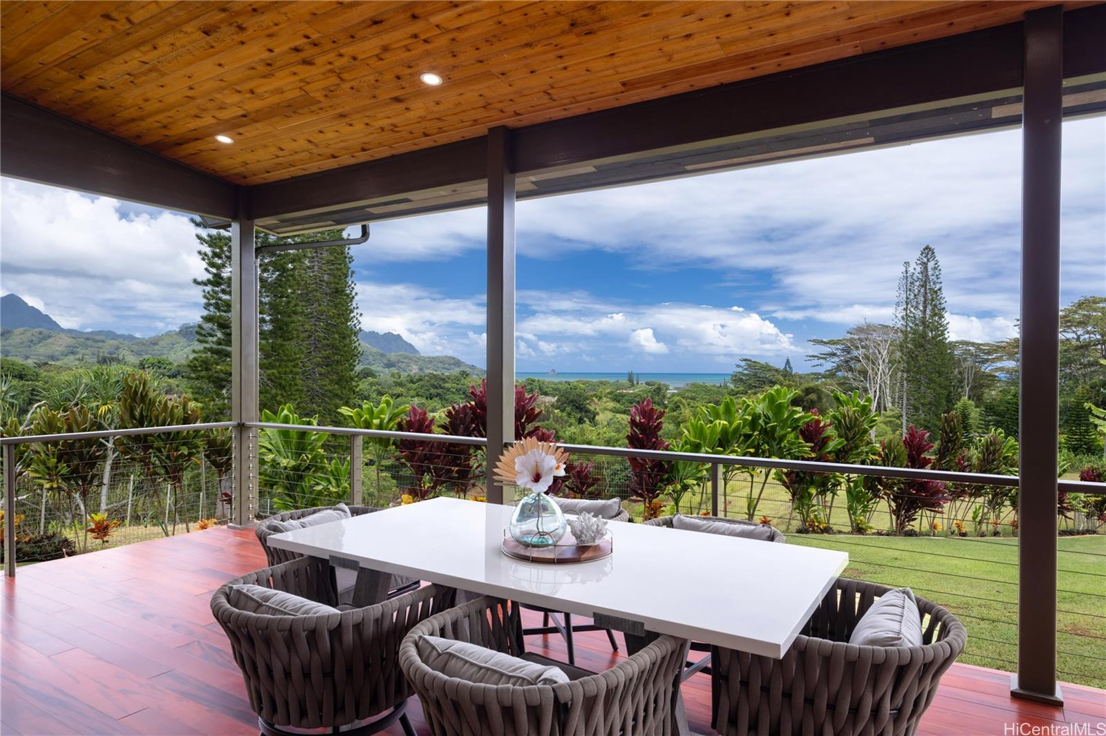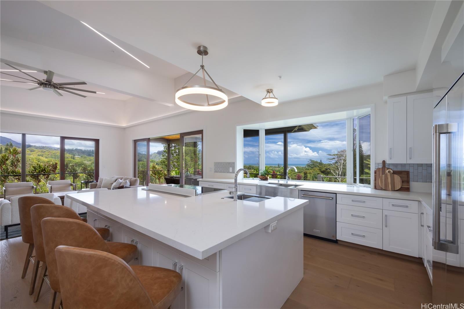 [0] => Prominently situated at the base of the Ko‘olau Mountain, a newly built Luxury Country Estate is a rare opportunity for a discerning Buyer seeking views, land, location, & privacy. Spanning over 4 acres above a neighborhood of Cacao Farming, this private Retreat offers breathtaking panoramic views of the ocean, and lush mountain cliffs. A thoughtfully designed residence showcasing soaring ceilings, mahogany framed glass doors from floor to ceiling for seamless indoor-outdoor living. Custom finishes include monkeypod stair treads, tigerwood lanais, custom LED recessed lighting (converts to 12 volts), and 8’ doors throughout. The Chef’s kitchen features 2 sinks, an oversized island - perfect gathering area for the Holidays or entertaining, a 6-burner range/2 ovens with pop-up hood. Primary suites, 1 on each level, offer spa-inspired bathrooms, walk-in closets and a private balcony upstairs. SUSTAINABILITY meets SOPHISTICATION. Owned PV system, tropical landscaping & gated driveway entry. BONUS unattached 900sf workshop. Tucked away for serenity yet minutes from conveniences, this is Hawai‘i living at its finest. Conveyed w/TMK 1-4-7-5-41-1/MLS #202519988.