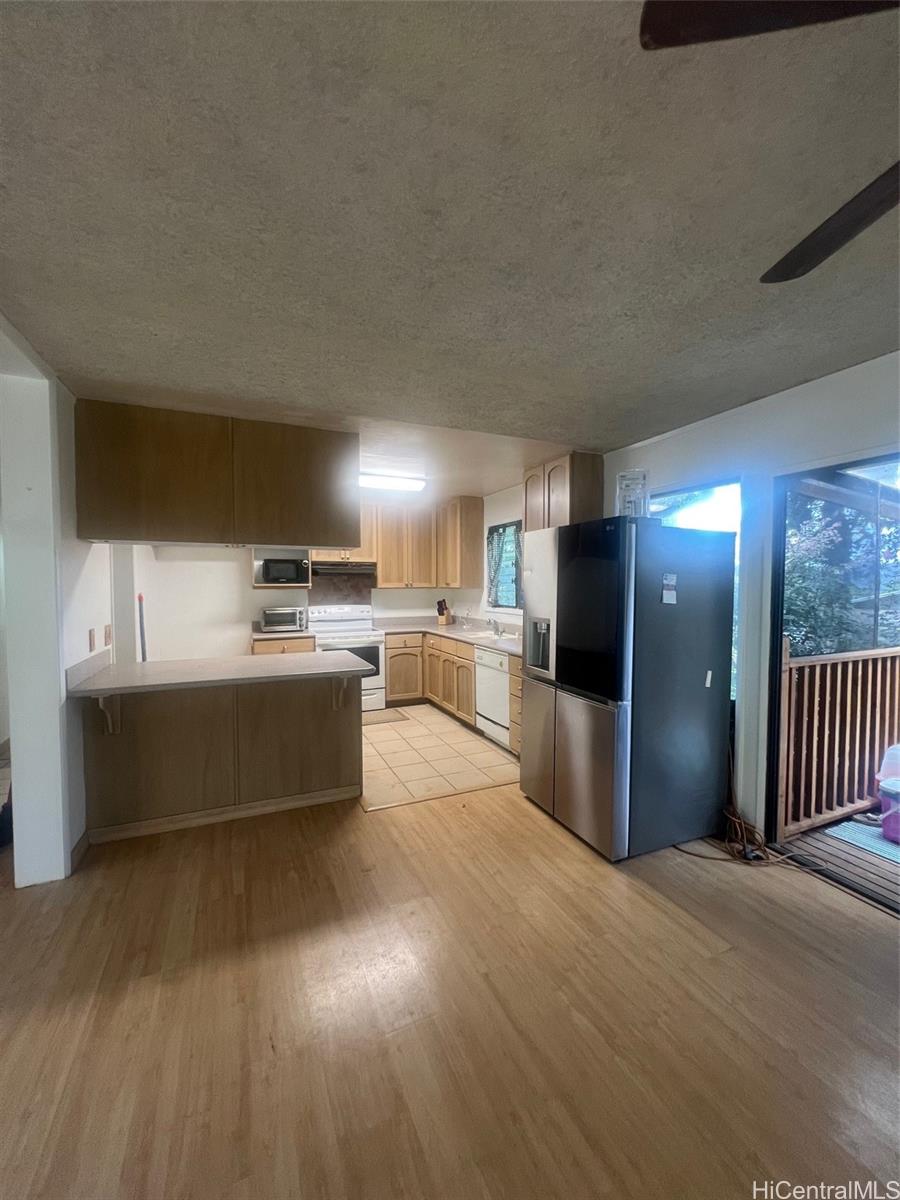 [0] => Welcome home to a 3 bedroom, 2 bath, 1200 sq ft home in Ahuimanu, Kaneohe. This home features laminate flooring, ceramic tile in kitchen and vinyl flooring in bathrooms. Spacious open floor plan for the living room, dining room and kitchen. The 3 bedrooms and 2 bathrooms are located down the hallway along with the washer and dryer. There is an enclosed screened patio which is currently used for her cats and can be used as a relaxing area to read the paper while enjoying a cup of tea. A spacious room attached to the garage can be used for an office, art studio, or workshop. Over 10,000 sq ft of land overlooks the majestic Ko'olau Mountains including seasonal waterfalls, lush trees and green grass. Enjoy peaceful country living yet only minutes away from shopping centers and Kaneohe town.