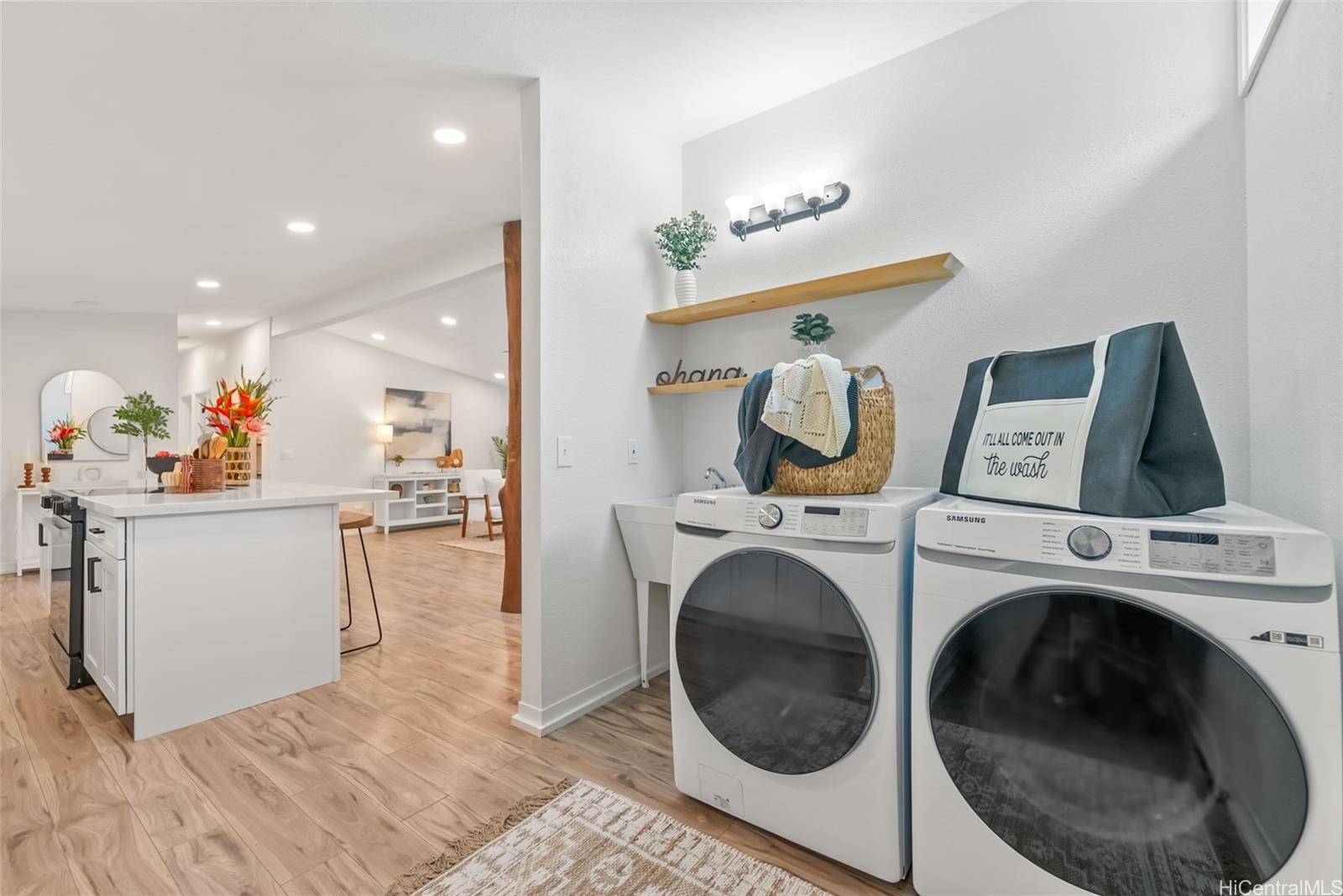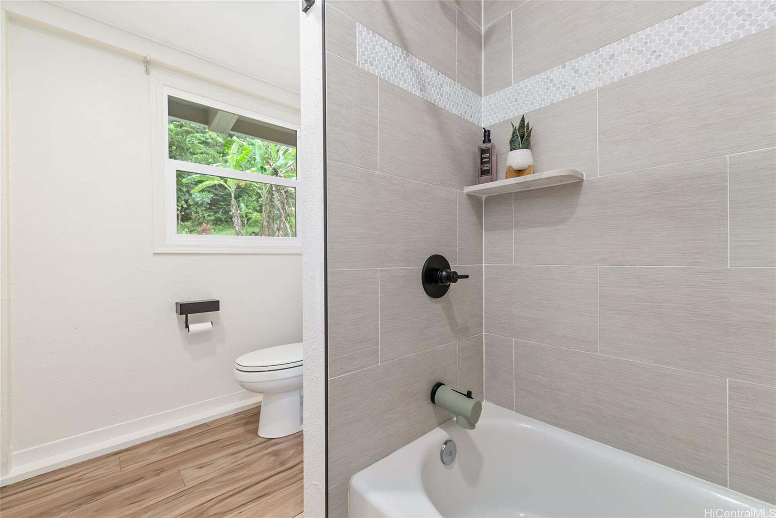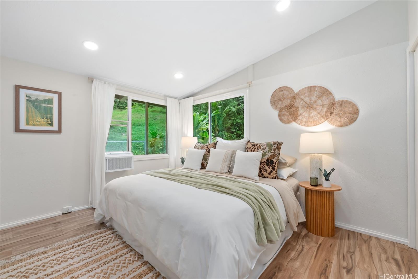 This cozy home is situated at the entrance of over 8 acres of lush greenery, offering a truly tranquil escape from city life. While reaching the upper portion of the property is a hike, it rewards you with absolutely spectacular views. The level area of the lot features a spacious enclosed yard and a separate, thriving vegetable and herb garden. Inside, the home boasts a bright, open-concept floor plan with high vaulted ceilings. The numerous picture windows are perfectly positioned to capture the surrounding garden and majestic mountain views. The kitchen and laundry room feature newer appliances. Additionally, modern bathrooms and air conditioning makes for a comfortable and contemporary living experience. The large deck, approximately 360 square feet, provides ample space for outdoor entertaining and enjoying the clear night skies for stargazing. The convenience of this location—offering true island living with streams, hiking and beaches nearby while remaining accessible to Oahu’s major resources, including the main trauma center, Financial District, Military installations, and abundant dining and shopping—makes this a truly unique opportunity. Listing by: Hawaii Life (808) 392-1044