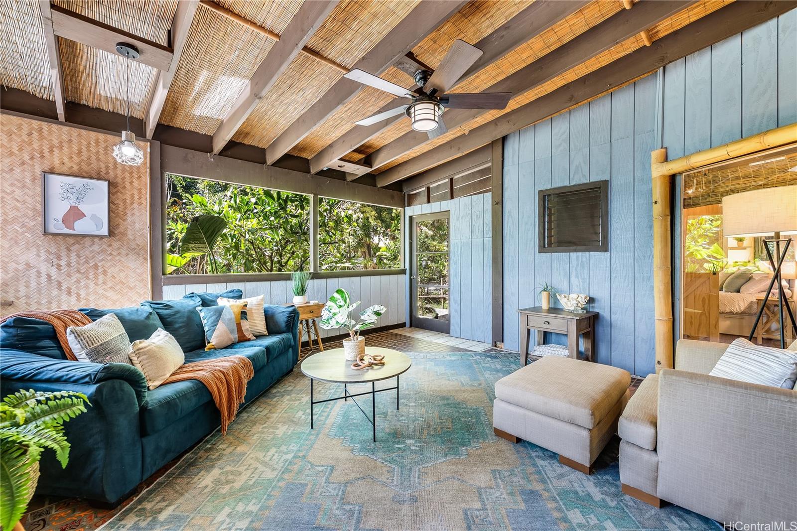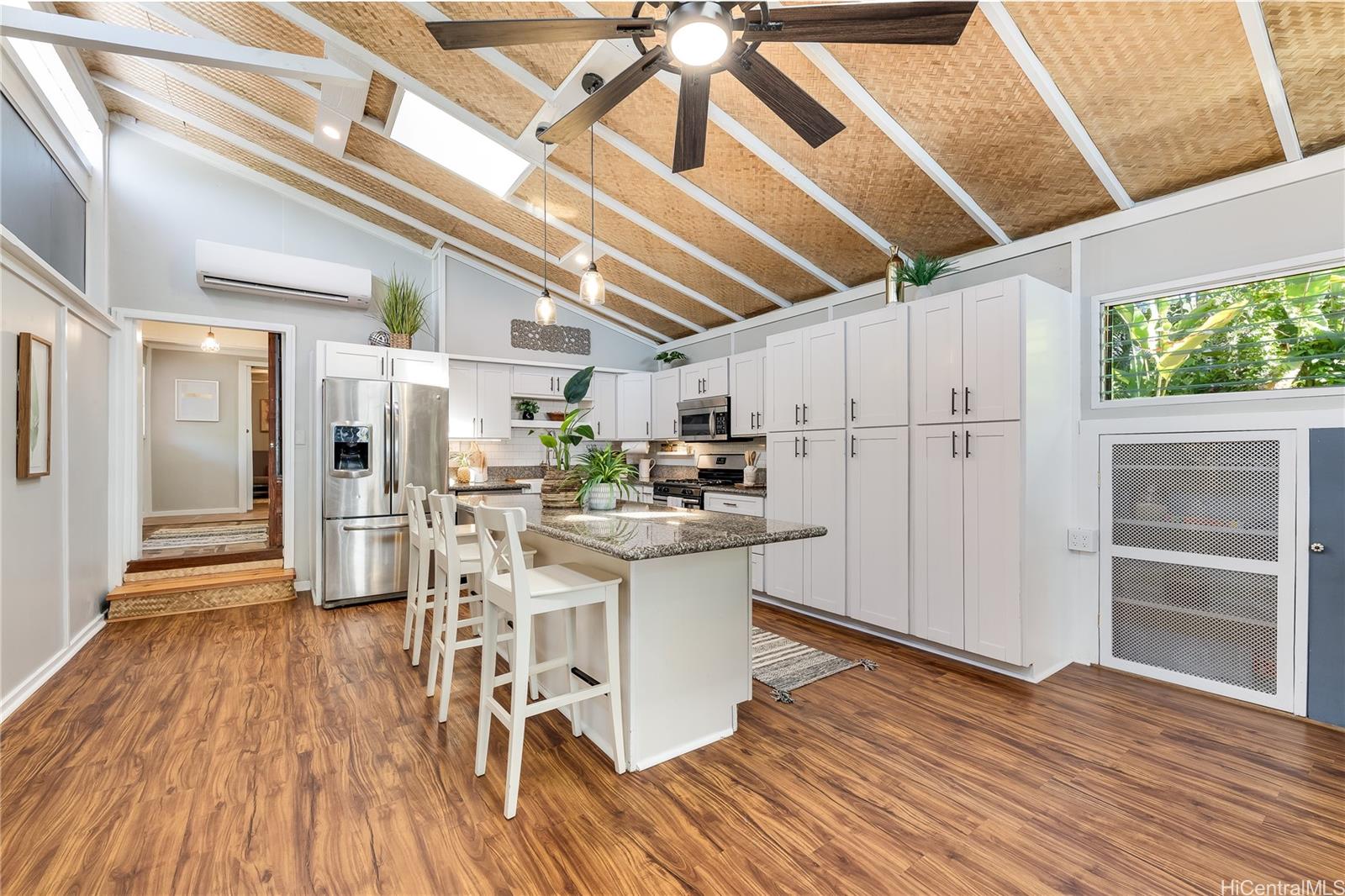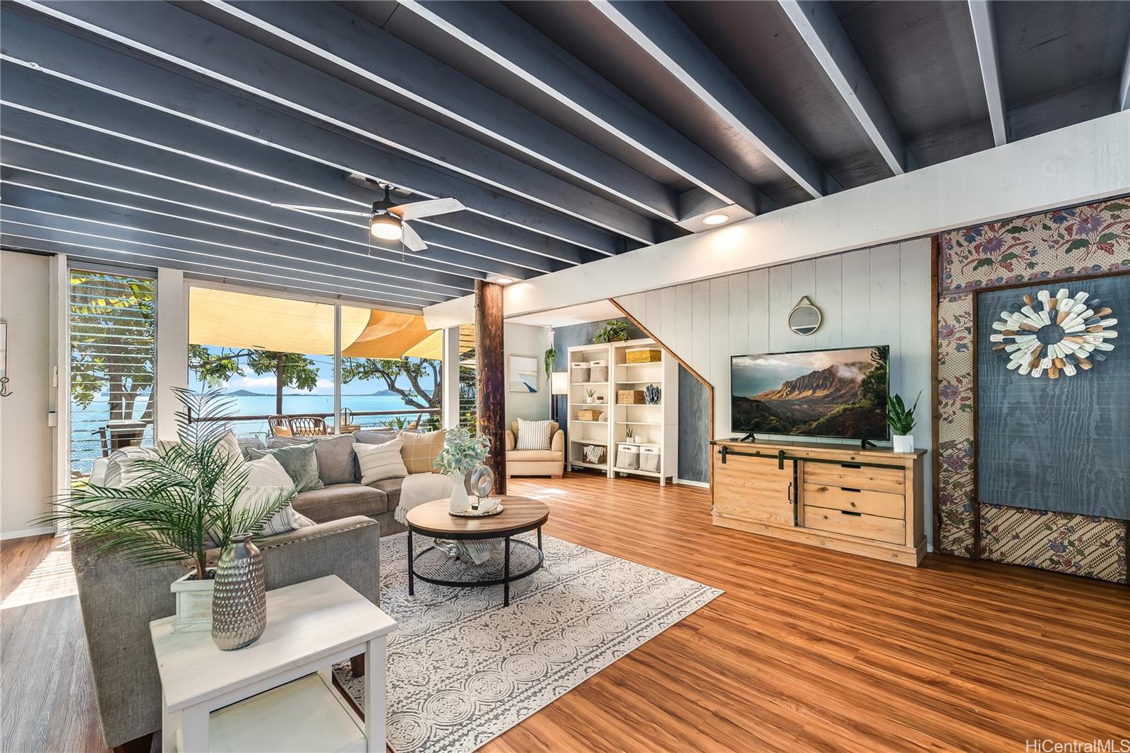 [0] => Experience serene waterfront living in Kahaluu! This spacious 3,088 sq. ft. property offers 3 bedrooms and 3 bathrooms, blending peaceful country charm with the convenience of Kaneohe just minutes away. The main living area features 3 bedrooms, 2 bathrooms, vaulted ceilings, and an open layout showcasing stunning views of Kaneohe Bay. Set on a lush 1/3-acre lot, you’ll find banana, and lime trees, garden spaces, beds of manicured tropical plants, and a covered cooking area with two gas grills. Enjoy breathtaking sunrises from the covered deck overlooking the bay, then fish, kayak (3 included), or boat straight from your backyard. Designed for comfort and sustainability, the home includes 46 Tesla solar panels, 3 Powerwall batteries, split A/C and window units throughout, a carport, and a massive garage/workshop fully equipped with tools and maintenance materials. The home is being sold furnished, and the seller is open to including his 20’ bay boat with the sale! Three attached studio spaces, each with a private entrance and wet bar, offer flexibility for guests, extended family, or creative use.