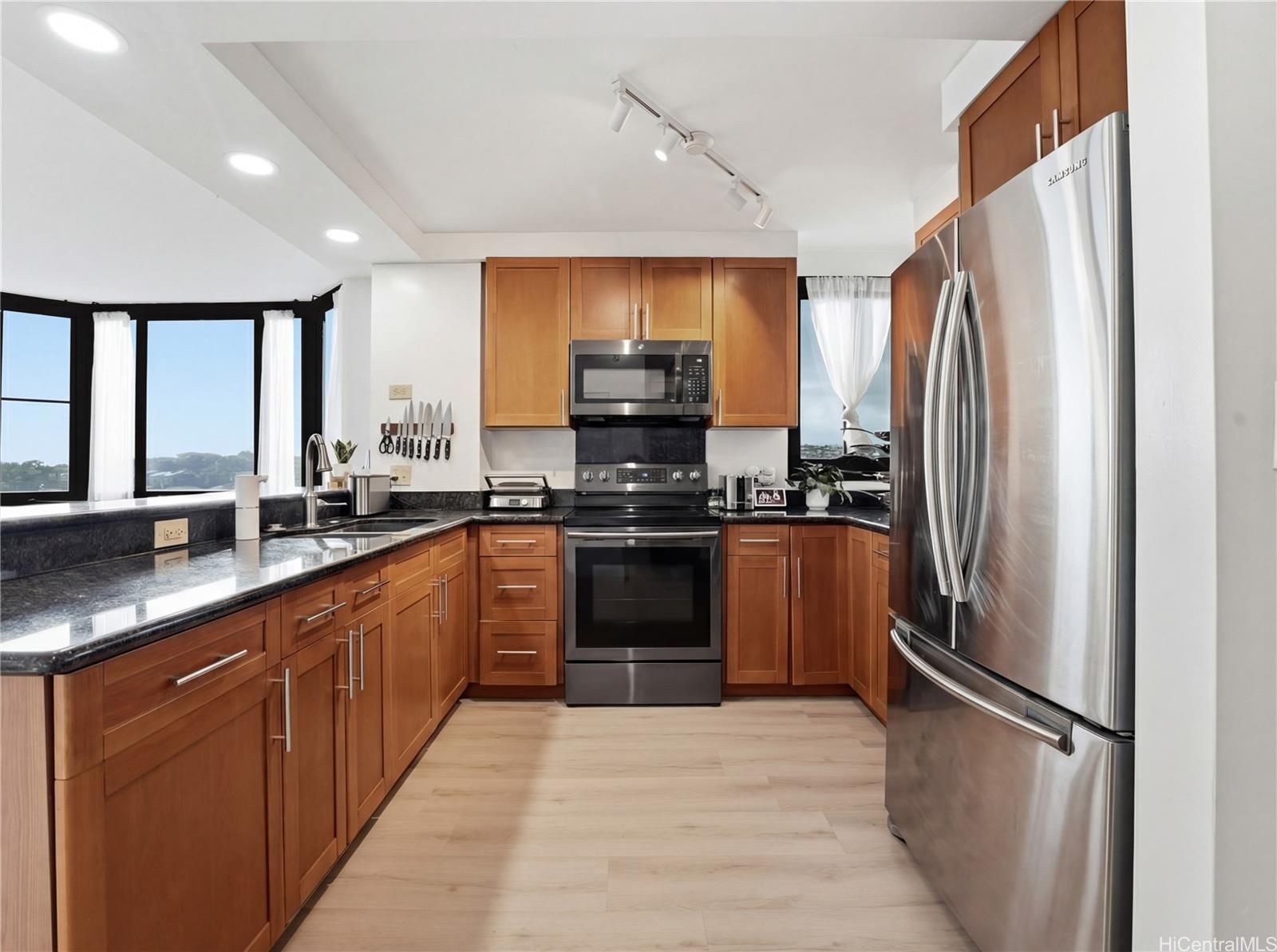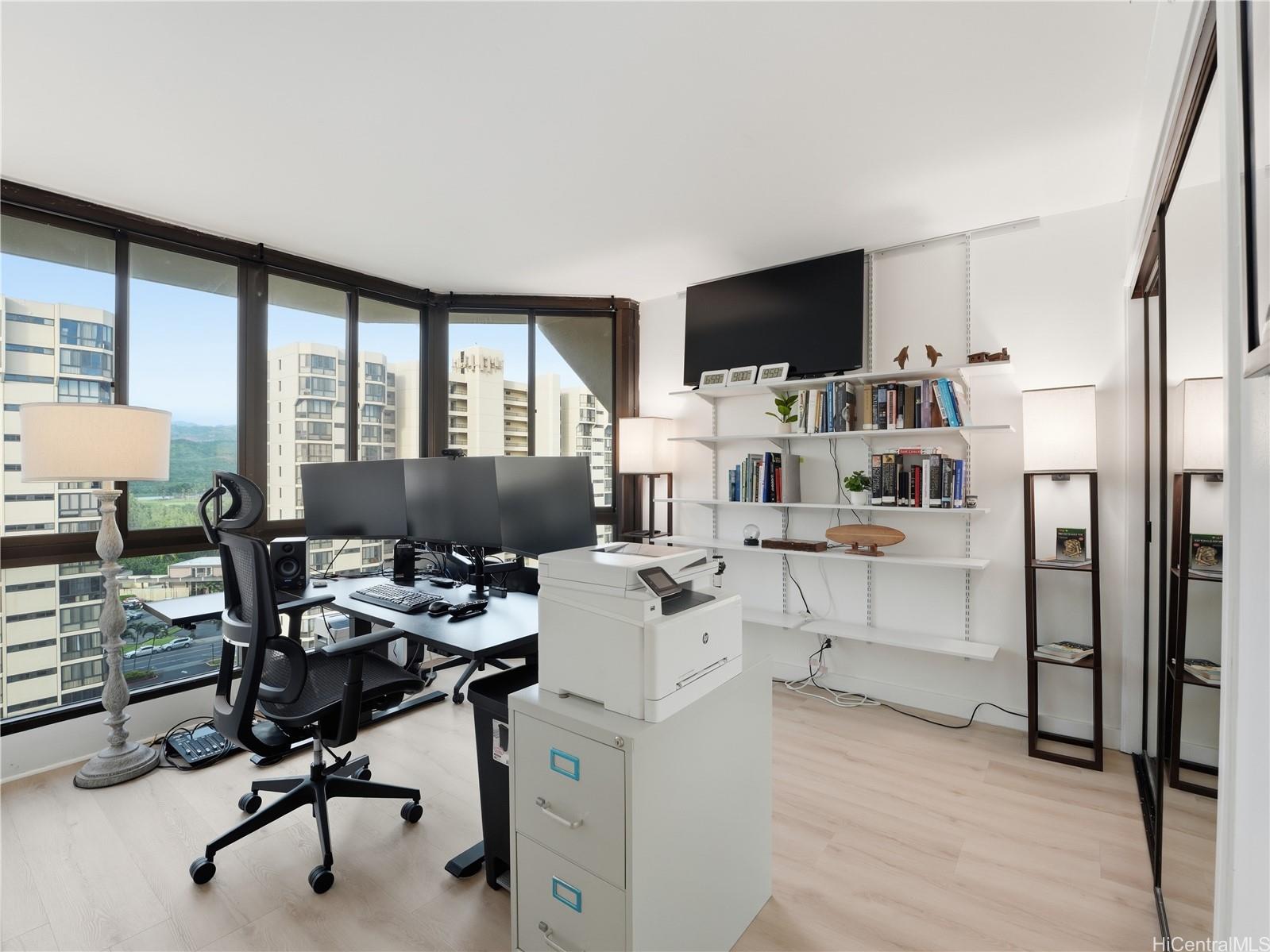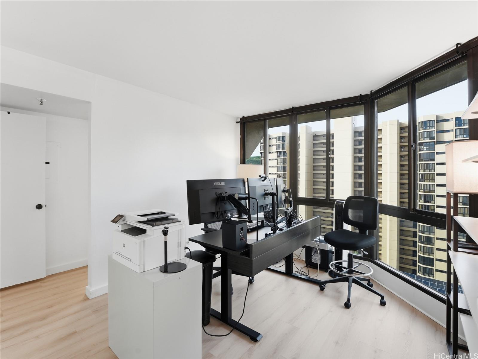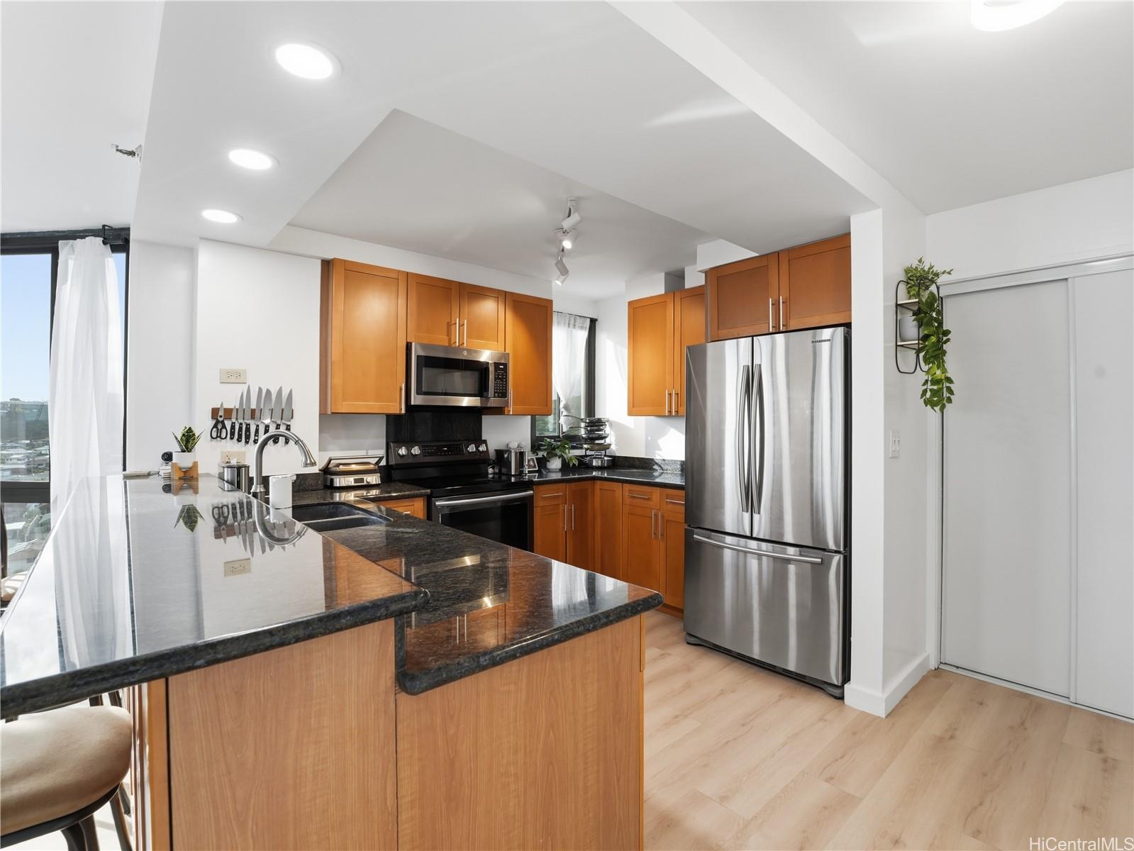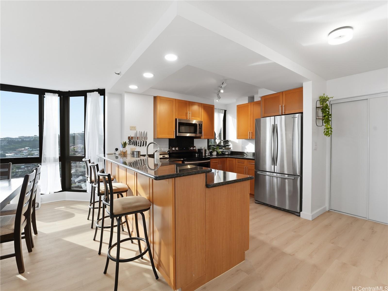 Welcome to this beautifully renovated 3-bed, 2-bath condo in the heart of Salt Lake! This spacious end-corner unit in the desirable South Tower of Country Club Plaza offers over 1,500 interior sq ft, which is larger than many single-family homes! Fully updated with a modern kitchen, renovated bathrooms, new luxury vinyl plank flooring, and fresh fixtures throughout. The high-floor location provides stunning views overlooking an open park with green spaces, dog park and playground. The large primary suite features open bay windows, a generous walk-in closet, and a private en-suite bath. Across the unit, two additional spacious bedrooms share a large full bath. Enjoy in-unit convenience with a newly upgraded washer/dryer combo. Includes 2 assigned parking stalls, one of which is the best in the building: a prime spot right next to the building walkway with no adjacent parking on one side for maximum convenience and ease! Embrace the resort-style amenities with private pool, spa, large covered BBQ area with outdoor patio, tennis courts, on-site security, and management office. Centrally located near Salt Lake Shopping Center, Downtown Honolulu, Fort Shafter, Pearl Harbor, and more. Listing by: Corcoran Pacific Properties (808) 778-4674