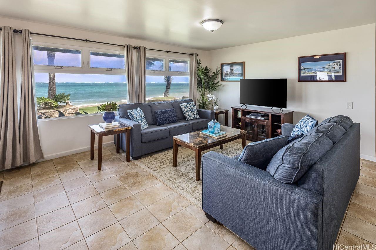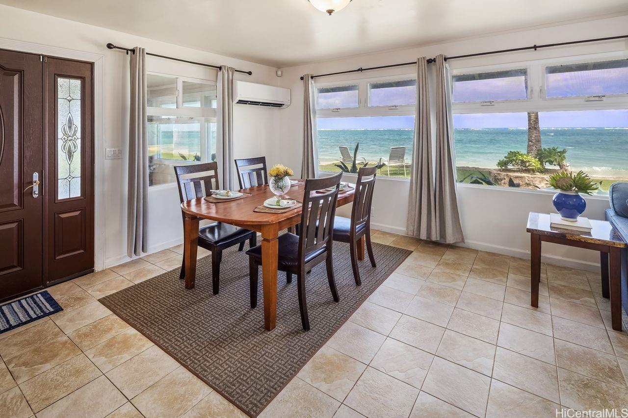 [0] => Experience the magic of Hawaii's true beachfront! Imagine watching the sun or the moon rising over the ocean from your dining room table. With an amazing 140 linear ft of beach frontage, you'll feel a connection with the sea & nature few people can even dream of. This single level floor plan makes for a perfect beach house with 5 bedrooms & 2 full baths in the main house & another full bath & laundry room off the lanai. Plenty of covered lanai area with a built-in dining table, counter space, sink & BBQ. Ample room for friends & family! 40 paid for photovoltaic panels on the advantageous NEW program, 80-gal solar HW heater system, grassy landscaped yard with sprinkler system, protected shoreline with attractive rock structure (5 steps down to the beach). There's also a ramp perfect for a small boat, kayak or other water toys. Less than 5 miles to Brigham Young University - Laie; 15 miles to epic surf at Sunset Beach; 12 miles to The Ritz-Carlton Hotel, Turtle Bay. Punaluu is one of Oahu's most coveted beachfront locations. The outer reef here creates much calmer near shore conditions. Great for low impact & safer water sports activities. Don't miss out!