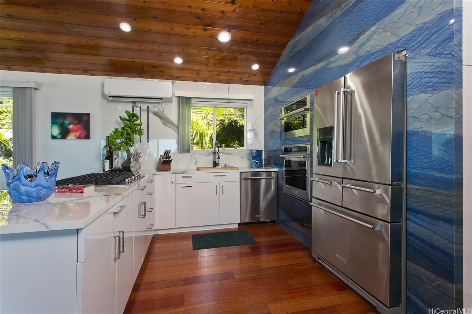 Every detail has been thoughtfully customized. This turn-key home features a resort-inspired backyard with outdoor kitchen and new furnishings, a spa-like primary suite with custom glass sinks, a soaking tub, and a walk-in shower overlooking the ocean. The kitchen showcases striking Azul Macaubas quartzite, inset appliances, and an open-concept design accented by Brazilian cherry floors, open-beam ceilings, and custom stone finishes.