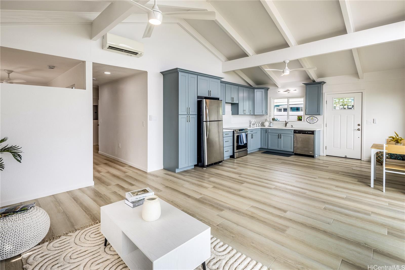 [0] => Enjoy island country living at its finest in this beautifully renovated oceanfront home located in the serene coastal community of Hau‘ula. This 2-bedroom, 2- bathroom home, with a separate office, offers a relaxed island style feel. Step inside to find a bright and breezy open floor plan - ideal for entertaining or quiet seaside living. Large windows and sliding doors fill the home with natural light and cooling trade winds, framing unobstructed ocean views and breathtaking sunrises over the Pacific. The new renovations showcase fresh interiors with thoughtful details throughout, including a brand new kitchen, new luxury vinyl plank flooring, and a completely updated electrical system. The living and dining areas flow seamlessly onto a private oceanfront yard and deck - perfect for morning coffee or evening relaxation as the waves roll in. Experience the charm of this Hau'ula gem as it offers