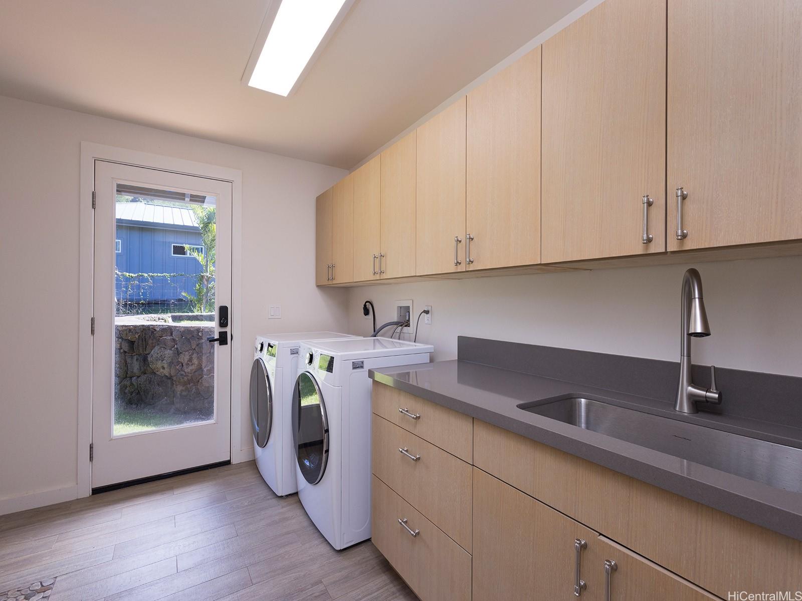 Welcome to Hale Laule'a. This custom-built North Shore Estate was designed by local architect Geoffrey Lewis and completed in 2021. This stunning ranch-style home is thoughtfully designed for island living. Features include vaulted ceilings, large windows, and an abundance of natural light that seamlessly connect the interior to the natural elements of the North Shore. The home offers open-air living with a covered lanai and expansive retractable glass and screen doors. Each of the three bedrooms is an en-suite, equipped with its own full bath. The home offers a versatile office or den off the main entry, ideally suited for a home office, guest room, or playroom, complete with an adjacent full bath for added convenience. The half bath is located off the main living area, ideal for guests and entertaining. Situated on over an acre of country-zoned land, this property includes mature tropical fruit trees and the ideal footprint for horse pasture and custom pool. A large rock wall lines Kamehameha Highway, automatic gate, and a turn-in point. The beach access is less than 500 feet from the driveway, offering you easy access to the world-famous beaches and surf of the North Shore. Listing by: Coldwell Banker Realty (808) 228-1045