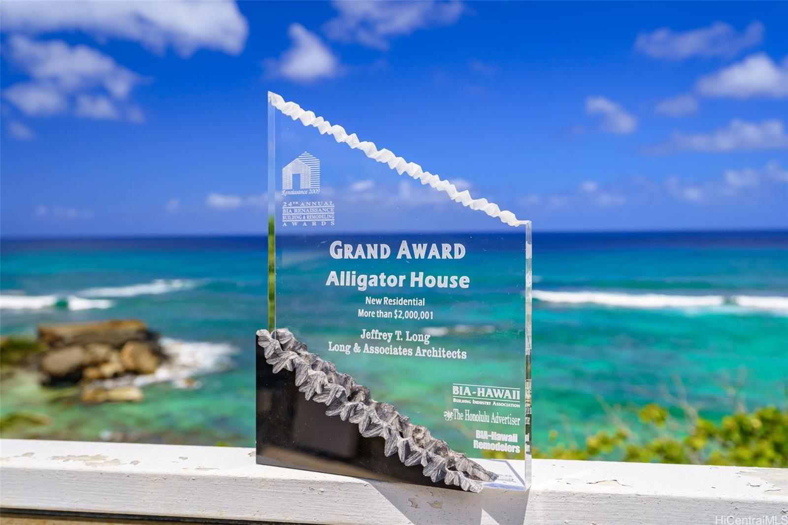 string(1208) "Welcome to the Alligator House! An AWARD-WINNING oceanfront masterpiece on Oahu’s legendary North Shore, designed by acclaimed architect Jeffery Long and honored with the ARCHITECTURAL GRAND AWARD for its stunning harmony with nature. This custom-designed 3-story beachfront residence offers 1,742 sqft of refined living space, featuring 2 bedrooms, 1.5 baths, a versatile bonus room to use as office/den, and luxury upgrades throughout including hardwood and tile flooring, central A/C, a gourmet kitchen with granite countertops, custom cabinetry, built-in wine cellar, and spa-inspired bath. Enjoy lanais on both levels, expansive decks, and a private rooftop with breathtaking views of Alligator Rock, one of Hawaii’s most iconic surf spots. Located just minutes from Haleiwa Town, Waimea Bay, Sharks Cove, Turtle Beach, and the Dole Plantation, this home places you at the heart of the North Shore lifestyle. Whether you’re seeking a tranquil retreat or a surfer’s paradise, this property offers a rare opportunity to own a slice of Hawaiian paradise. Recently appraised at $3.85M and sold As-Is. Live the dream. Watch the waves. Schedule your private showing. Homes like this won’t last long."