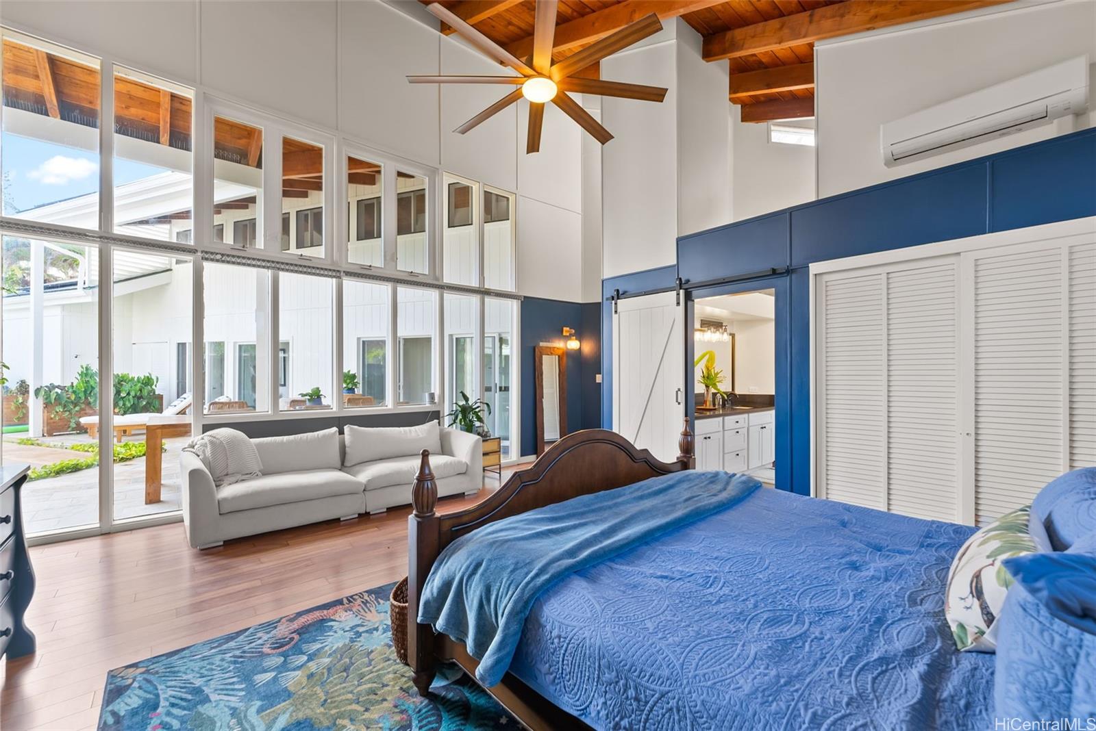 This architecturally striking home is nestled in the serene Kaimalino Neighborhood, situated in a tranquil cul-de-sac just steps from ocean access. Experience your personal oasis with a heated saltwater pool and spa in the courtyard. The property features a newly remodeled kitchen, split air conditioning, owned photovoltaic panels, and a fully-gated yard with an electric driveway gate, offering the Kailua beach lifestyle combined with luxury, convenience, and privacy. The home's artistic design is uniquely captivating, boasting walls of windows for enhanced views and natural light, along with vaulted ceilings and rich wood accents. The thoughtfully landscaped yard includes ample outdoor covered living space, perfect for poolside BBQs with friends after a day at the beach. Additionally, there's a bonus office space adjacent to the large family room, providing flexibility for personal use of this stunning home, along with a spacious storage unit above the garage.